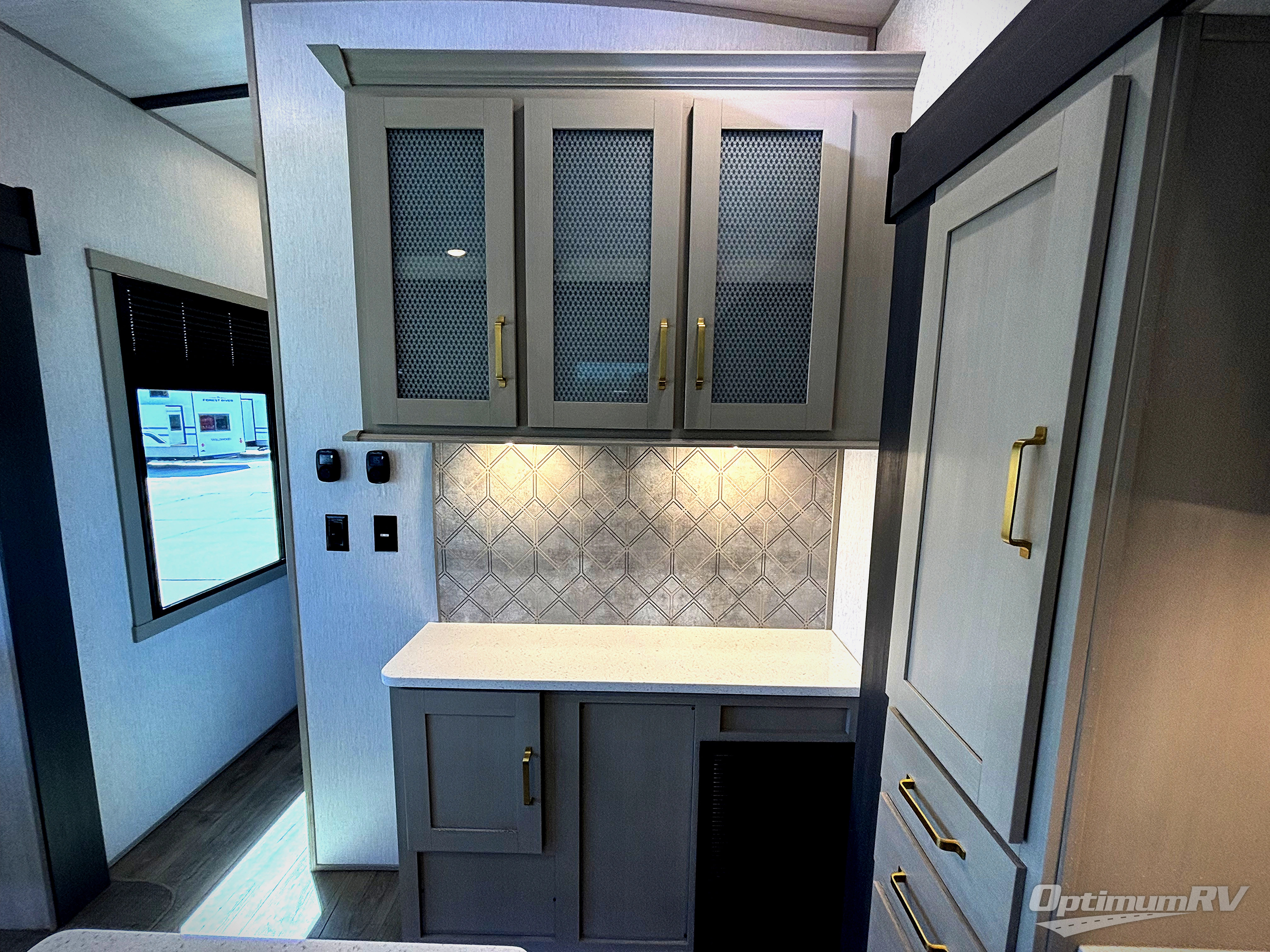 With any Wildwood Heritage Glen fifth wheel by Forest River, the quality construction, attention to detail and design along with a bright and welcoming interior allows you to relax in comfort with conveniences while exploring outdoors. The European Oak colored horizontal plank linoleum flooring is unique, beautiful and durable, and there are gold-accented faucets with stainless steel sinks in the bathrooms for added luxury. The Accessibelly underbelly with 12V tank heaters will help protect your unit from the elements, and the power stabilizer jacks and landing gear will make set-up a breeze. More features that provide convenience include the high-end solid surface countertops, an RV Airflow System that provides at least 25% better airflow, an automotive grade painted front cap with a gel coat, and solar prep for off-grid capabilities.