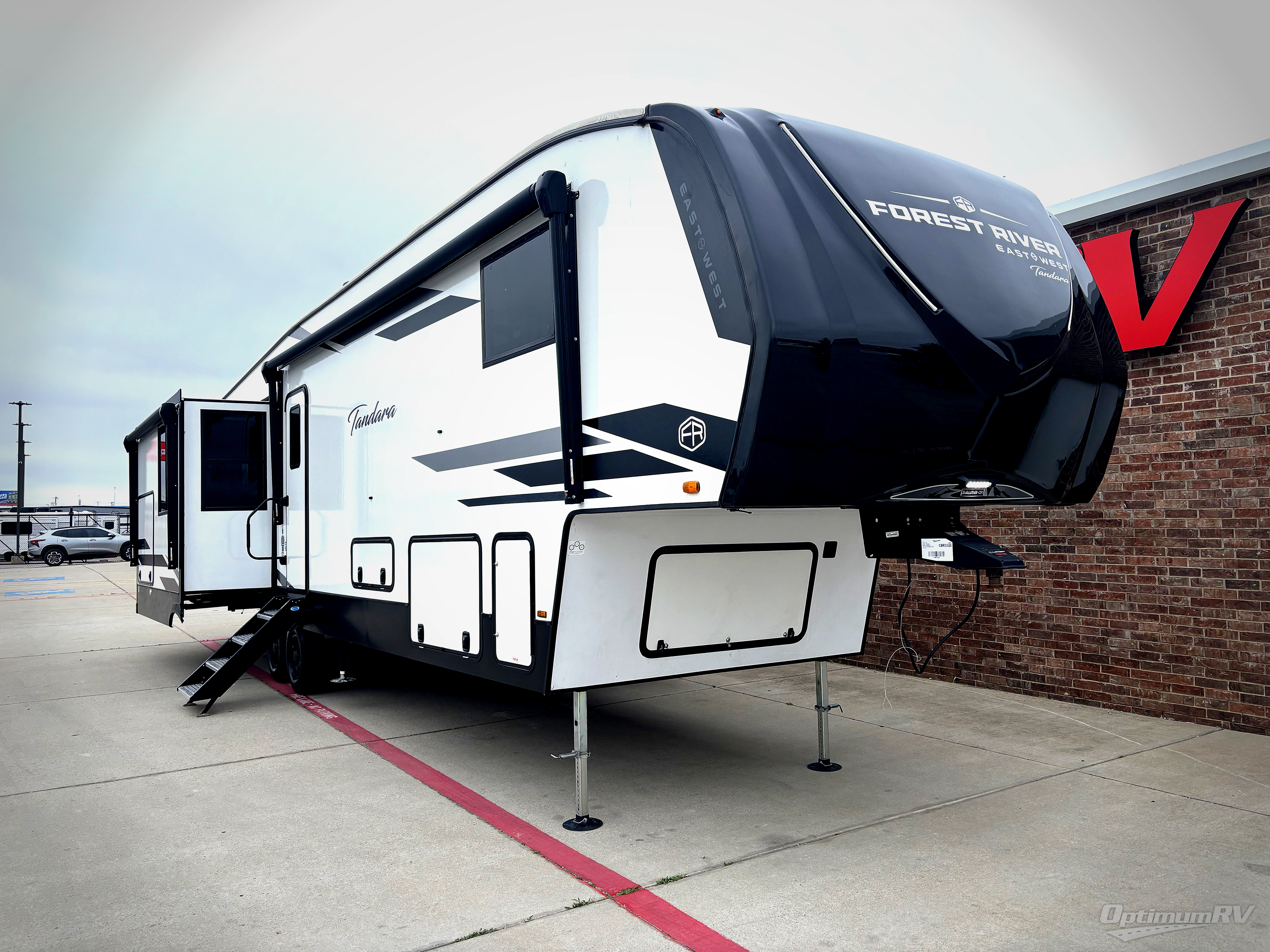 With any Tandara fifth wheel by EAST TO WEST, you will enjoy many standard features to make each trip enjoyable. The Tandara Luxury Package includes a universal all-in-one docking station, a 60k BTU on-demand tankless water heater, a 50" LED Smart TV, plus more depending on the model you choose. You will also appreciate the Tandara Extended Season Package with ductless flooring, dual attic vents, plus a heated, insulated and enclosed underbelly for added protection. Each model features Alphaply TPO roofing and a slick gel coated fiberglass exterior, and the Tandara Towing Package will make each journey smooth. Head inside to find LED lighting, ball bearing full extension drawer guides, oversized underbed storage, and and many more comforts!