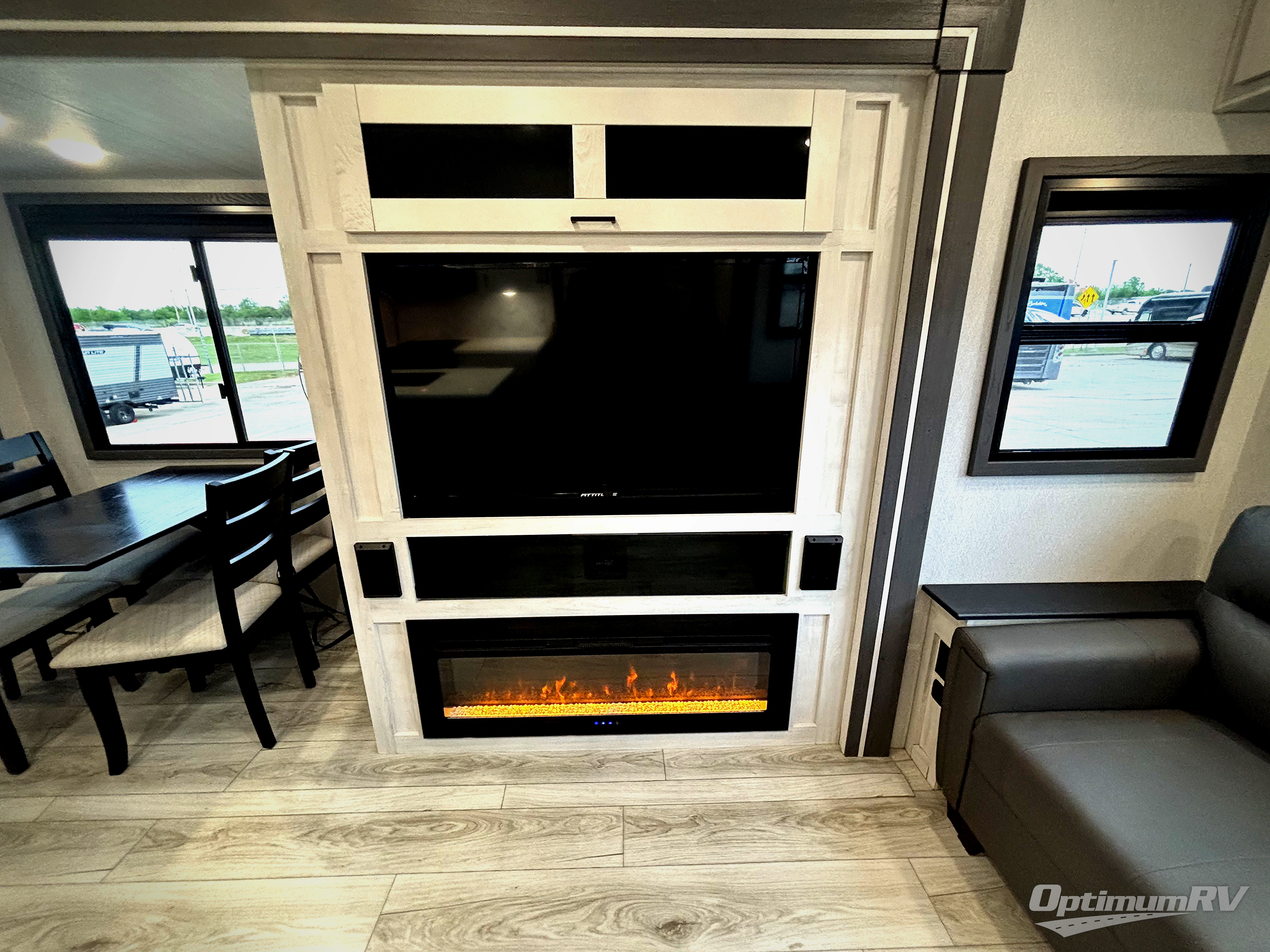 There is so much to fall in love with on this Tandara fifth wheel! From the front master suite with a full-width wardrobe and king bed slide to the spacious living area with opposing slides, theater seating, and a hide-a-bed sofa, there is quite a lot of comfort and convenience. The central bunkhouse comes with a fold-down bunk, hide-a-bed sofa, desk, and closet so that your kids or your guests can have some added space to work or play, and the loft above the bunkhouse adds room for more campers to sleep. Everyone will benefit from the 50" LED TV and fireplace, and the 16 cu. ft. 12V refrigerator is going to provide you with plenty of space to store your fresh fruits and veggies.