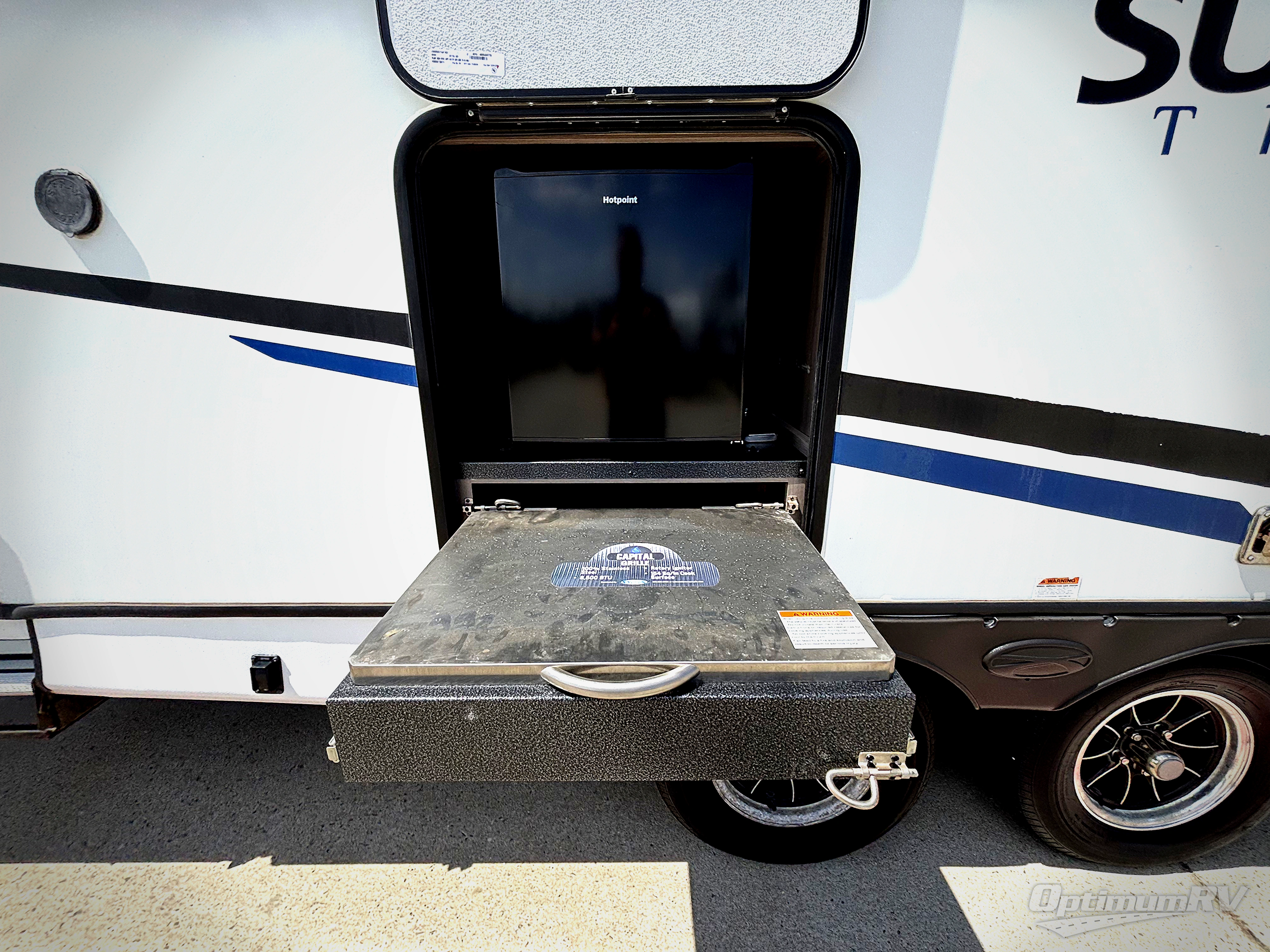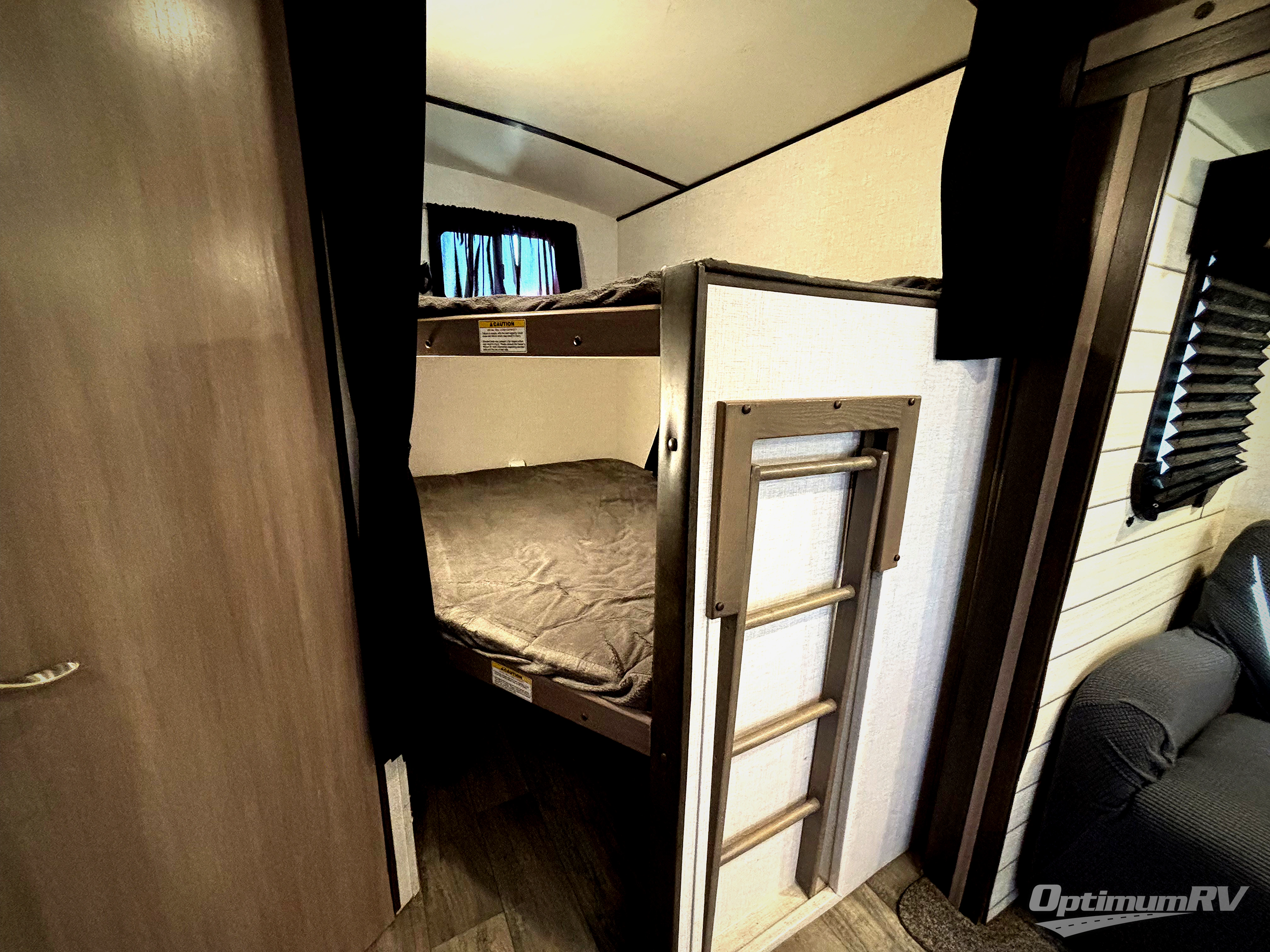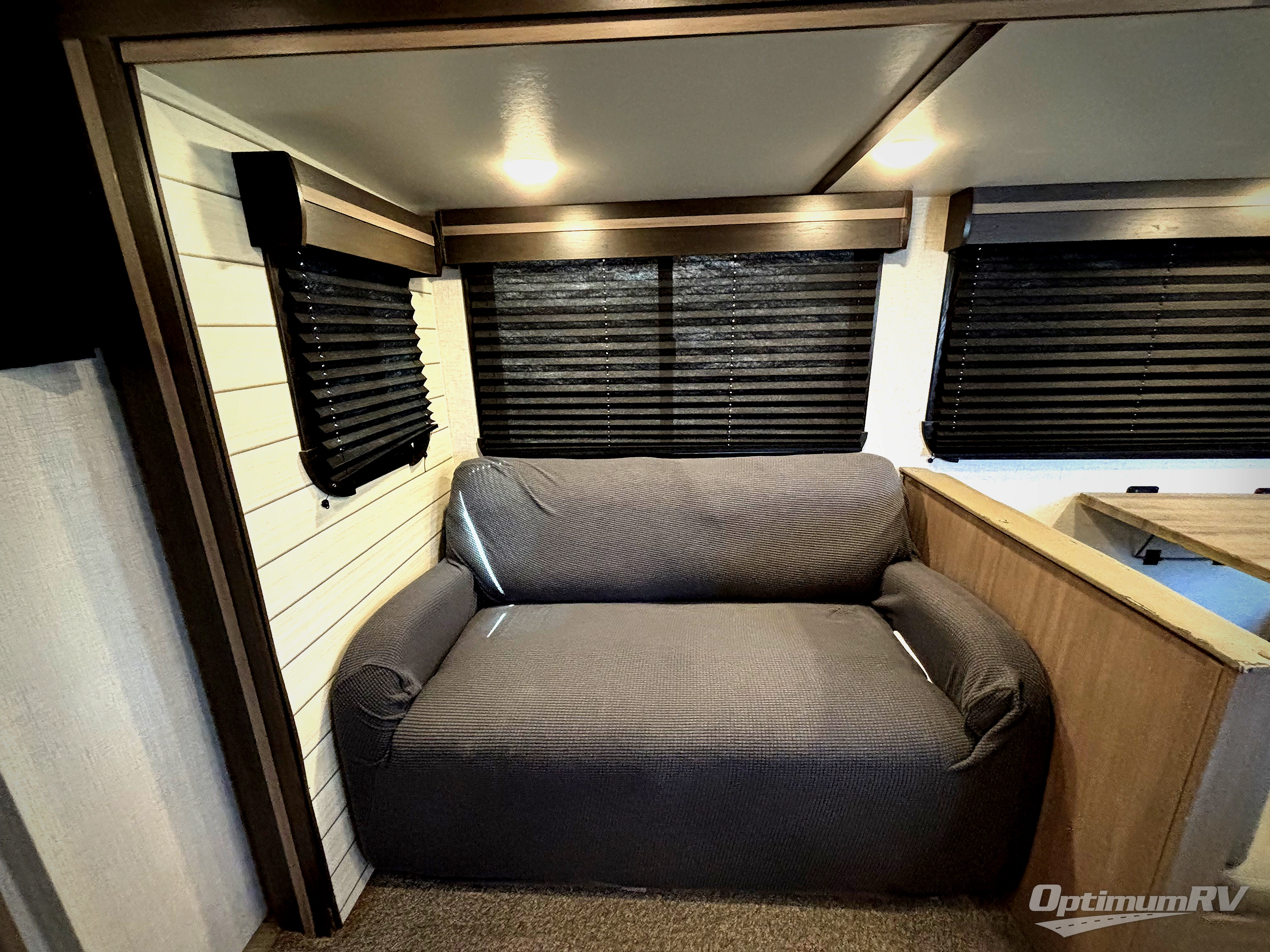 This travel trailer can comfortably sleep ten people each night, so invite the cousins for whole-family fun! The kids are sure to love the double-size bunks, and mom and dad will have their own private bedroom up front with a king bed. Within the large slide out you'll find the XL booth dinette which can sleep two, plus the tri-fold sofa that can be replaced by an optional theater seating if you choose. Whip up dinner in a flash on the glass top range or use the exterior camp kitchen. The full bath includes its own exterior entrance door for convenience, and there is a power awning with LED lights for the perfect outdoor living space!