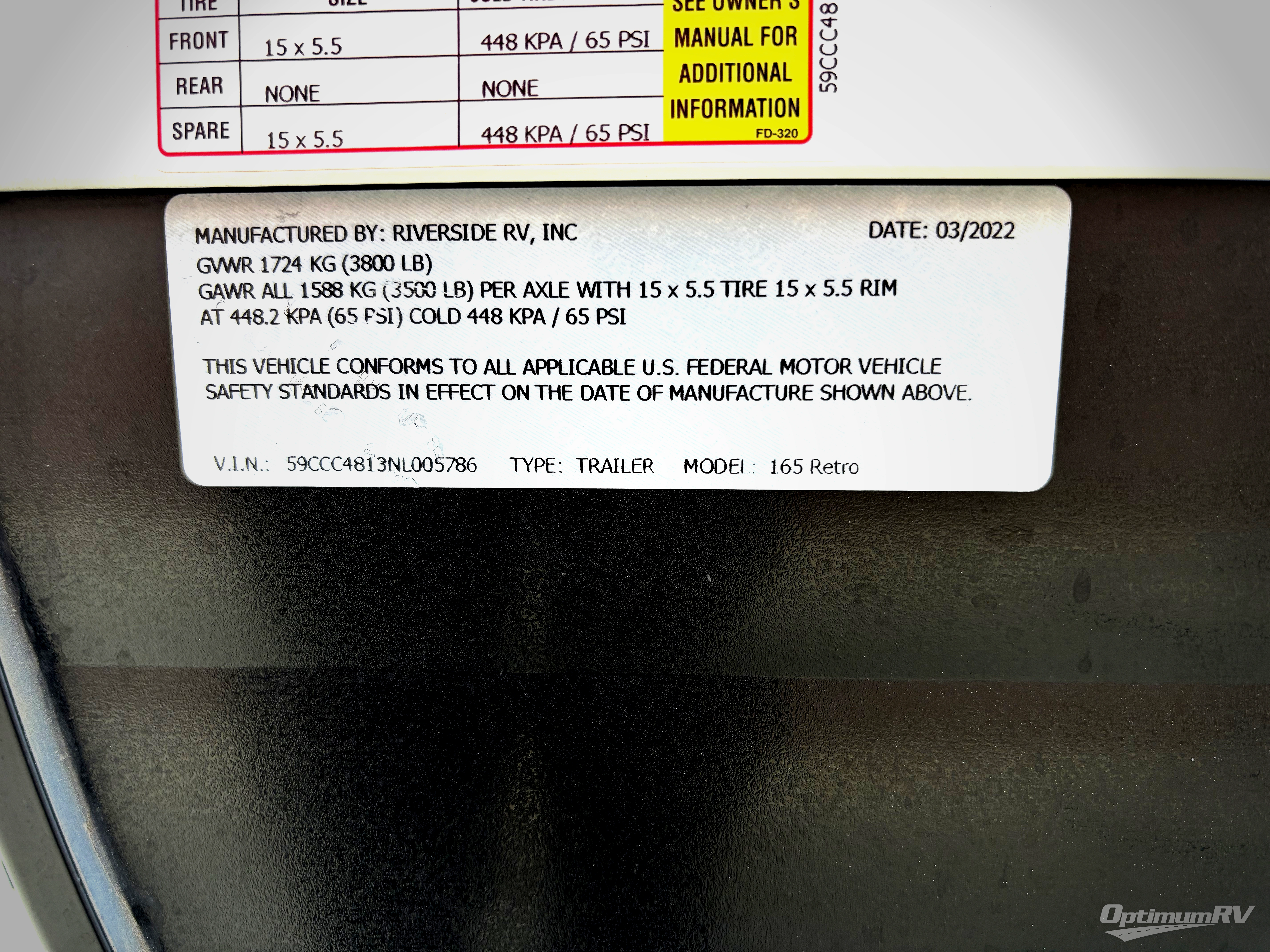 Each Retro travel trailer by Riverside RV will take you back in time with its vintage look, but will still impress you with its modern comforts. The double welded all-aluminum cage and powder coated chassis provide durability, along with the PVC roof membrane and diamond plate rock guard. You'll enjoy indoor and outdoor speakers, USB ports for your electronics, plus an AM/FM/Bluetooth stereo to play your favorite tunes. Each model also includes front and rear stabilizer jacks, electric brakes, a high speed roof vent, plus a 13,500 A/C to keep you cool during the hot summer camping months.
