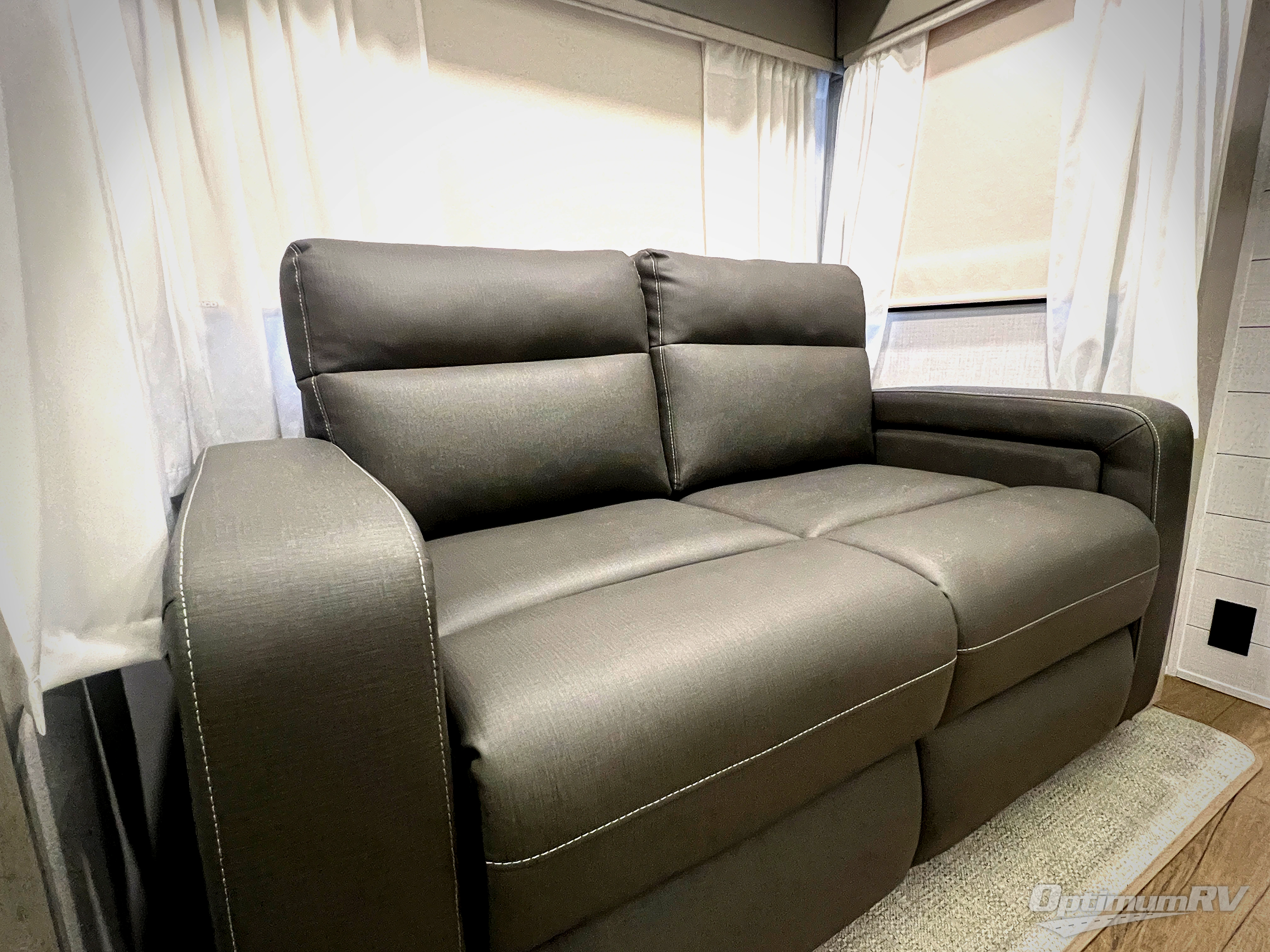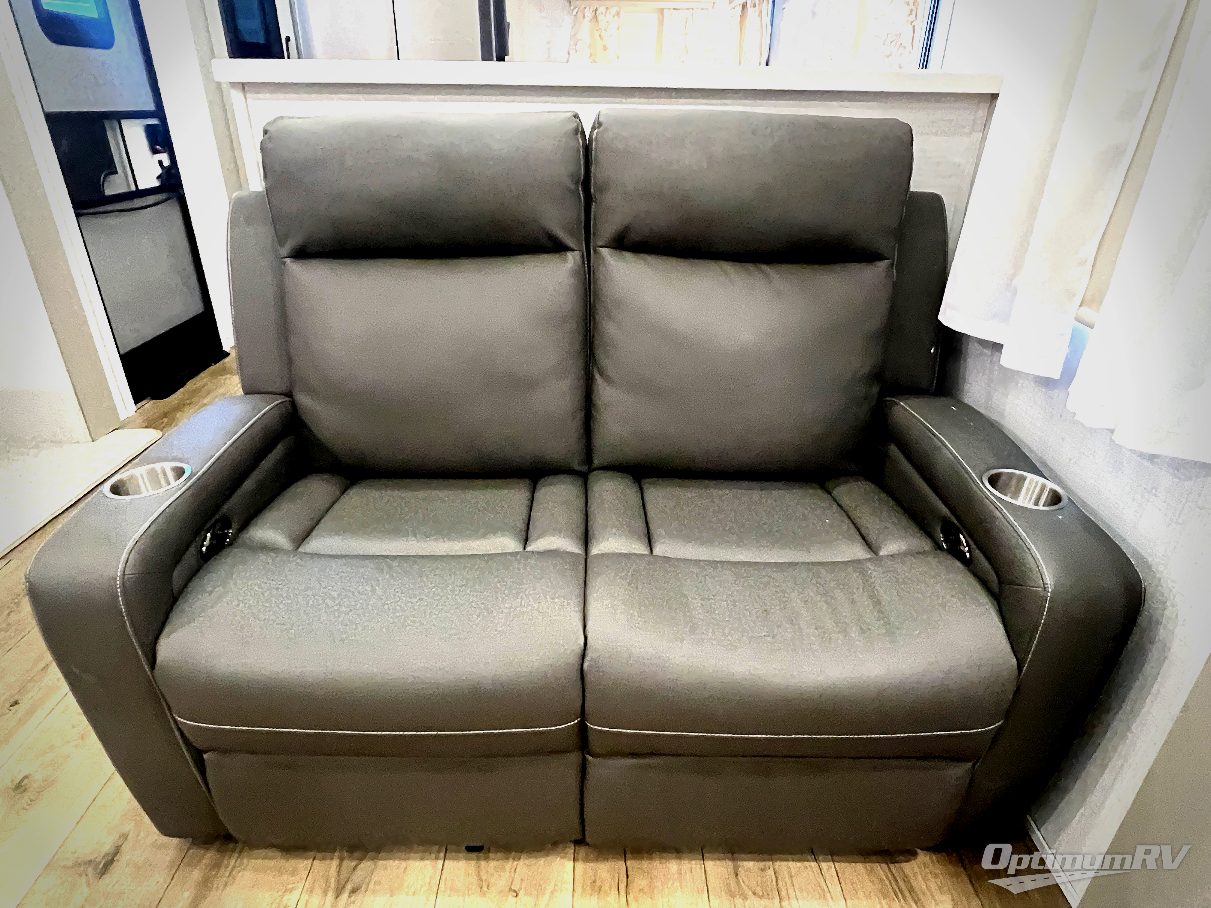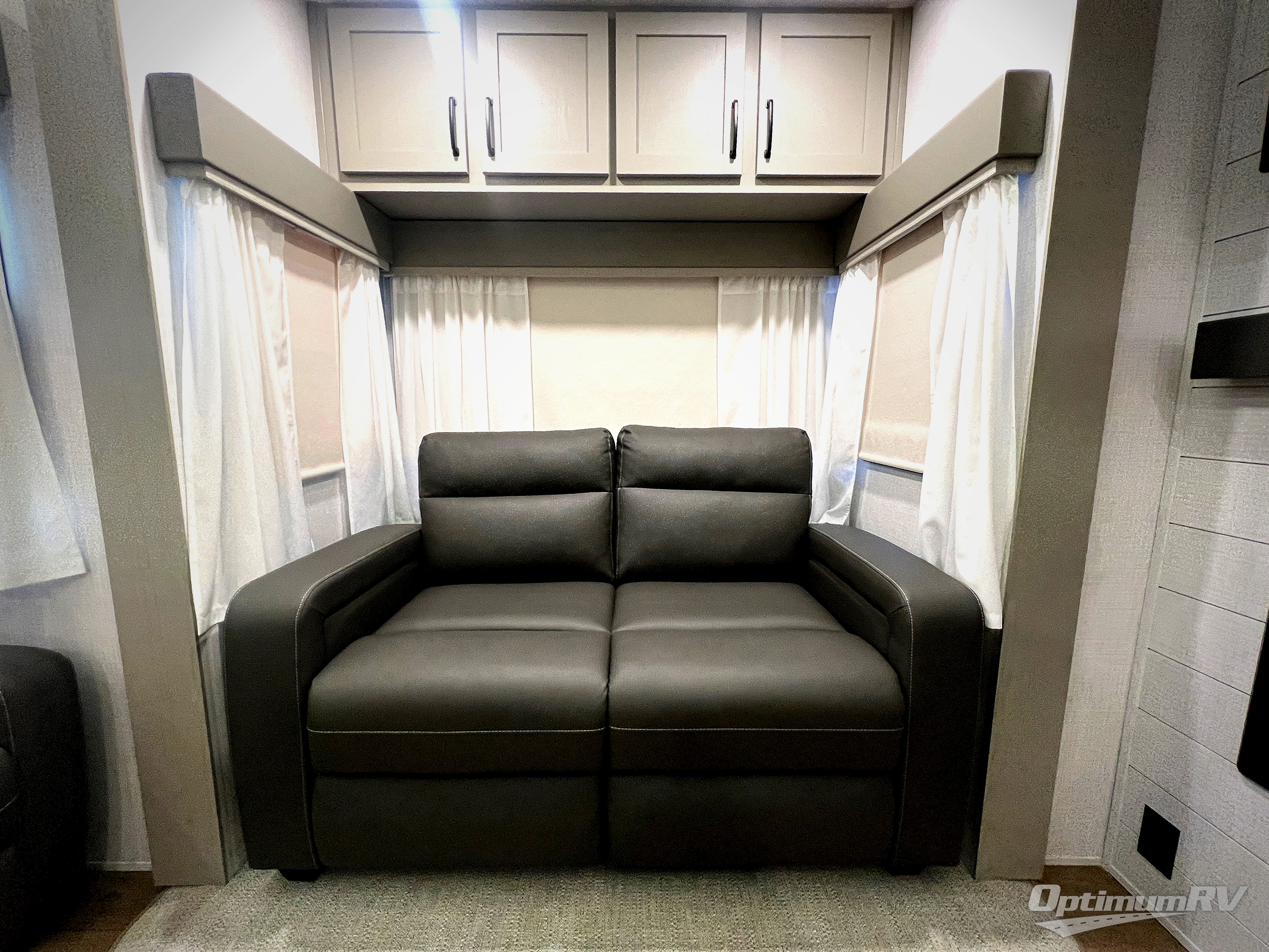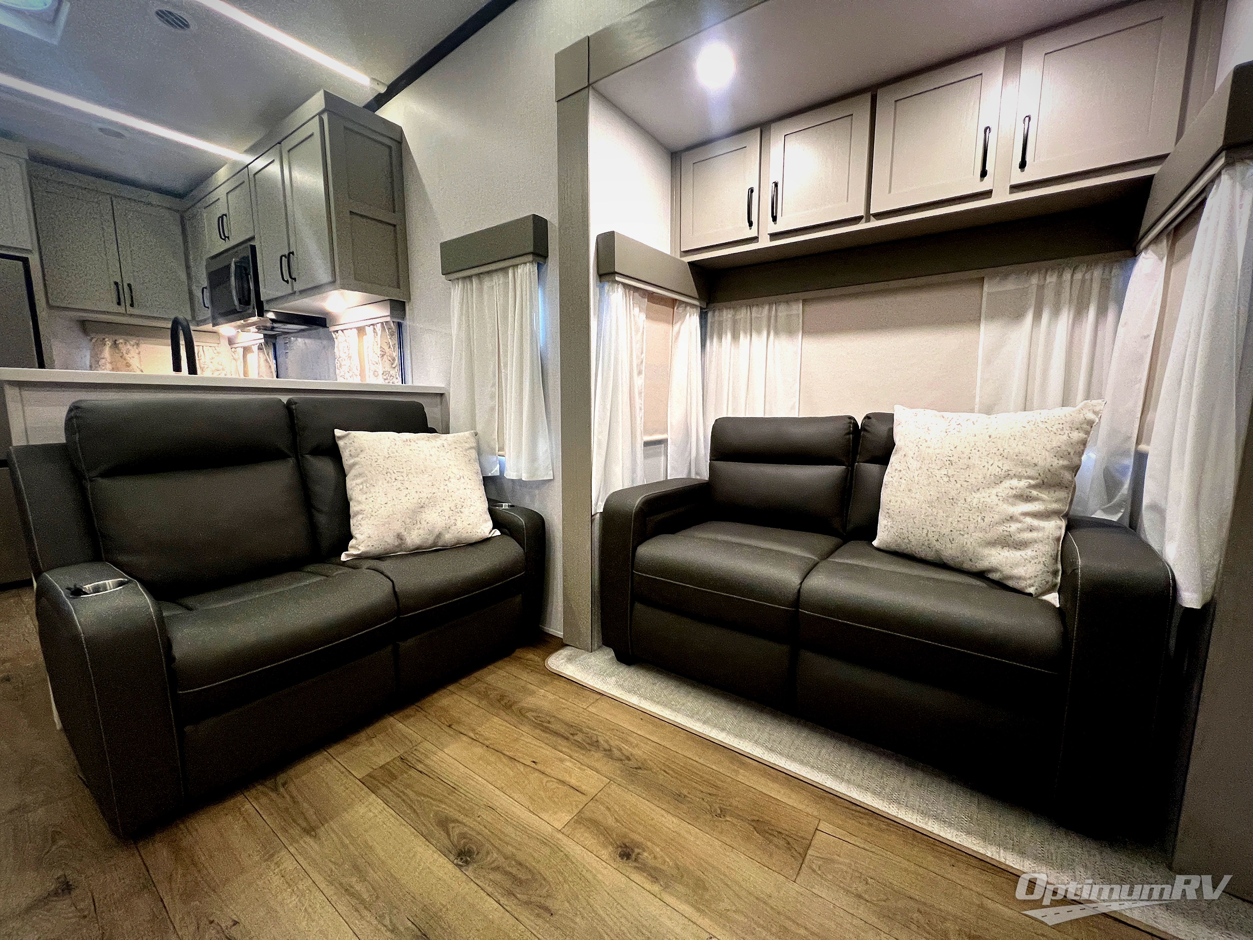 You won't believe all that this fifth wheel has to offer! Starting with the rear kitchen which has plenty of countertop space to prepare your delicious meals, a four burner cooktop with a stainless steel 24" oven to cook them, and a large single bowl stainless steel sink for easy clean up. The living area has opposing sofas and a theater seat with USB charging and storage across from an entertainment center with 50" Smart TV. The half bathroom is close to the living area so you can get back to watching your movie faster. You will feel right at home sleeping in the master suite on a slide out king bed across from a dresser and hamper to keep your space tidy, plus entrance into the front full bathroom. Inside the bathroom, you will find a vanity with dual sinks for two to get ready at once, a spacious shower with a seat, and a walk-in closet for clothes, shoes, and more!