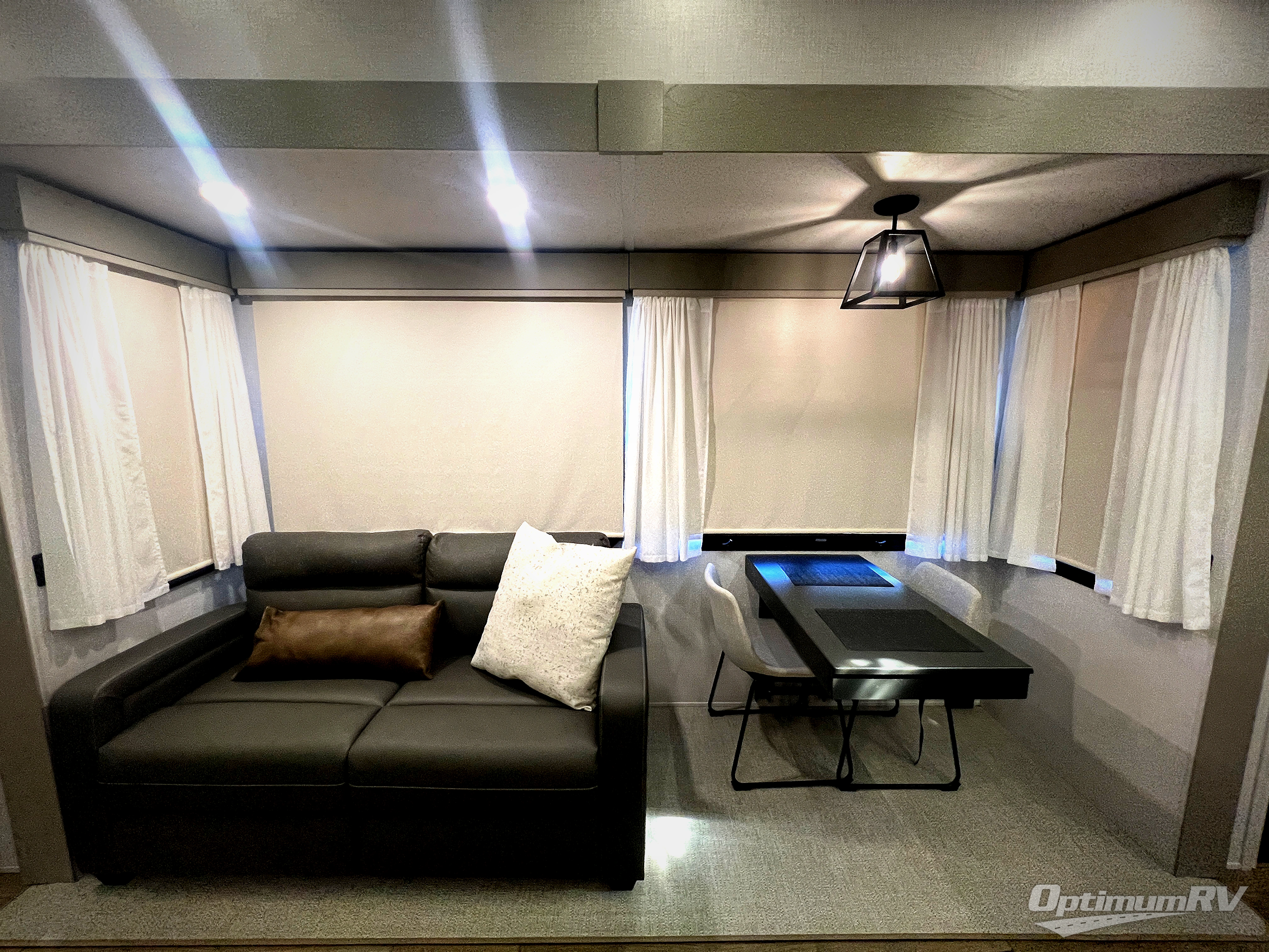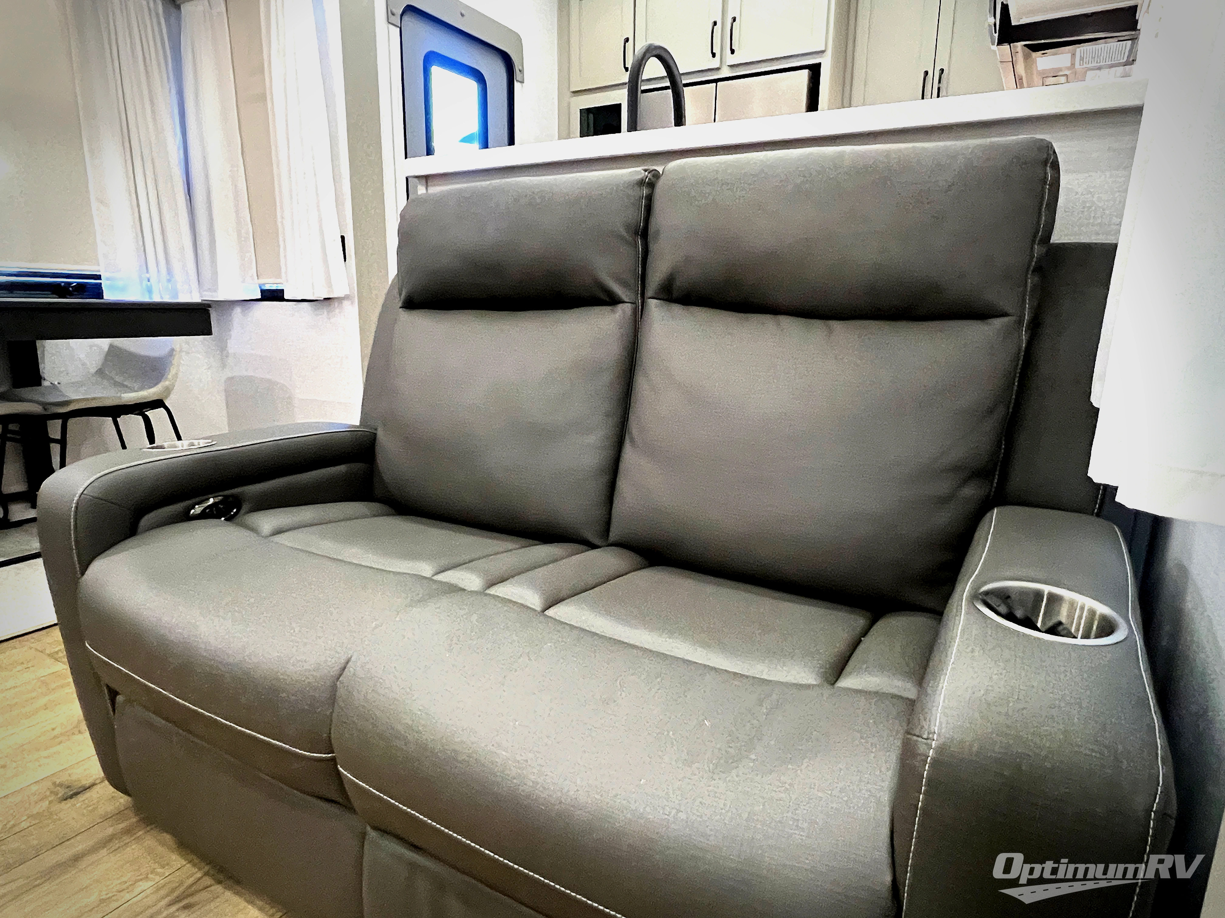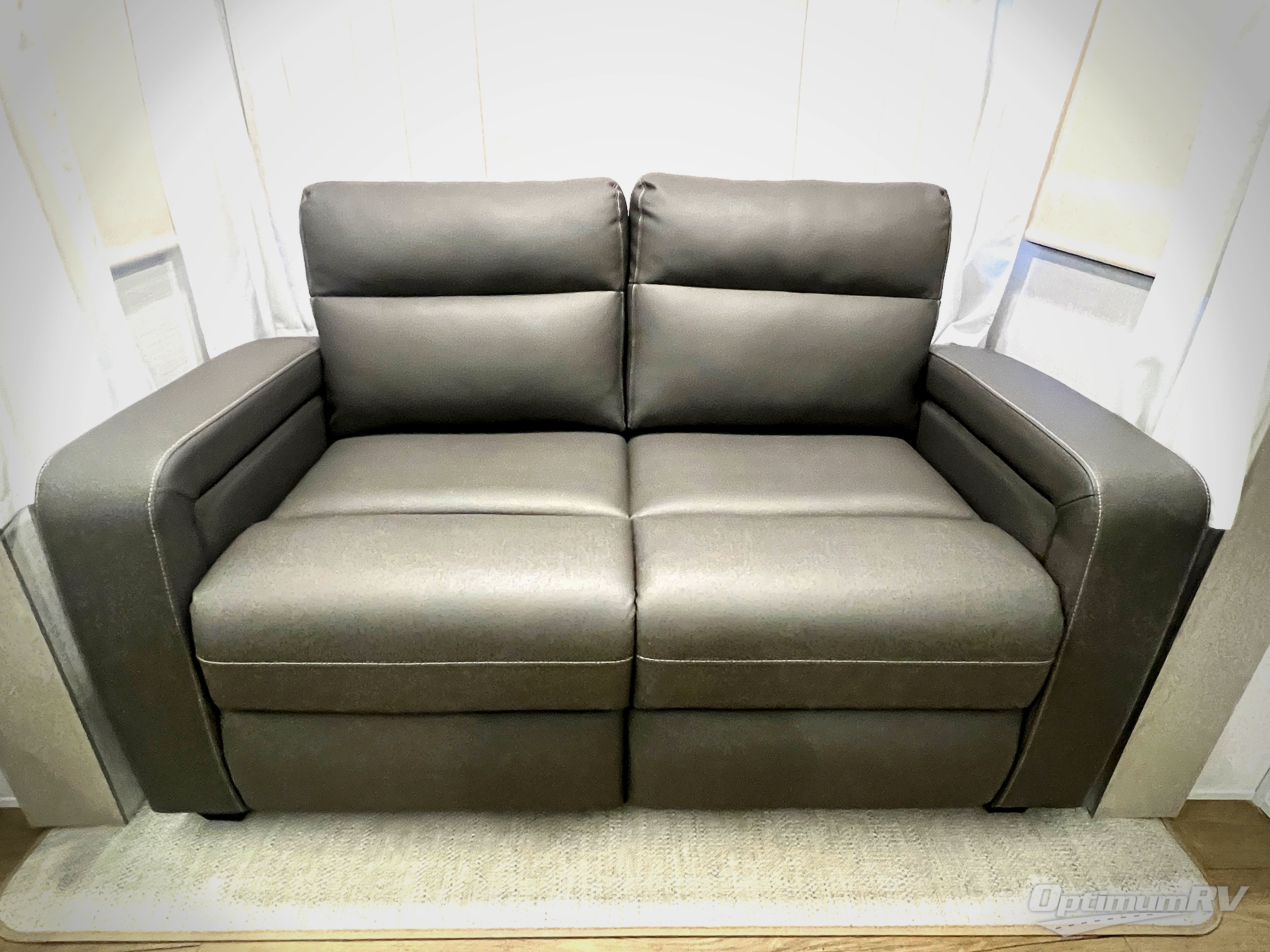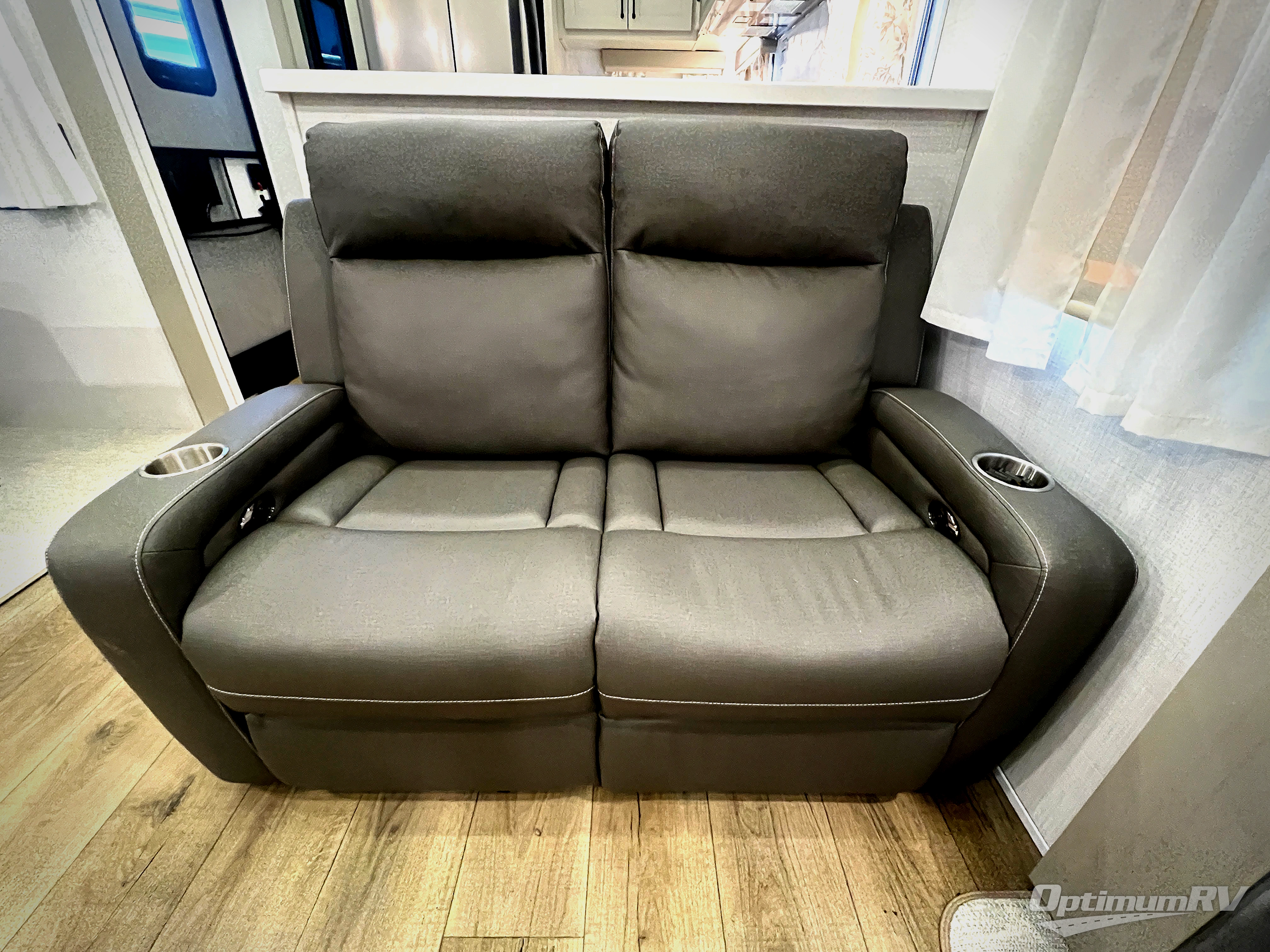 You won't believe all that this fifth wheel has to offer! Starting with the rear kitchen which has plenty of countertop space to prepare your delicious meals, a four burner cooktop with a stainless steel 24" oven to cook them, and a large single bowl stainless steel sink for easy clean up. The living area has opposing sofas and a theater seat with USB charging and storage across from an entertainment center with 50" Smart TV. The half bathroom is close to the living area so you can get back to watching your movie faster. You will feel right at home sleeping in the master suite on a slide out king bed across from a dresser and hamper to keep your space tidy, plus entrance into the front full bathroom. Inside the bathroom, you will find a vanity with dual sinks for two to get ready at once, a spacious shower with a seat, and a walk-in closet for clothes, shoes, and more!
