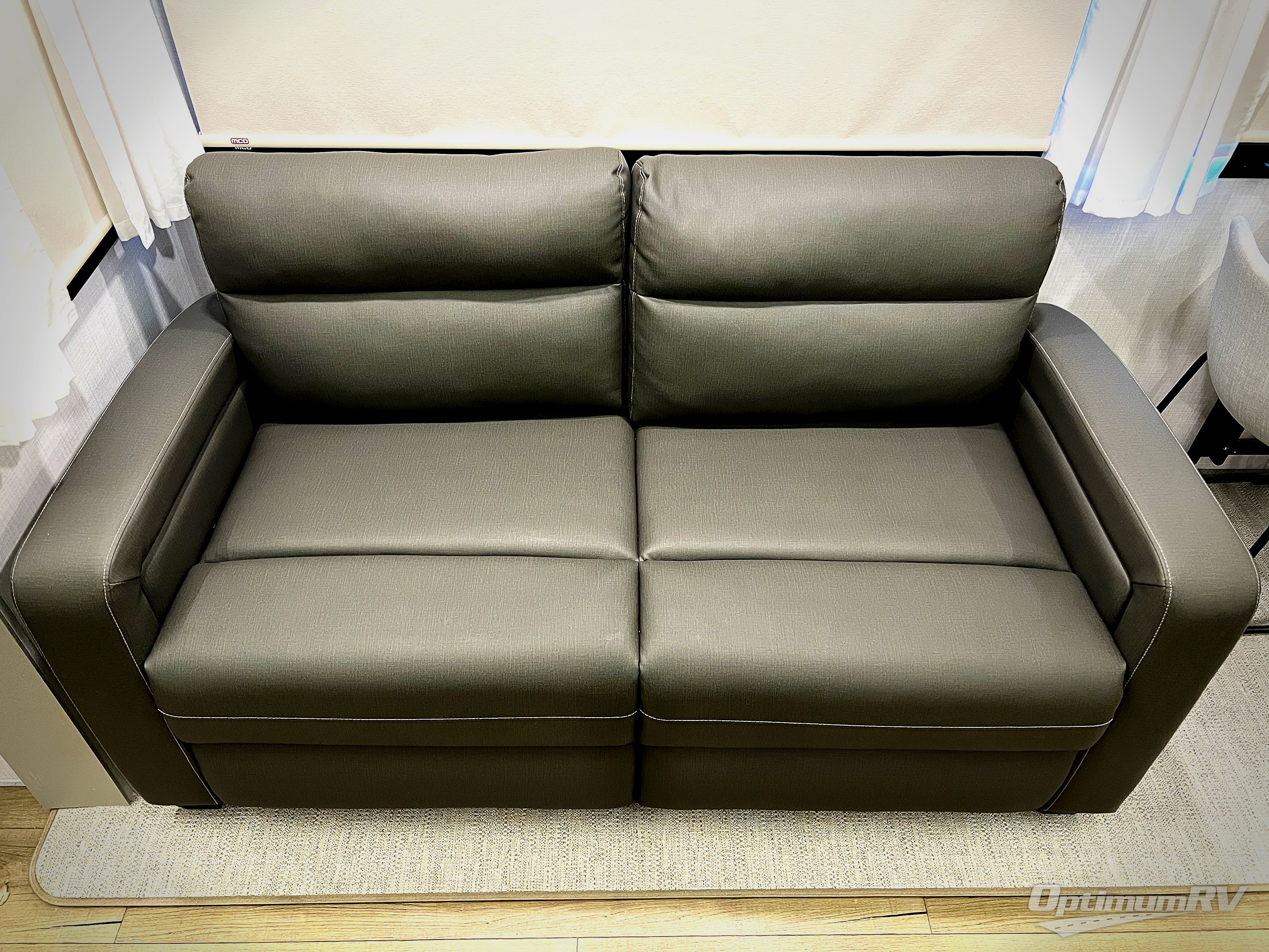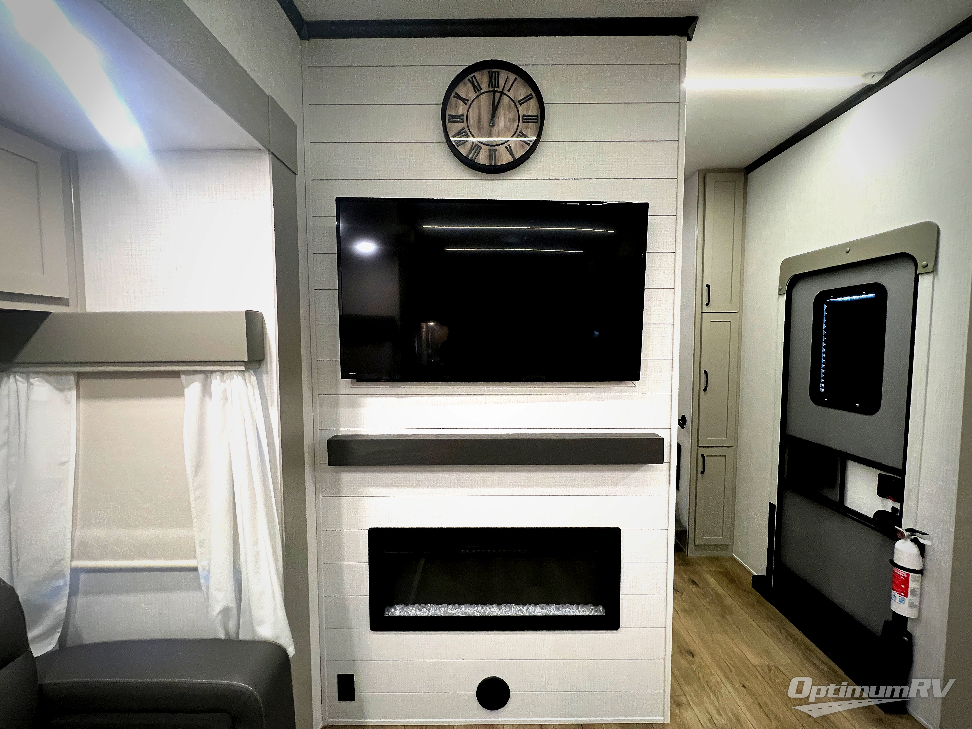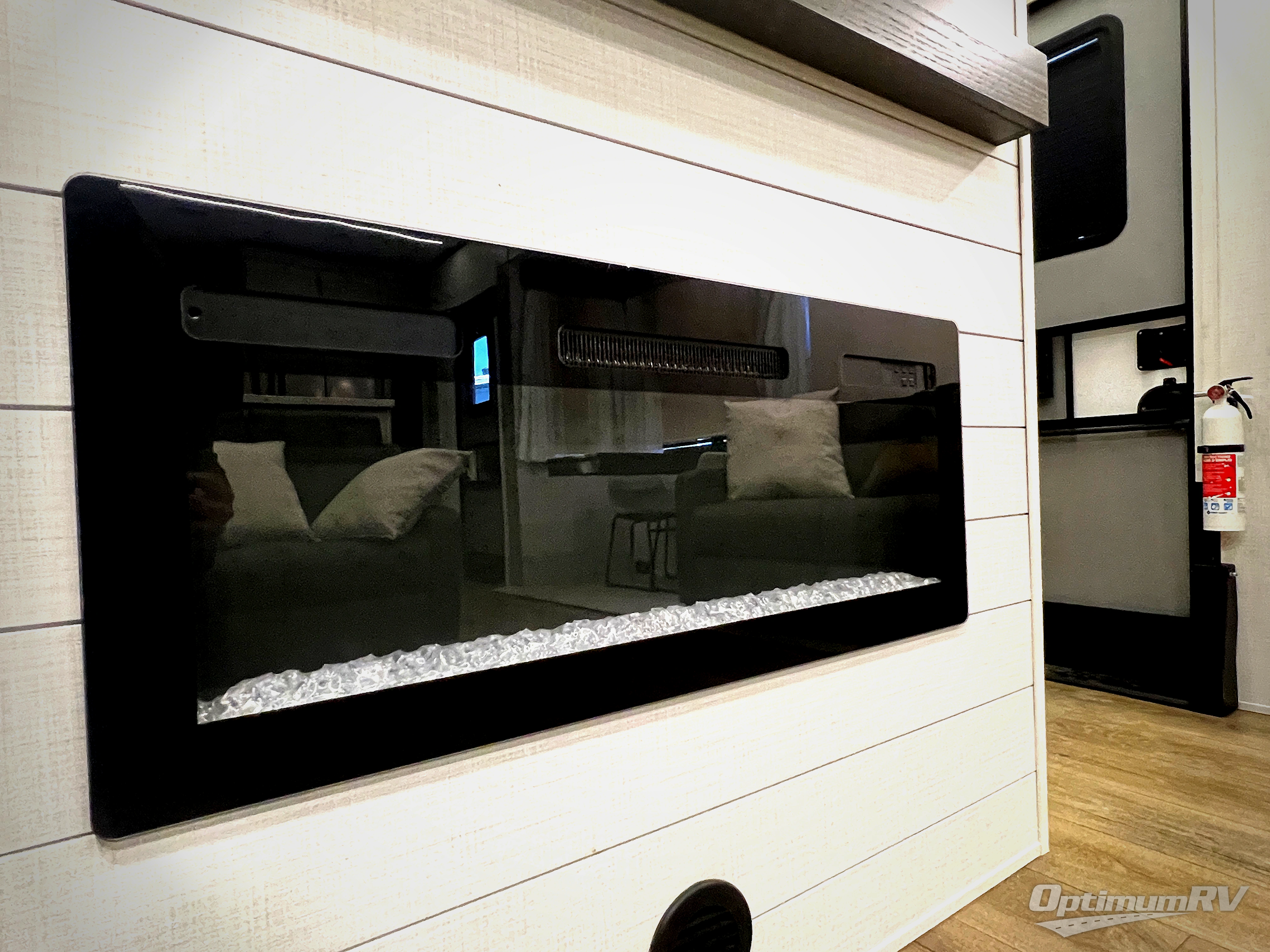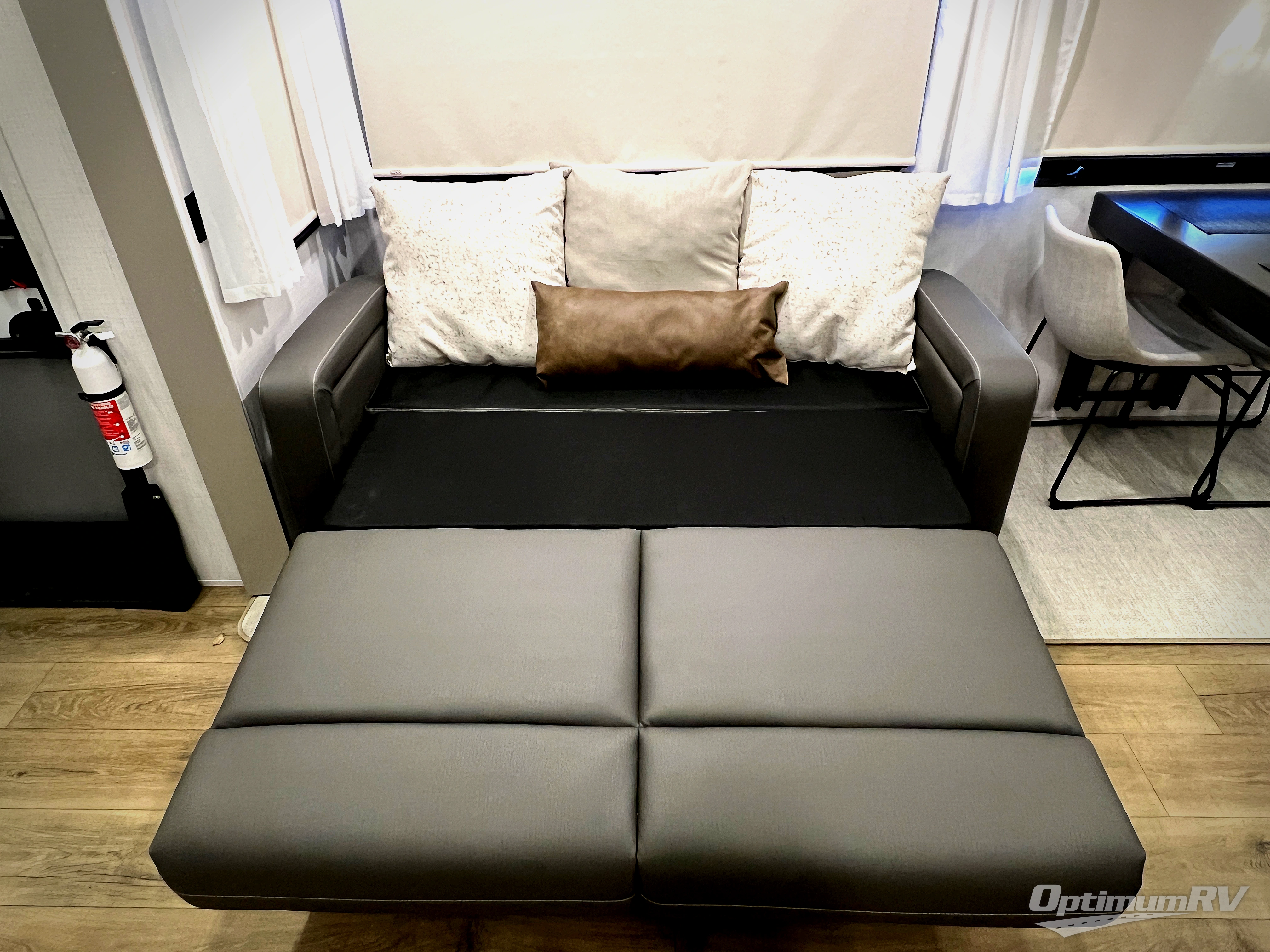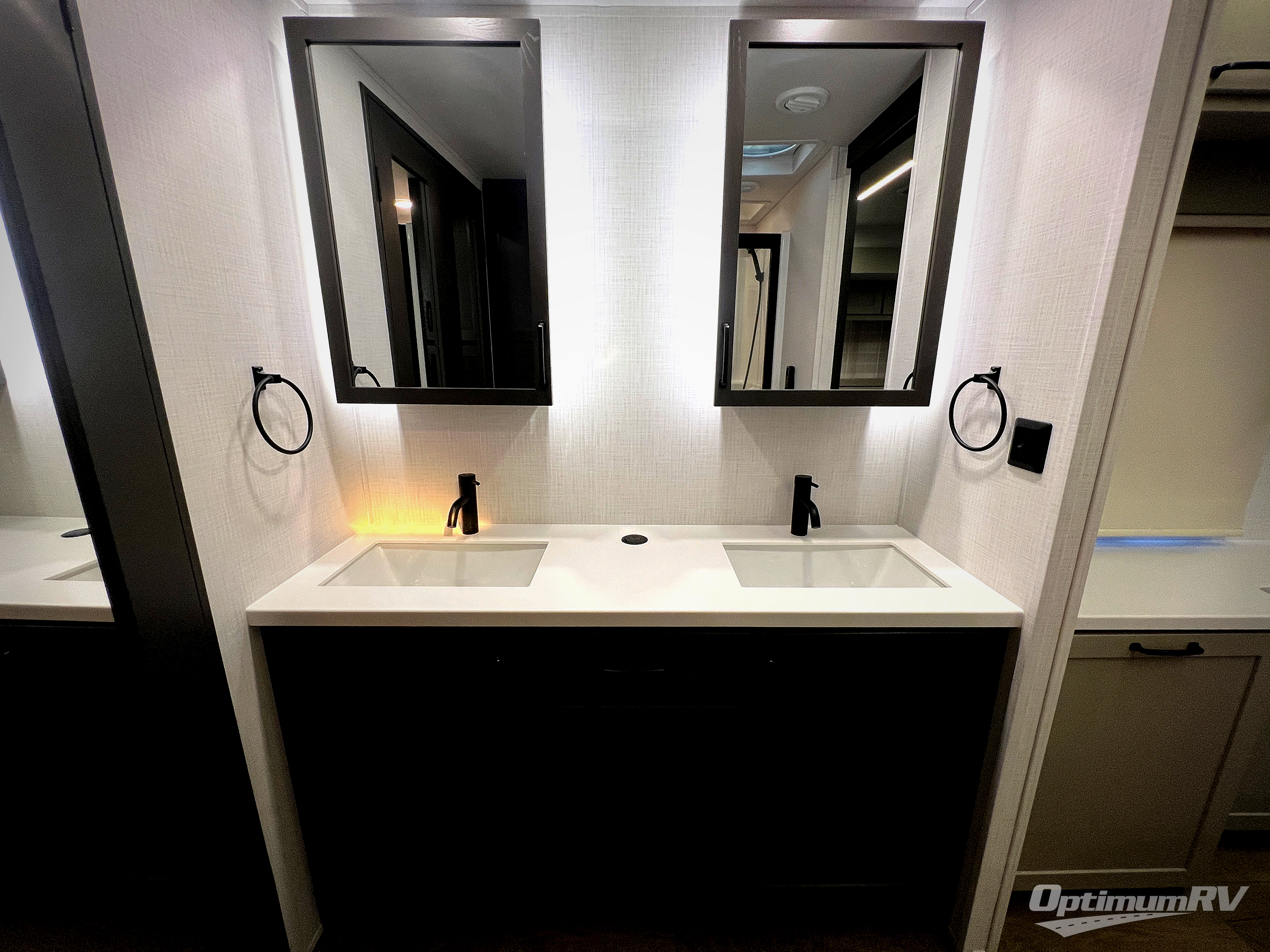 You won't believe all that this fifth wheel has to offer! Starting with the rear kitchen which has plenty of countertop space to prepare your delicious meals, a four burner cooktop with a stainless steel 24" oven to cook them, and a large single bowl stainless steel sink for easy clean up. The living area has opposing sofas and a theater seat with USB charging and storage across from an entertainment center with 50" Smart TV. The half bathroom is close to the living area so you can get back to watching your movie faster. You will feel right at home sleeping in the master suite on a slide out king bed across from a dresser and hamper to keep your space tidy, plus entrance into the front full bathroom. Inside the bathroom, you will find a vanity with dual sinks for two to get ready at once, a spacious shower with a seat, and a walk-in closet for clothes, shoes, and more!