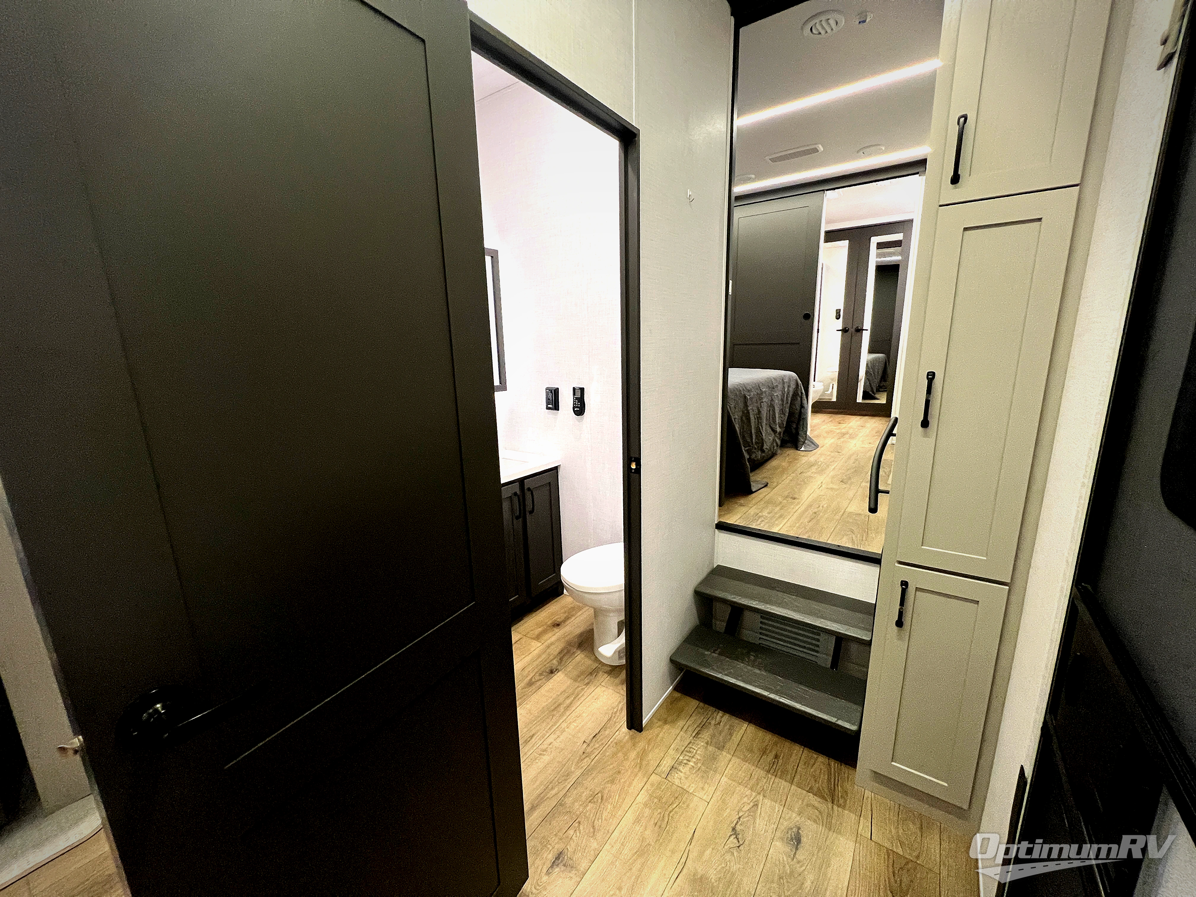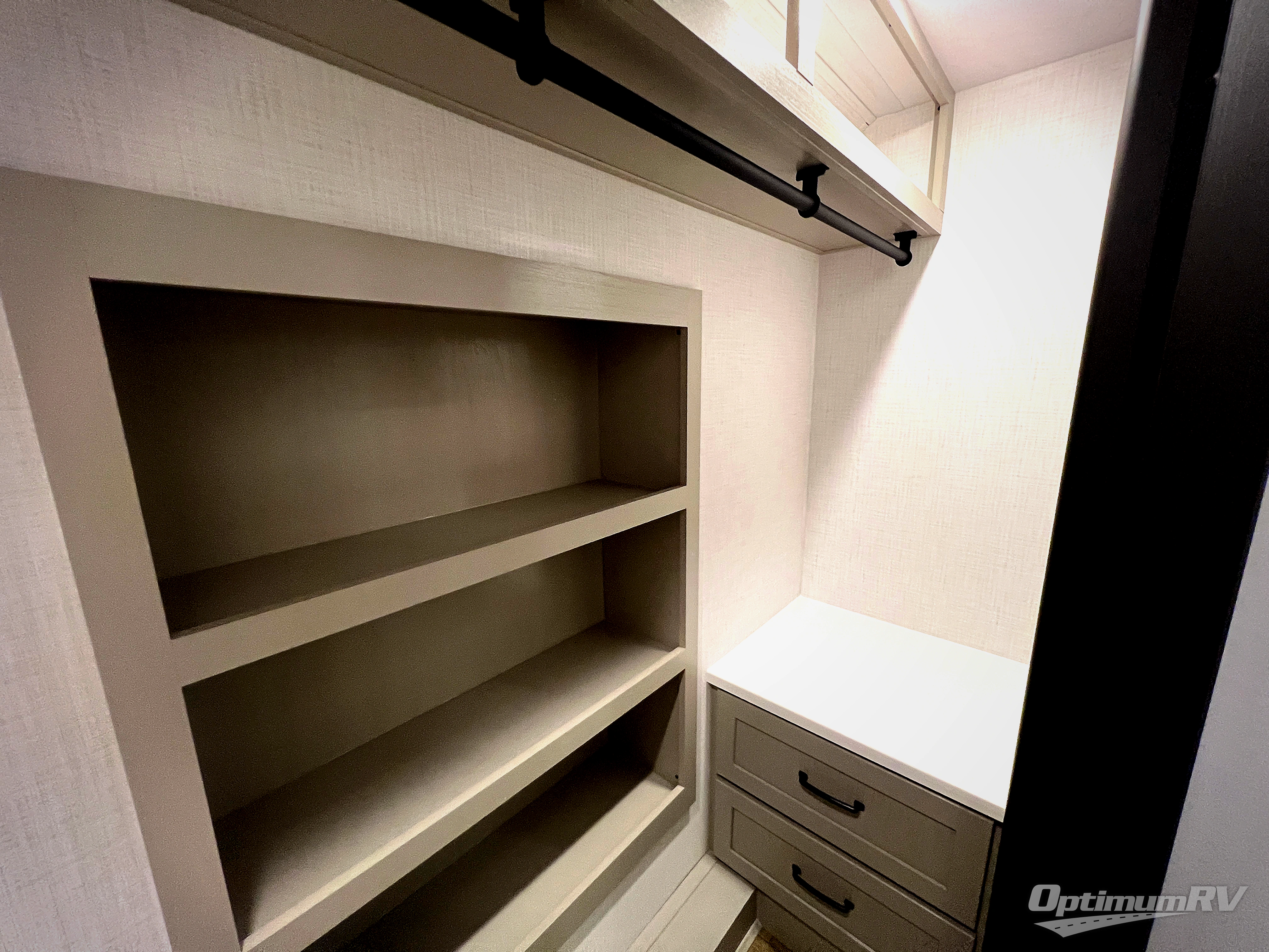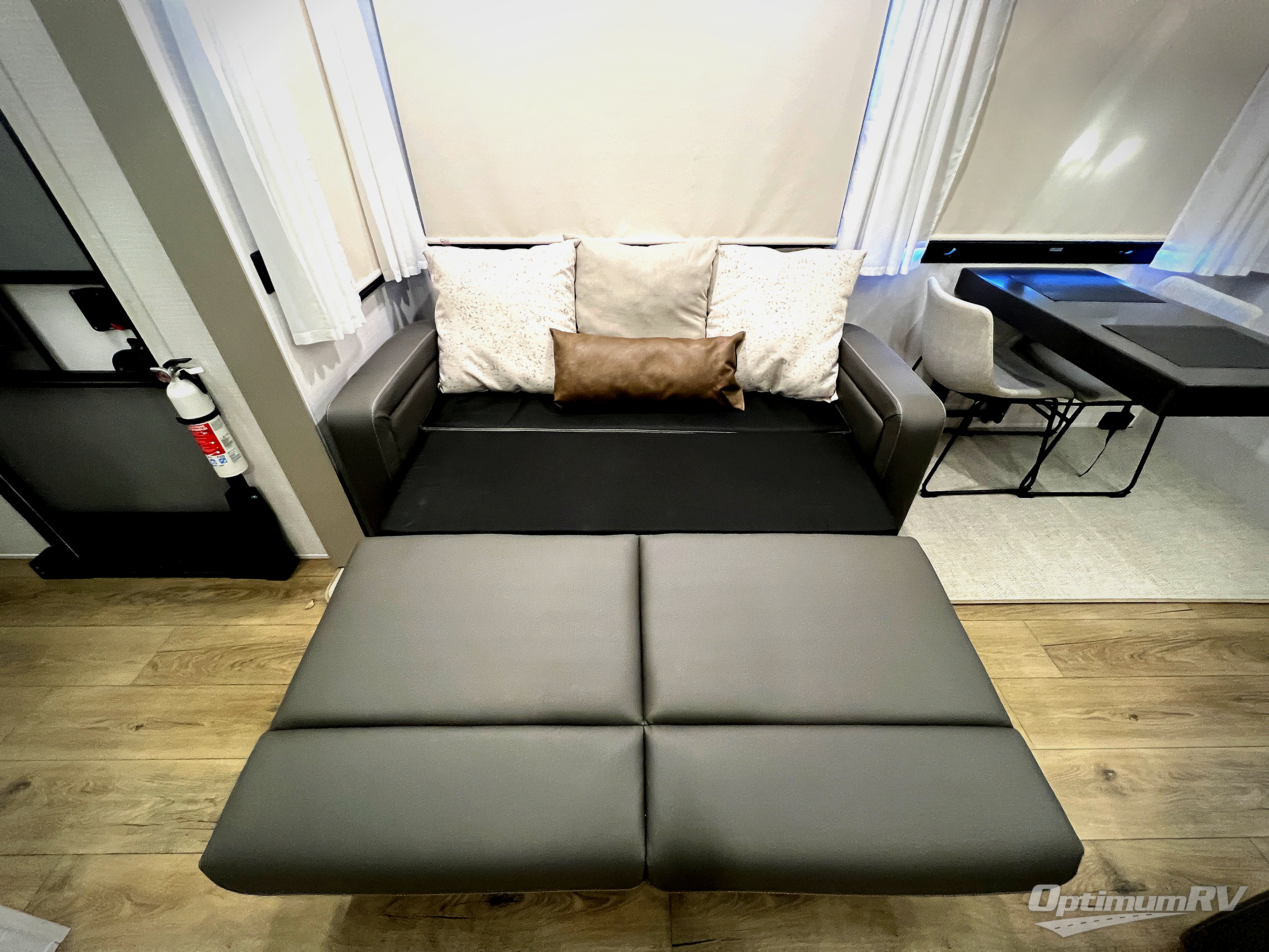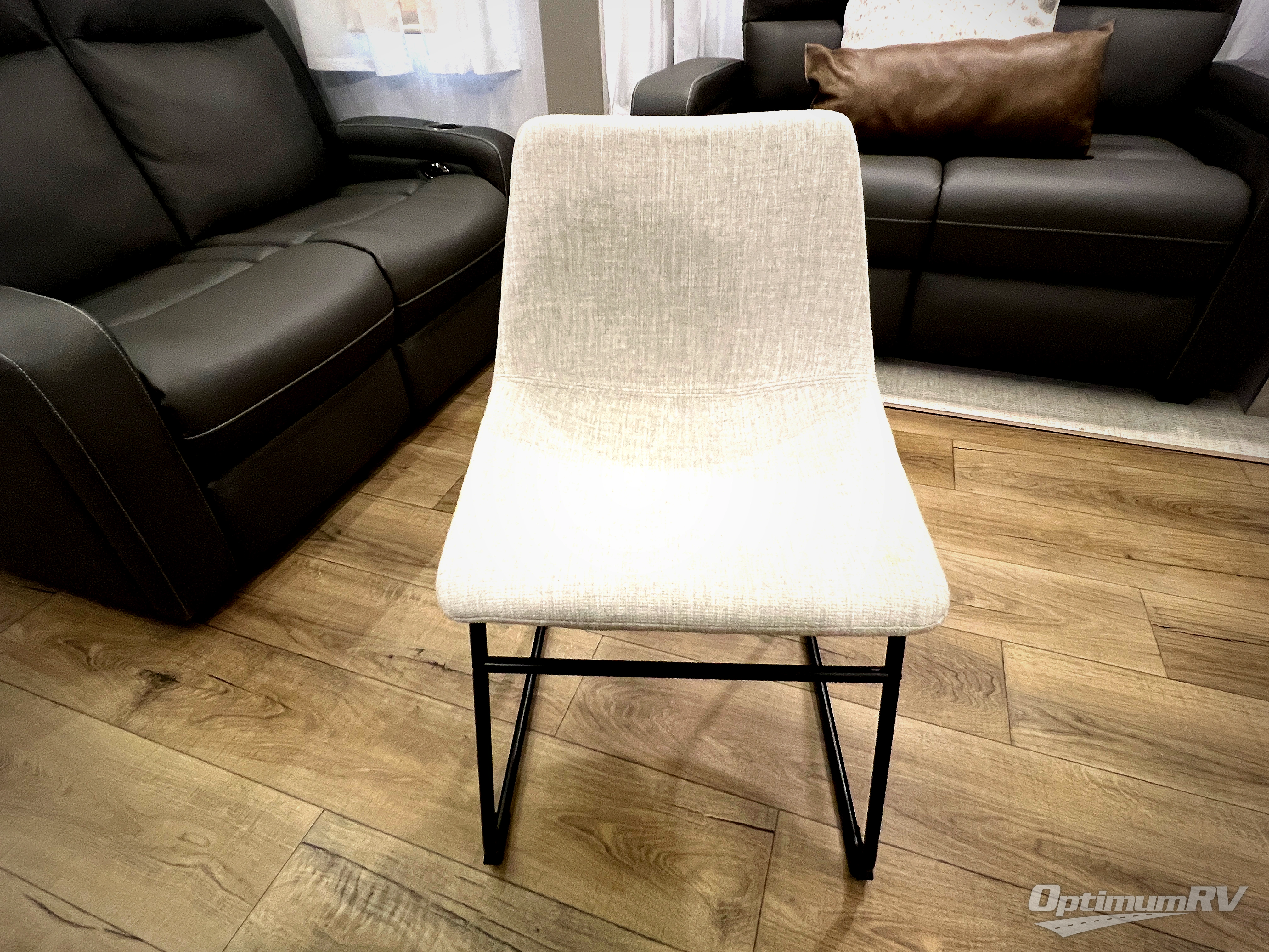 You won't believe all that this fifth wheel has to offer! Starting with the rear kitchen which has plenty of countertop space to prepare your delicious meals, a four burner cooktop with a stainless steel 24" oven to cook them, and a large single bowl stainless steel sink for easy clean up. The living area has opposing sofas and a theater seat with USB charging and storage across from an entertainment center with 50" Smart TV. The half bathroom is close to the living area so you can get back to watching your movie faster. You will feel right at home sleeping in the master suite on a slide out king bed across from a dresser and hamper to keep your space tidy, plus entrance into the front full bathroom. Inside the bathroom, you will find a vanity with dual sinks for two to get ready at once, a spacious shower with a seat, and a walk-in closet for clothes, shoes, and more!