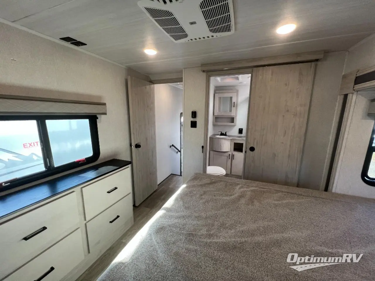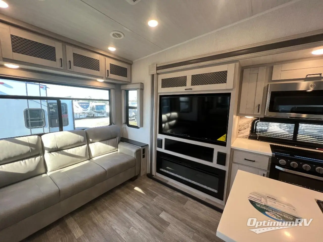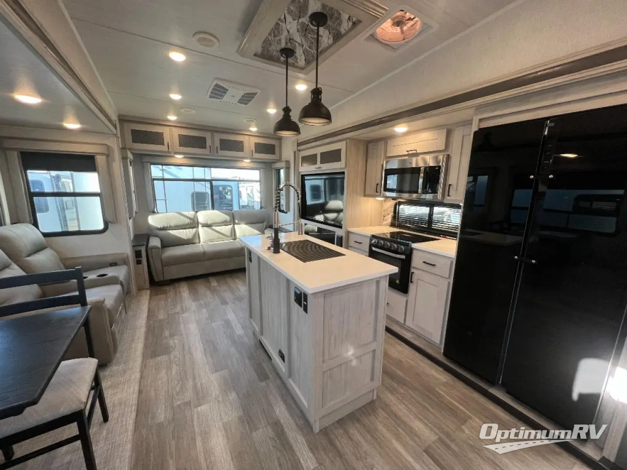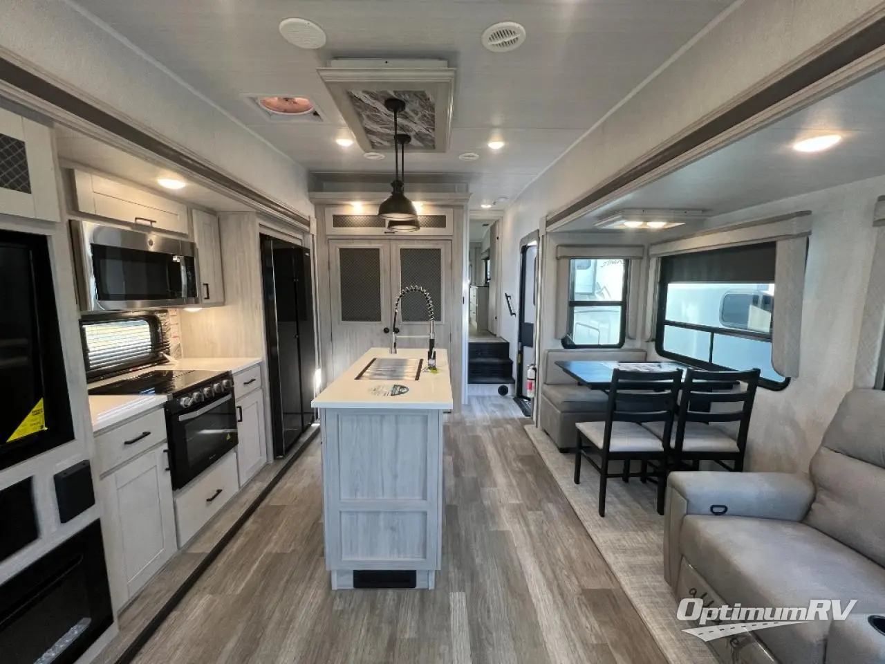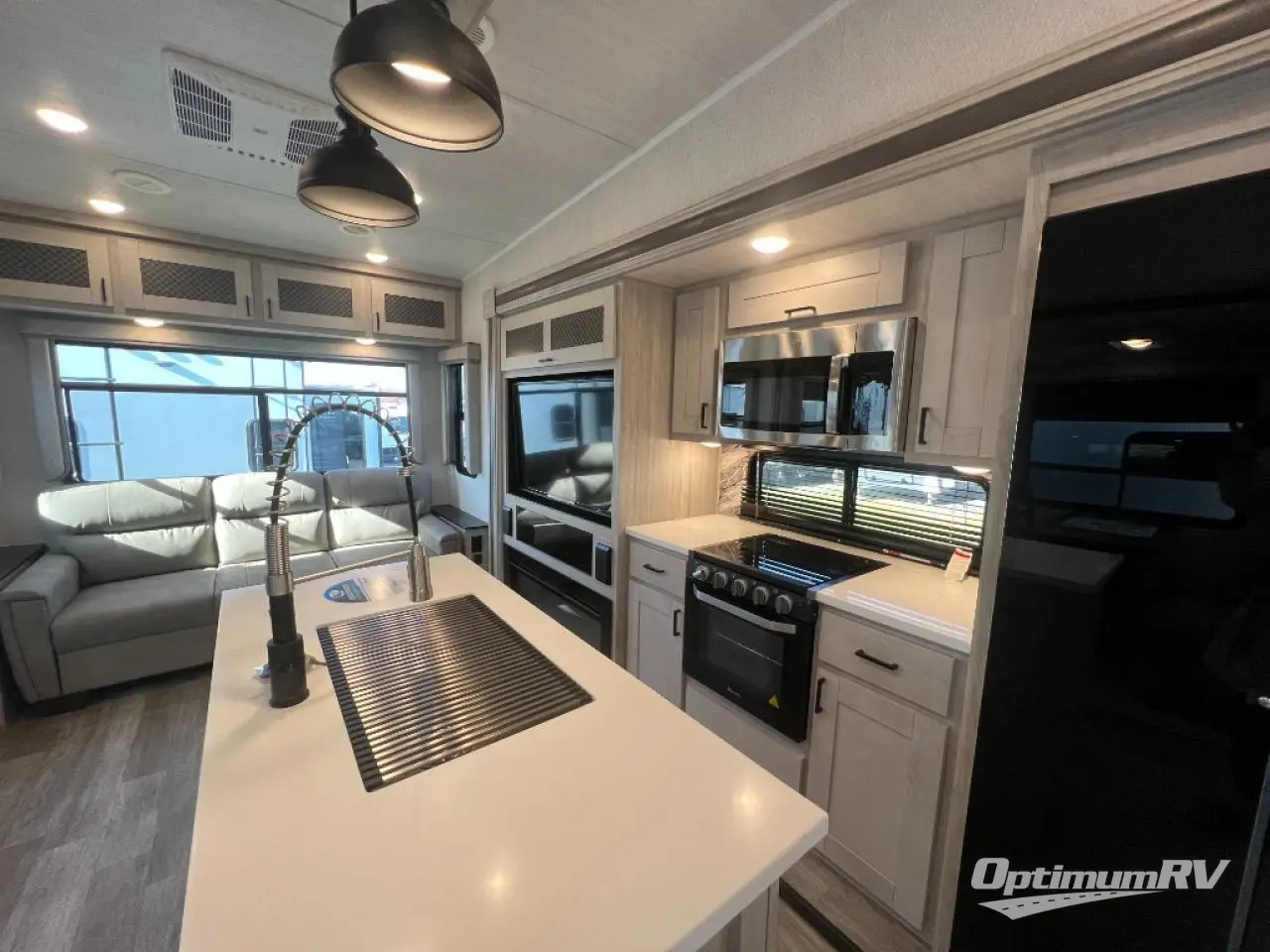 Take this Tandara fifth wheel out to the campsite and experience luxury while you camp! You will have a master suite that is quite impressive with its full-width wardrobe, king bed slide, under-bed storage, and private entrance into the dual-entry bathroom. The kitchen island is easy to gather around while you're cooking dinner or enjoying a late-night snack, and the hide-a-bed sofa will be comfortable for lounging or sleeping. As you spend time outside under the two electric awnings, you can grab some extra charcoal or camping chairs from the oversized pass-through storage.