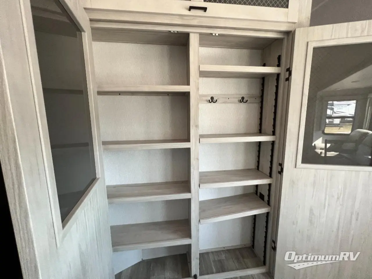 The rear guest suite and the front master suite on this Tandara fifth wheel will have you living in the lap of luxury while you camp! The front bedroom connects with a private entrance to the dual-entry bathroom, and the half bathroom is located back in the guest suite. Also located back in the guest suite is a loft bed with a ladder and loft storage. The main living area has a theater seating and a free-standing dinette to sit down and chat with the chef who is preparing dinner on the four-burner range. The double-door pantry and coat closet will keep your snacks and jackets stored away so that they don't clutter the interior, and you can also head outside to find more meal prep space at the outdoor kitchen.