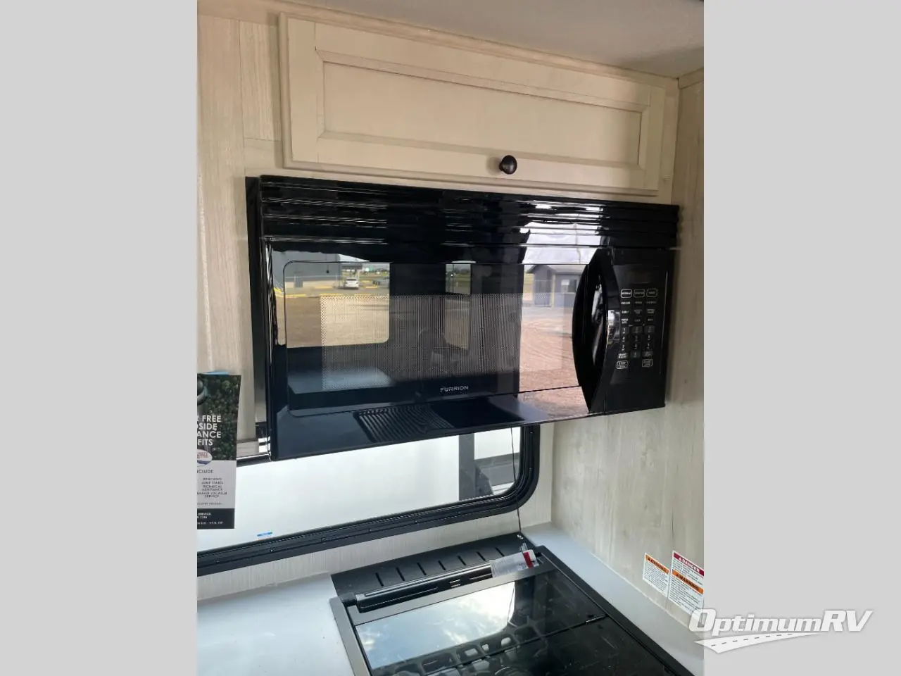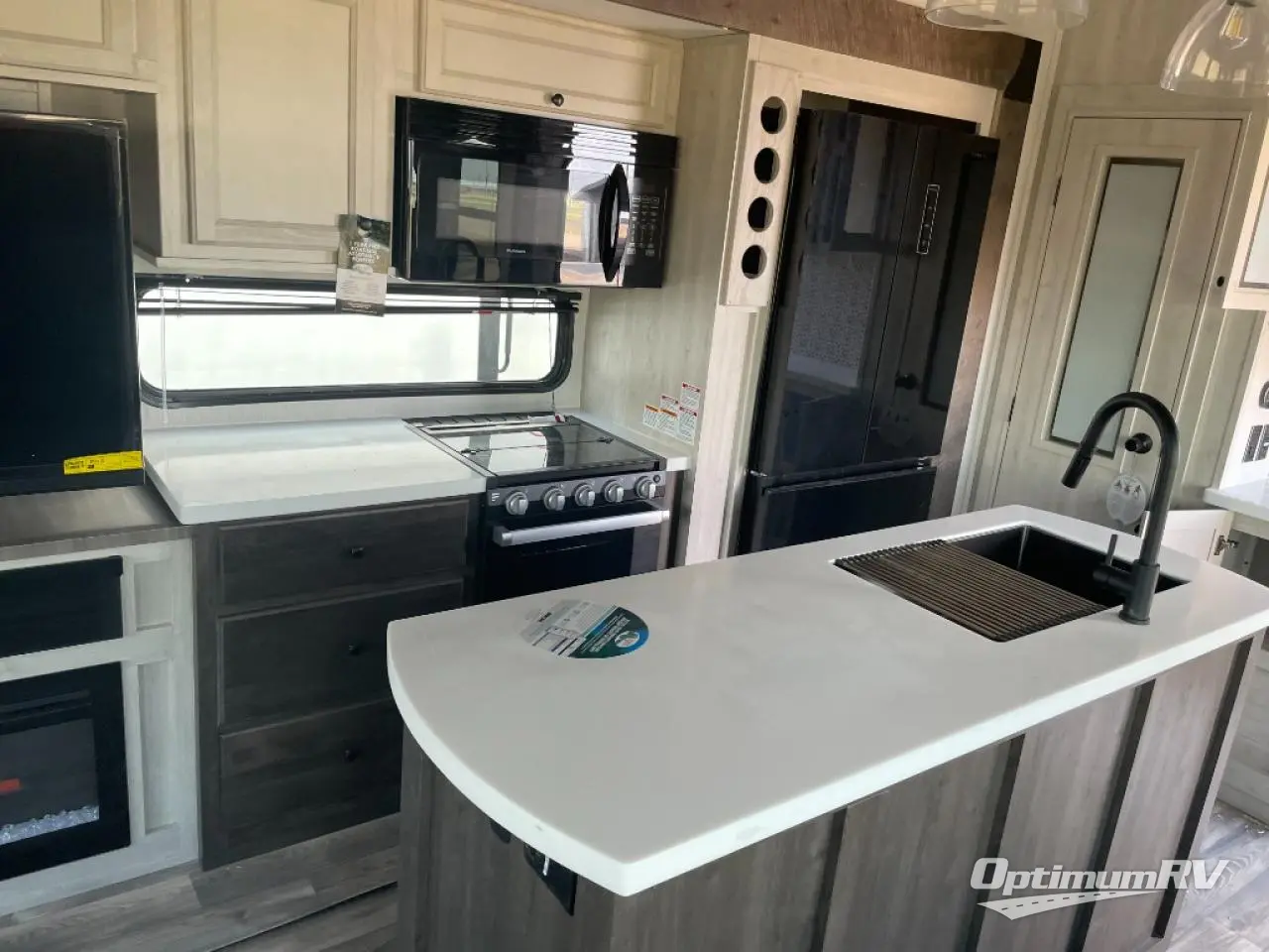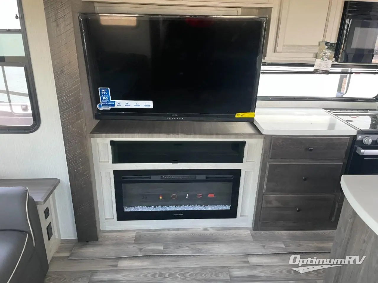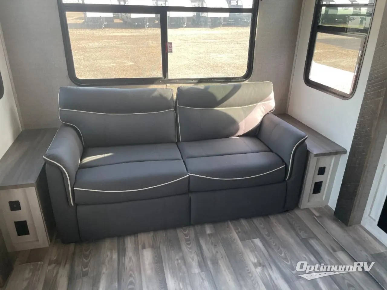 You and your spouse will have a comfortable time camping in this fifth wheel! The front private bedroom has a king bed slide to lay your head on at night and a front wardrobe that is prepped to add an optional washer and dryer so you can have clean clothes throughout your entire trip. After a fun day at the beach, you can rinse the sand out of your hair in the full bathroom with the shower with a seat. Create your best home cooked meals in the fully equipped kitchen with the kitchen island and the 2-in-1 22" oven/range, plus store leftovers in the 17 cu. ft. refrigerator then heat them up again in the 30" over-the-range microwave oven that is vented to the exterior. The booth dinette is not only great for eating your meals and playing games, but also for transforming into an extra sleeping space for guests to tag along. You even have a rear sofa for more sleeping spaces, and theater seating across from an electric fireplace at the entertainment center!