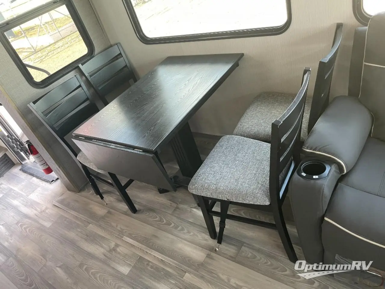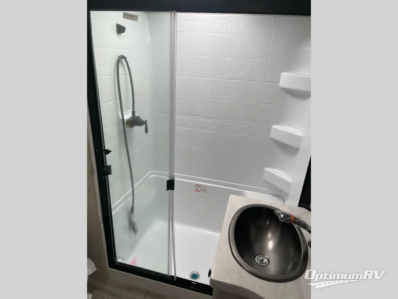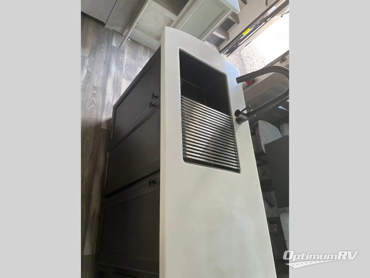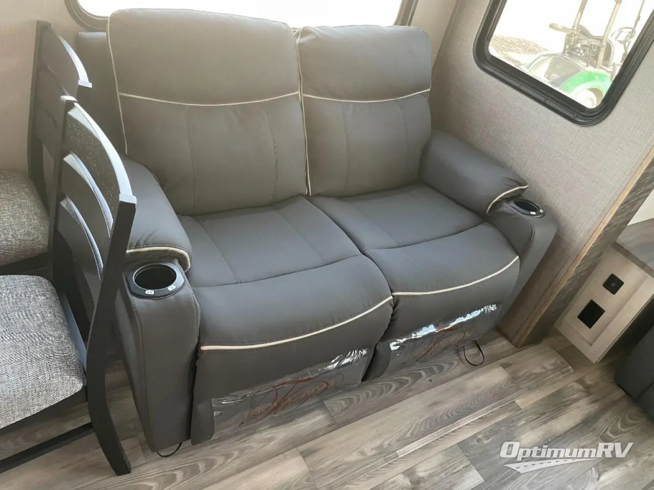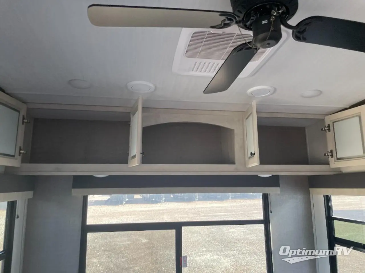 You and your spouse will have a comfortable time camping in this fifth wheel! The front private bedroom has a king bed slide to lay your head on at night and a front wardrobe that is prepped to add an optional washer and dryer so you can have clean clothes throughout your entire trip. After a fun day at the beach, you can rinse the sand out of your hair in the full bathroom with the shower with a seat. Create your best home cooked meals in the fully equipped kitchen with the kitchen island and the 2-in-1 22" oven/range, plus store leftovers in the 17 cu. ft. refrigerator then heat them up again in the 30" over-the-range microwave oven that is vented to the exterior. The booth dinette is not only great for eating your meals and playing games, but also for transforming into an extra sleeping space for guests to tag along. You even have a rear sofa for more sleeping spaces, and theater seating across from an electric fireplace at the entertainment center!