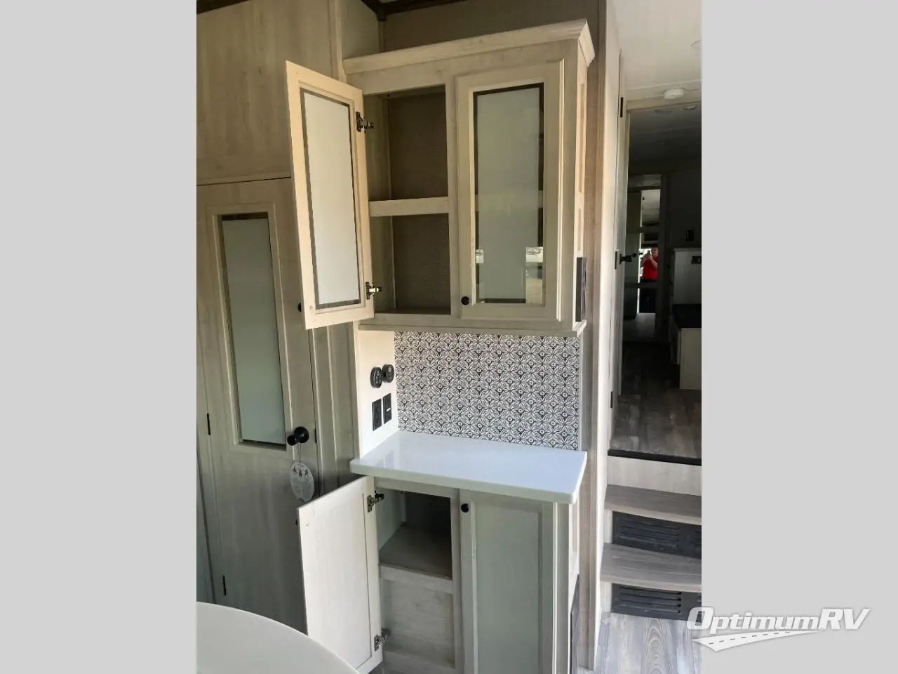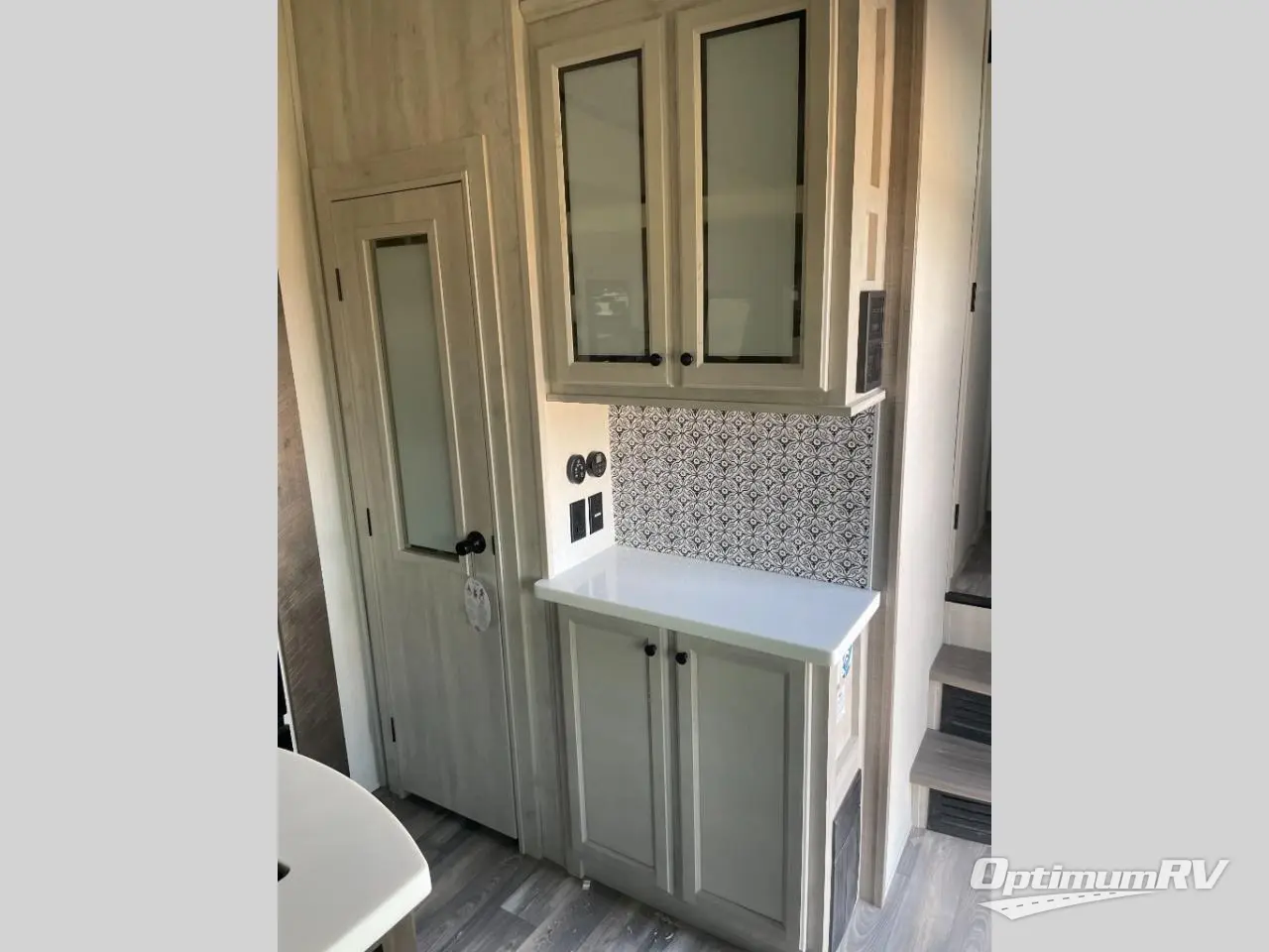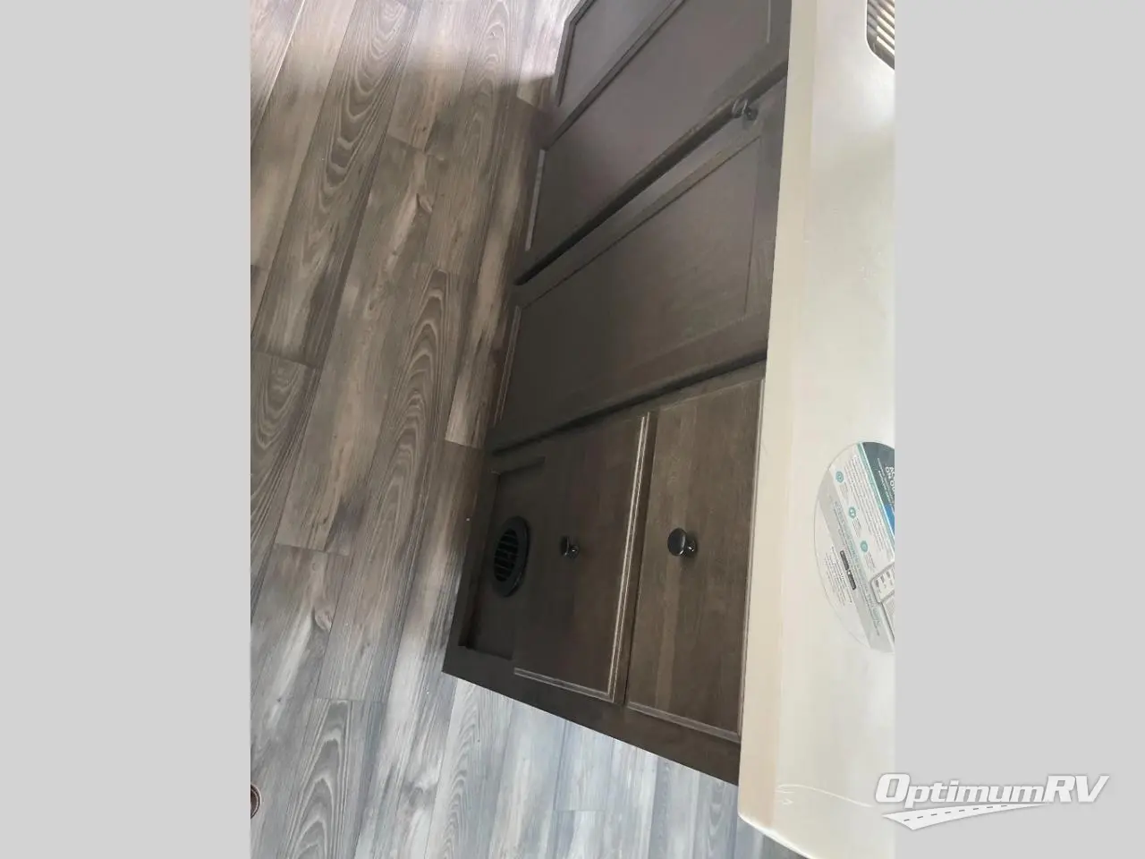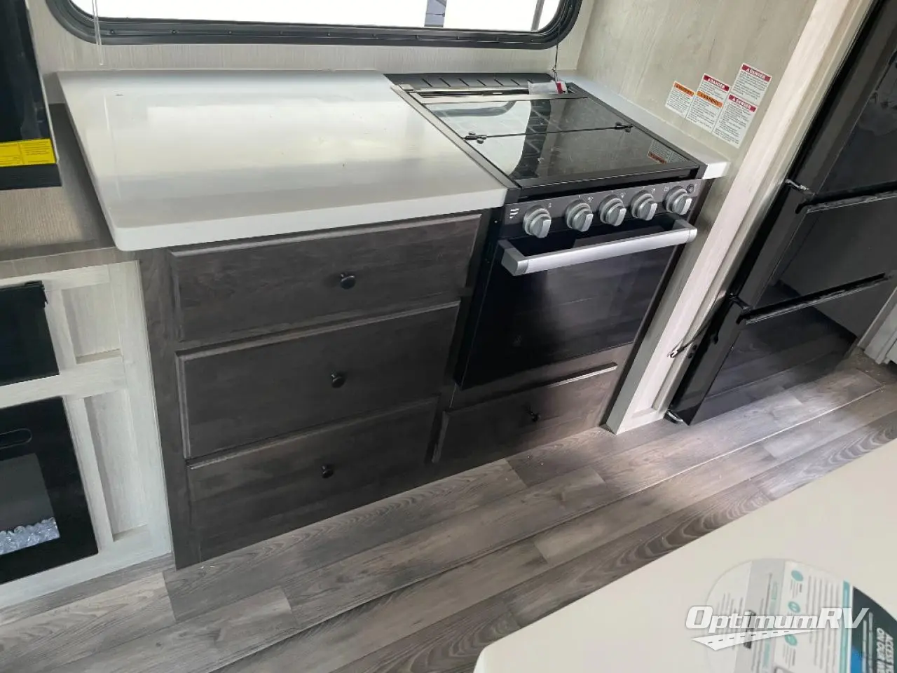 You and your spouse will have a comfortable time camping in this fifth wheel! The front private bedroom has a king bed slide to lay your head on at night and a front wardrobe that is prepped to add an optional washer and dryer so you can have clean clothes throughout your entire trip. After a fun day at the beach, you can rinse the sand out of your hair in the full bathroom with the shower with a seat. Create your best home cooked meals in the fully equipped kitchen with the kitchen island and the 2-in-1 22" oven/range, plus store leftovers in the 17 cu. ft. refrigerator then heat them up again in the 30" over-the-range microwave oven that is vented to the exterior. The booth dinette is not only great for eating your meals and playing games, but also for transforming into an extra sleeping space for guests to tag along. You even have a rear sofa for more sleeping spaces, and theater seating across from an electric fireplace at the entertainment center!