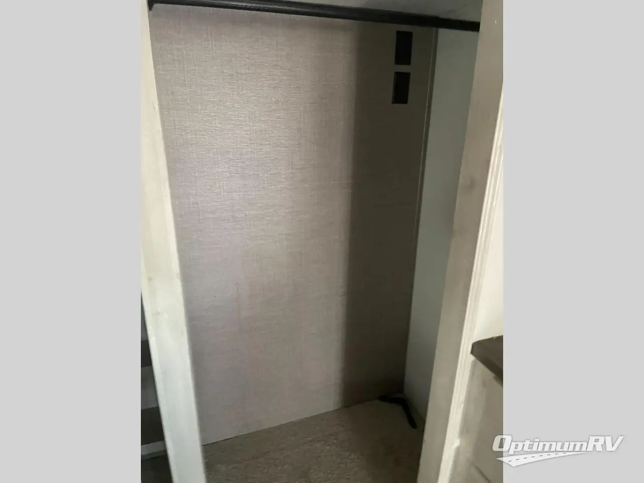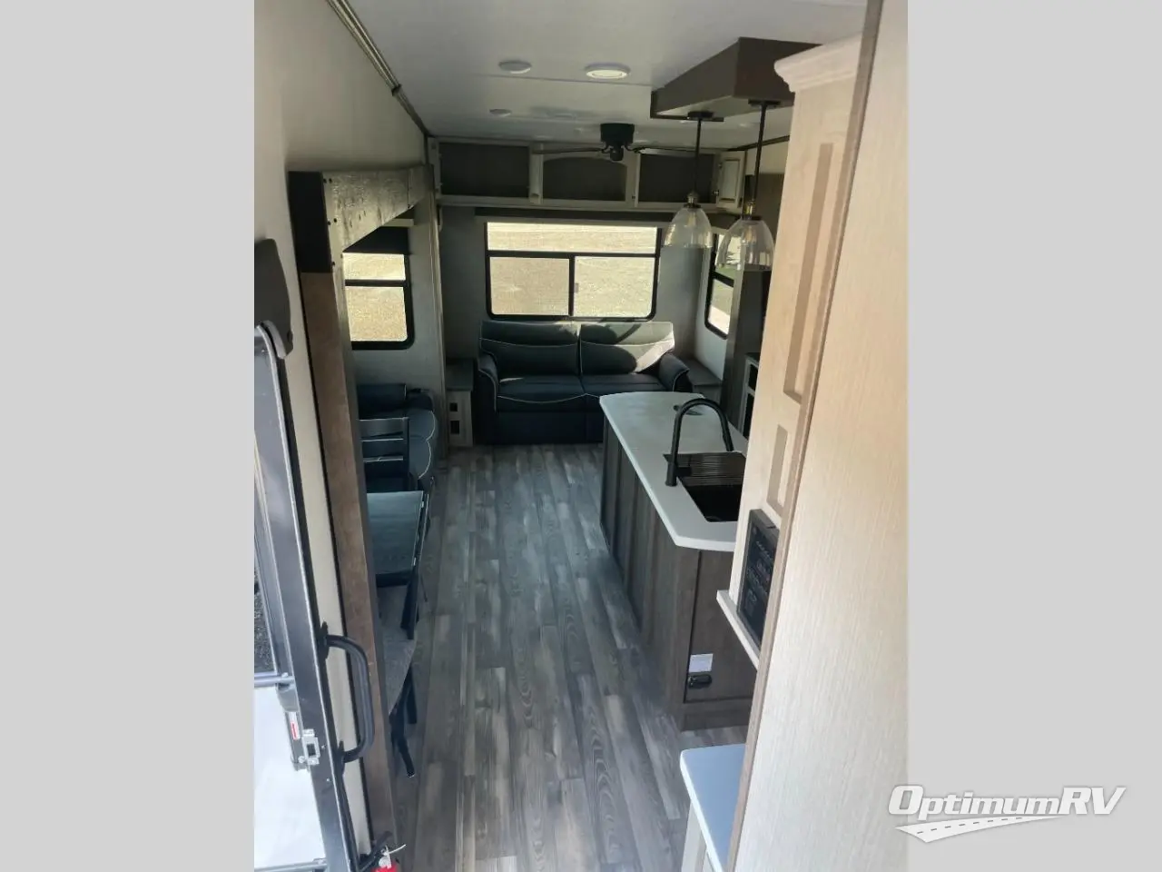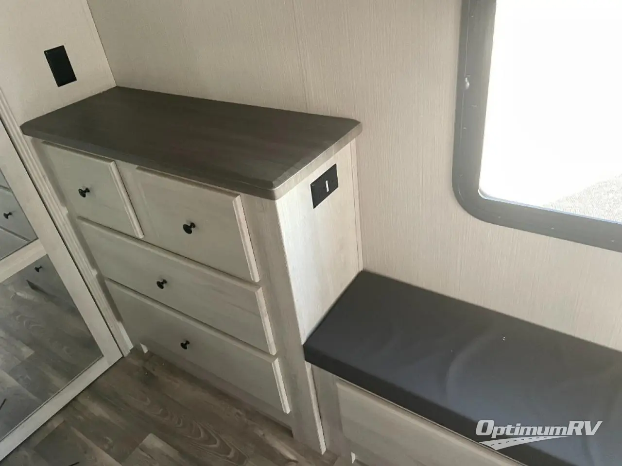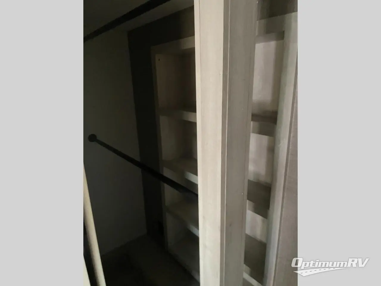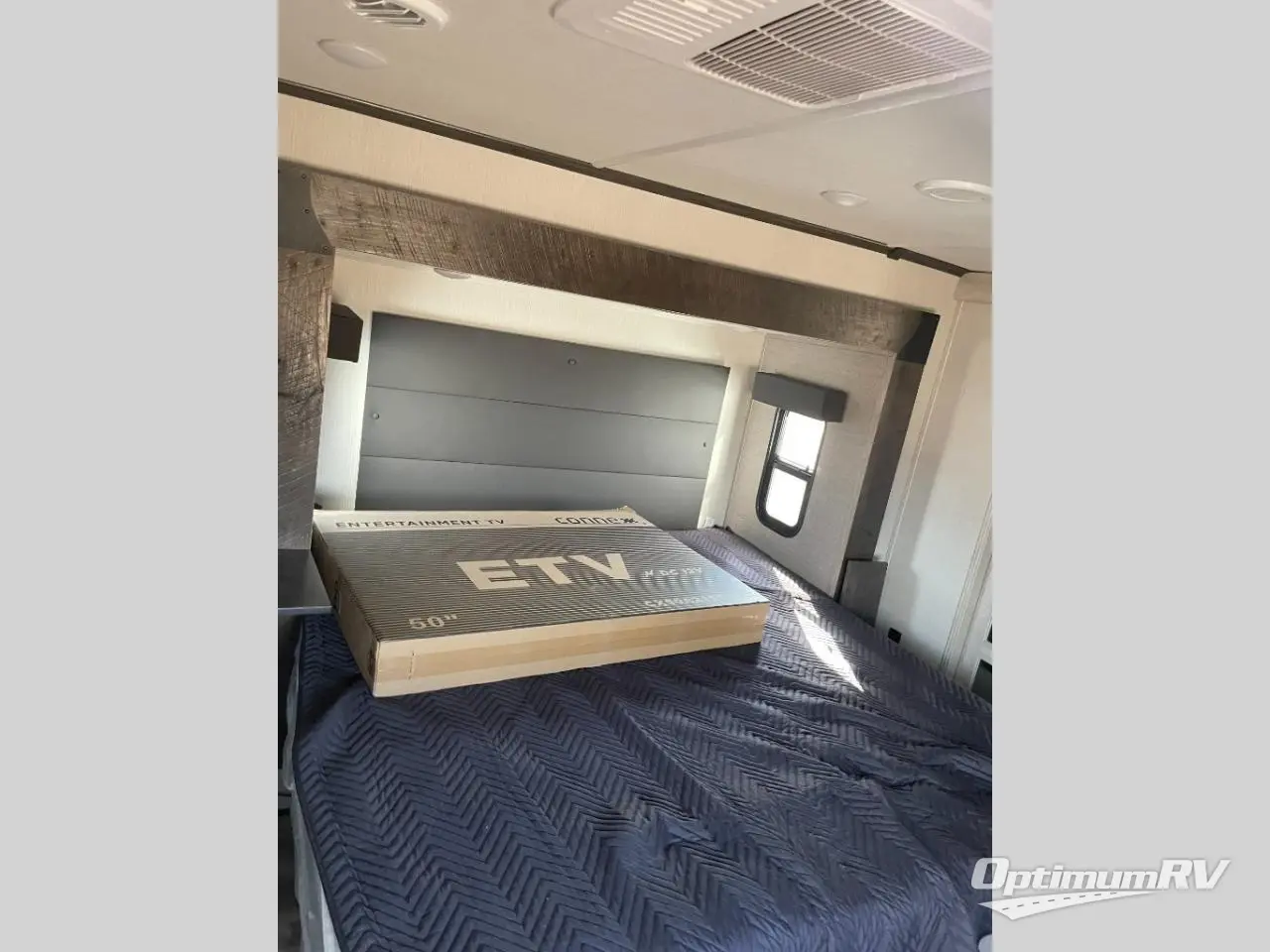 You and your spouse will have a comfortable time camping in this fifth wheel! The front private bedroom has a king bed slide to lay your head on at night and a front wardrobe that is prepped to add an optional washer and dryer so you can have clean clothes throughout your entire trip. After a fun day at the beach, you can rinse the sand out of your hair in the full bathroom with the shower with a seat. Create your best home cooked meals in the fully equipped kitchen with the kitchen island and the 2-in-1 22" oven/range, plus store leftovers in the 17 cu. ft. refrigerator then heat them up again in the 30" over-the-range microwave oven that is vented to the exterior. The booth dinette is not only great for eating your meals and playing games, but also for transforming into an extra sleeping space for guests to tag along. You even have a rear sofa for more sleeping spaces, and theater seating across from an electric fireplace at the entertainment center!