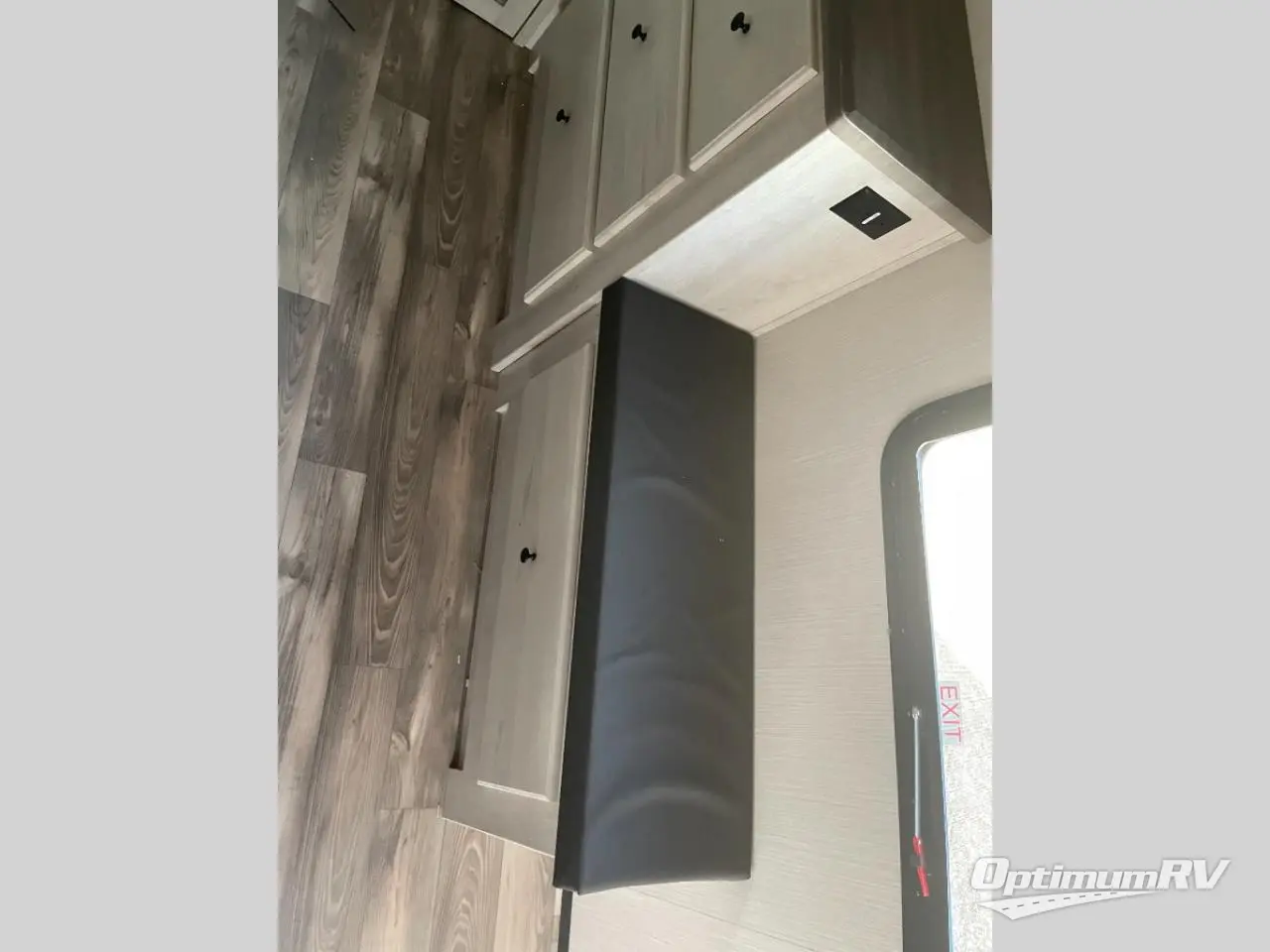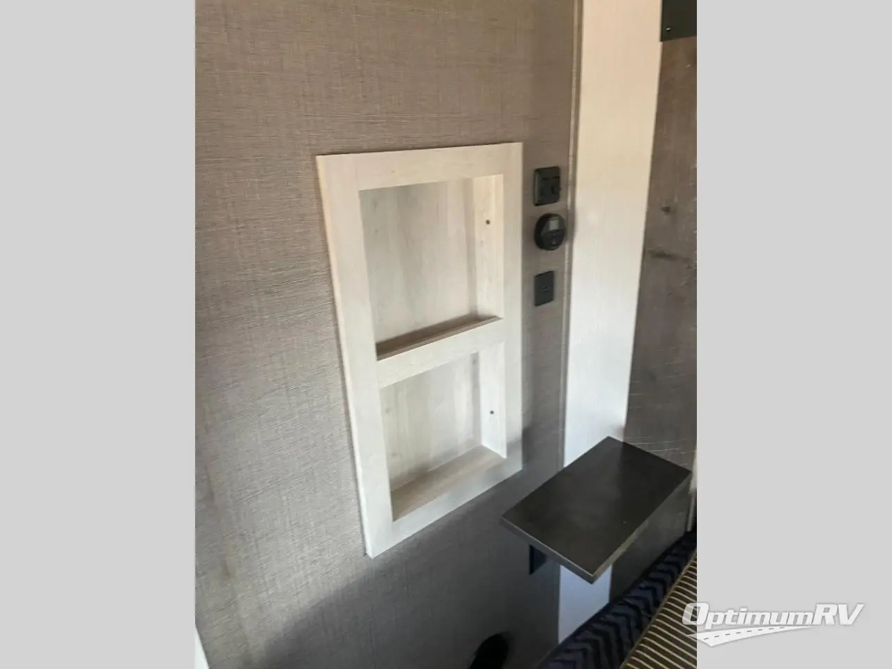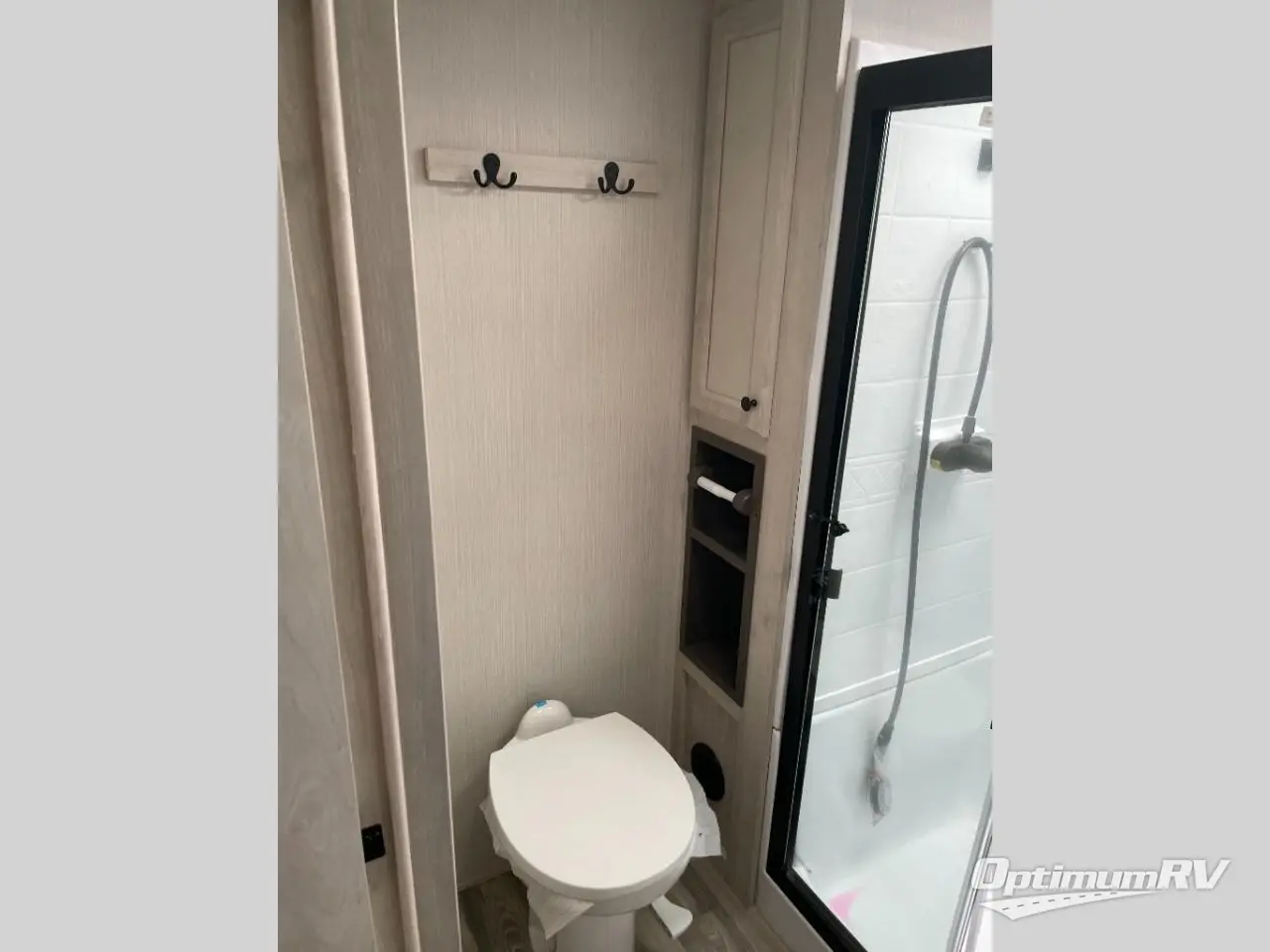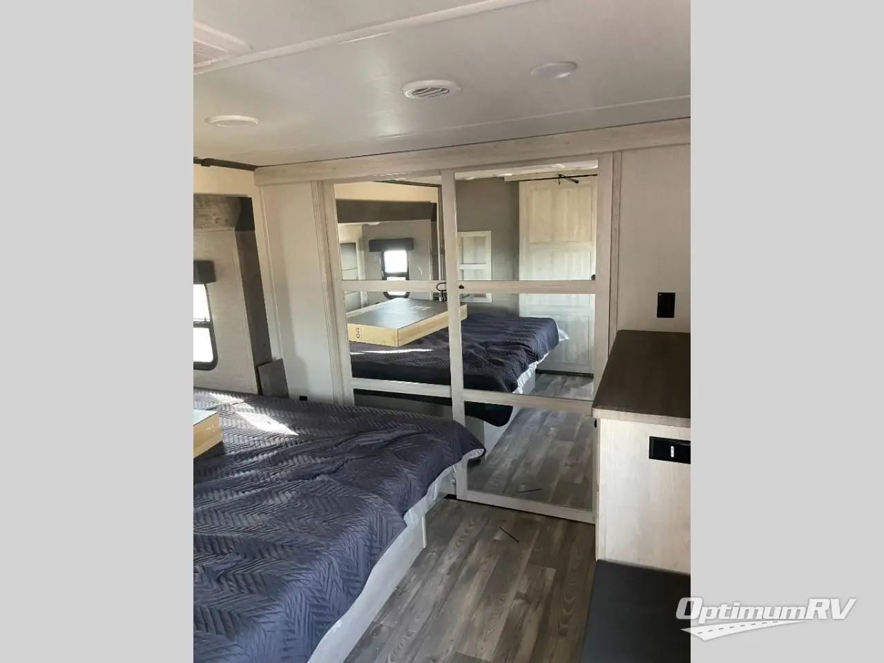 You and your spouse will have a comfortable time camping in this fifth wheel! The front private bedroom has a king bed slide to lay your head on at night and a front wardrobe that is prepped to add an optional washer and dryer so you can have clean clothes throughout your entire trip. After a fun day at the beach, you can rinse the sand out of your hair in the full bathroom with the shower with a seat. Create your best home cooked meals in the fully equipped kitchen with the kitchen island and the 2-in-1 22" oven/range, plus store leftovers in the 17 cu. ft. refrigerator then heat them up again in the 30" over-the-range microwave oven that is vented to the exterior. The booth dinette is not only great for eating your meals and playing games, but also for transforming into an extra sleeping space for guests to tag along. You even have a rear sofa for more sleeping spaces, and theater seating across from an electric fireplace at the entertainment center!