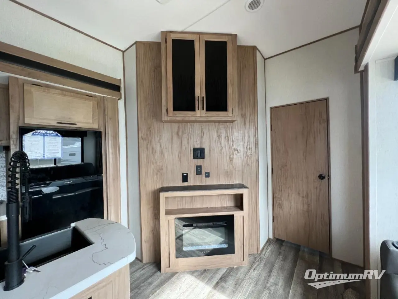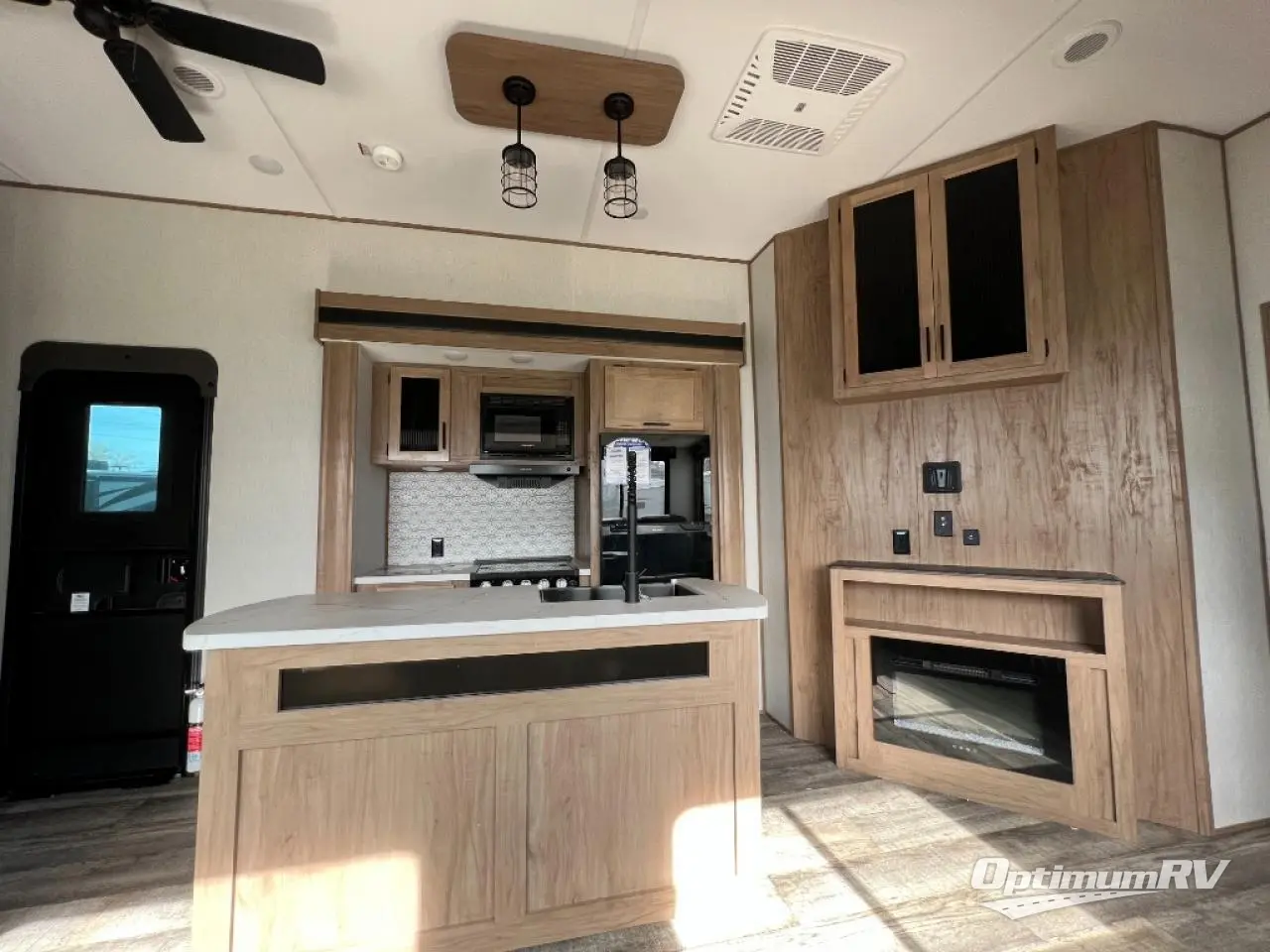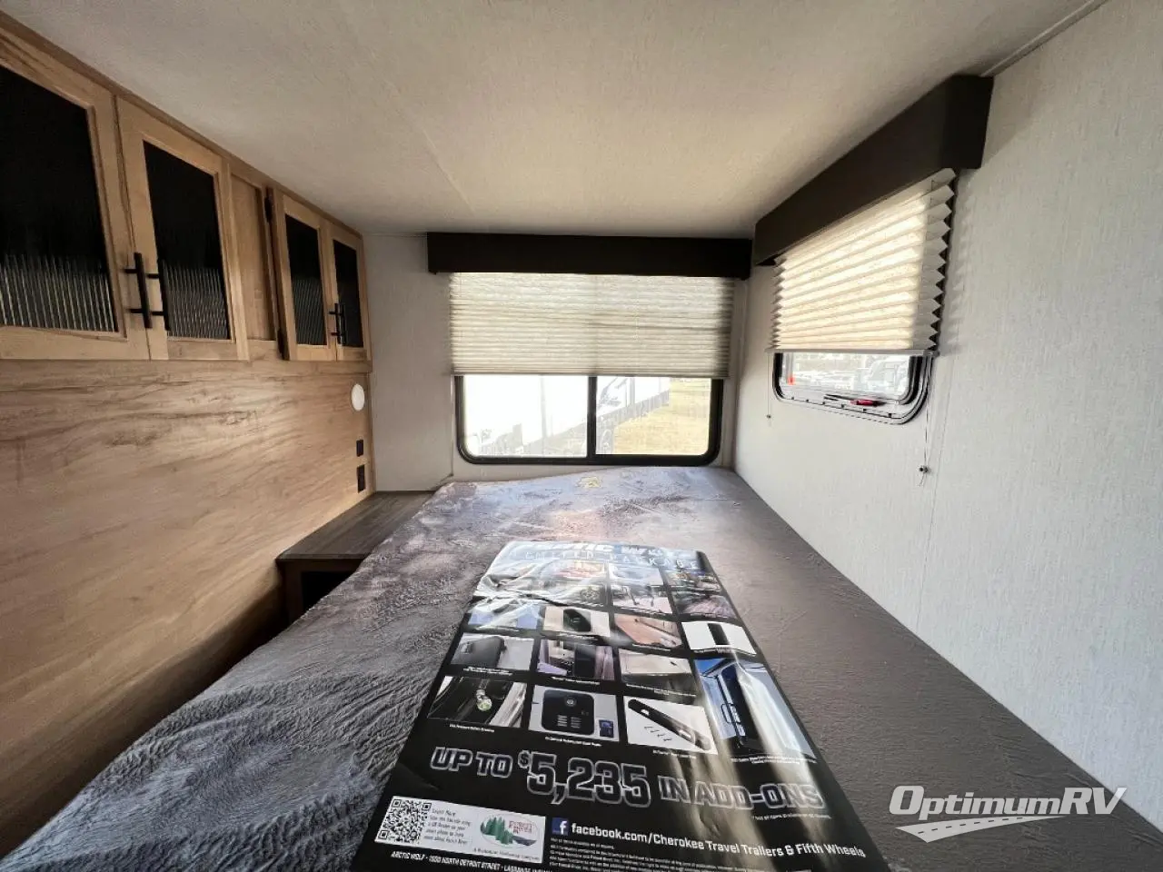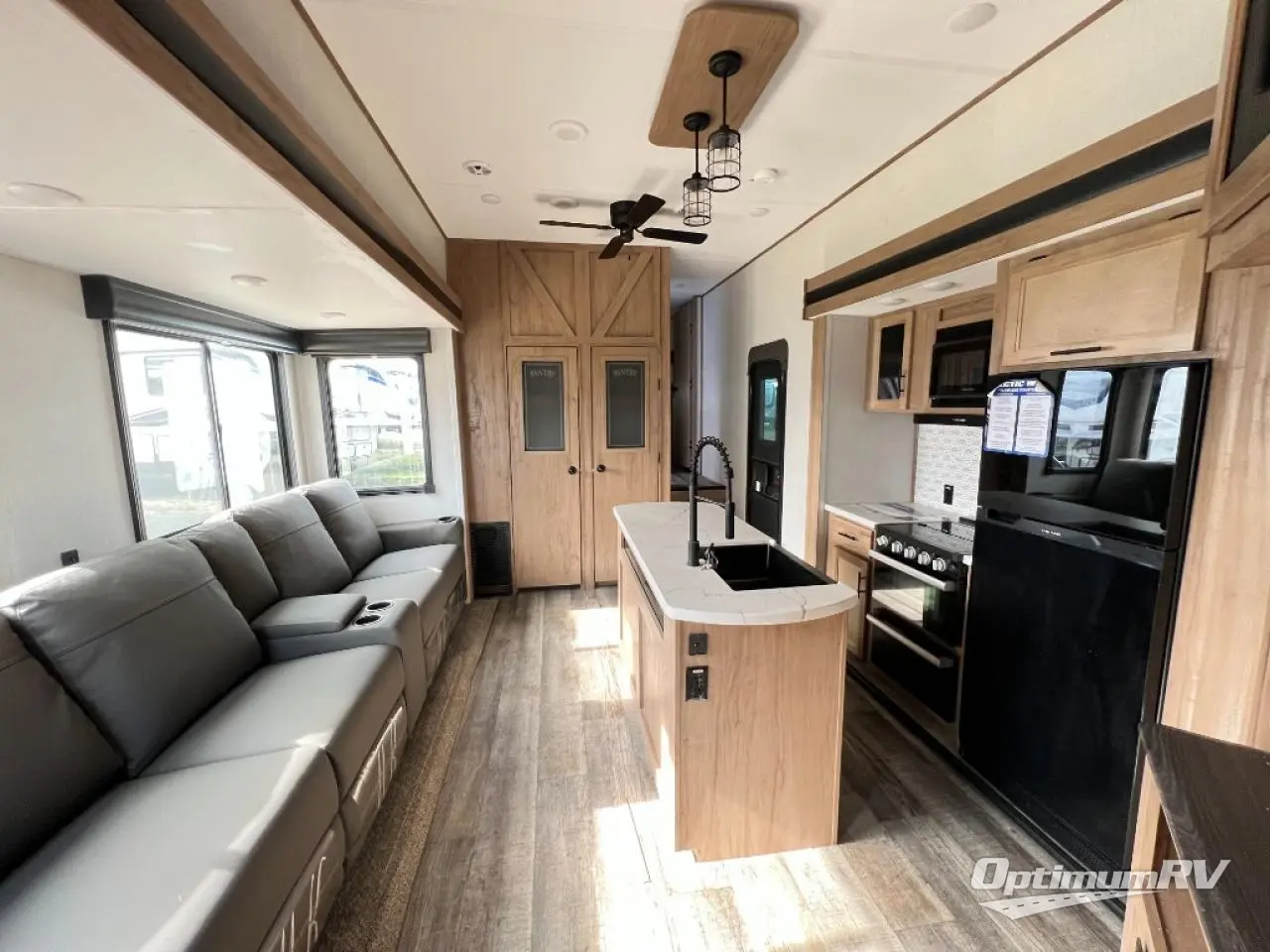 This Cherokee Arctic Wolf Suite fifth wheel is an excellent choice if you have a large family that wants to get away! Not only is there a private bedroom up front for you, but there is also a bedroom suite in the back. This suite has a 54" x 74" bed next to some wardrobe storage, a 60" x 80" loft above the bed with a ladder, a half bathroom all to itself, and the second exterior entry door. What a space! You'll also be highly impressed with the living area because it has a large slide that holds two sets of home theater seating with removable tables in front. Now you can sit down and enjoy dinner while you watch the optional residential-size LED TV that you added above the fireplace. The large pantry is another feature you'll appreciate since it can store all of the food needed to feed your group, and the outside kitchen is an added bonus the cook will love!