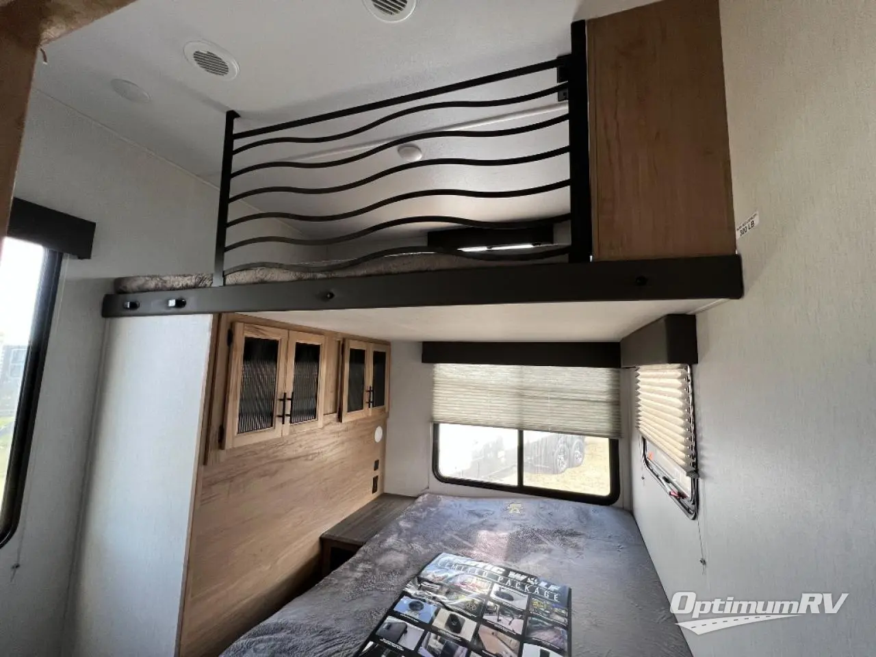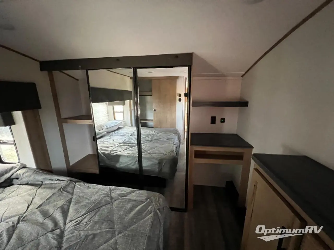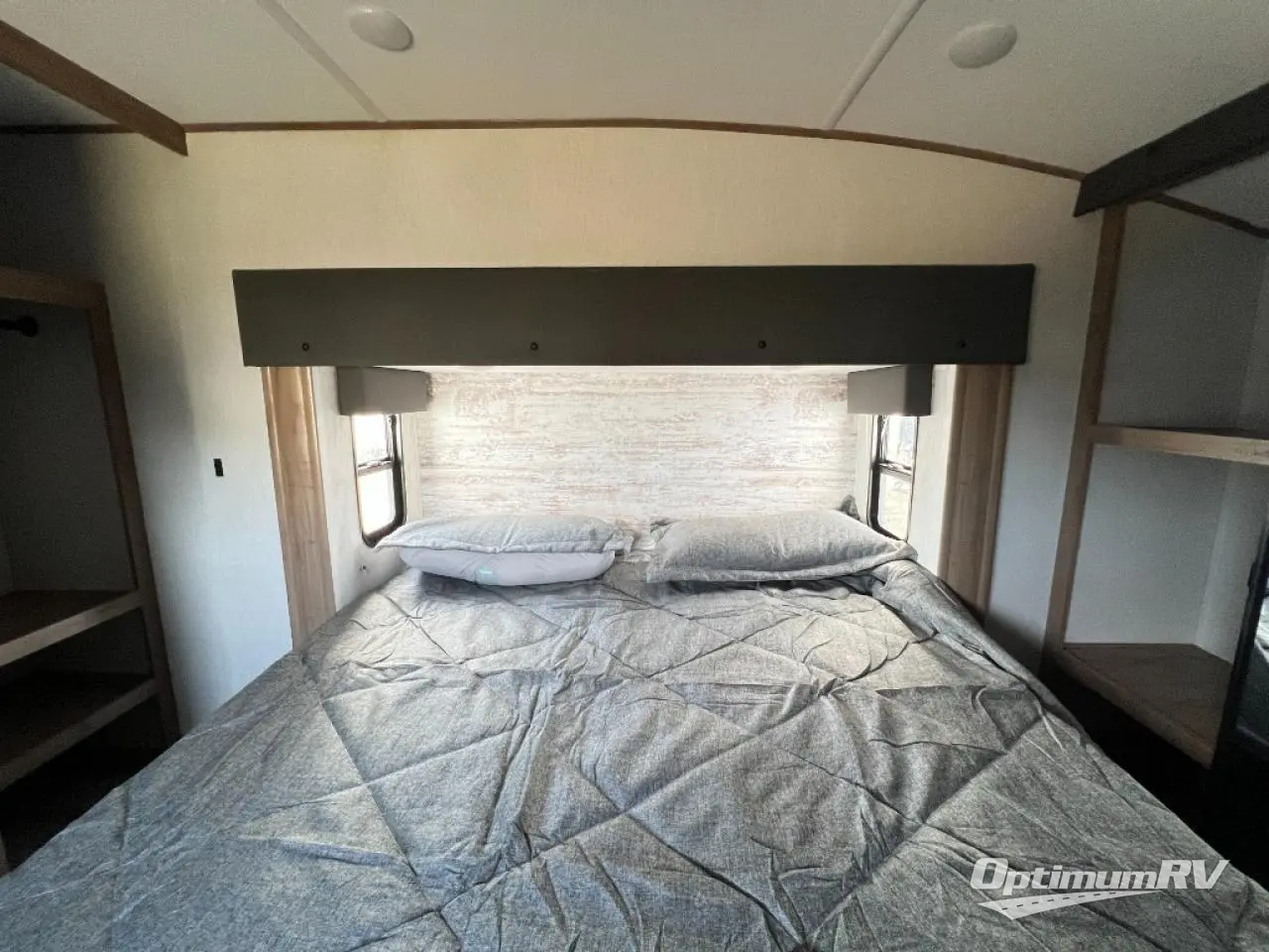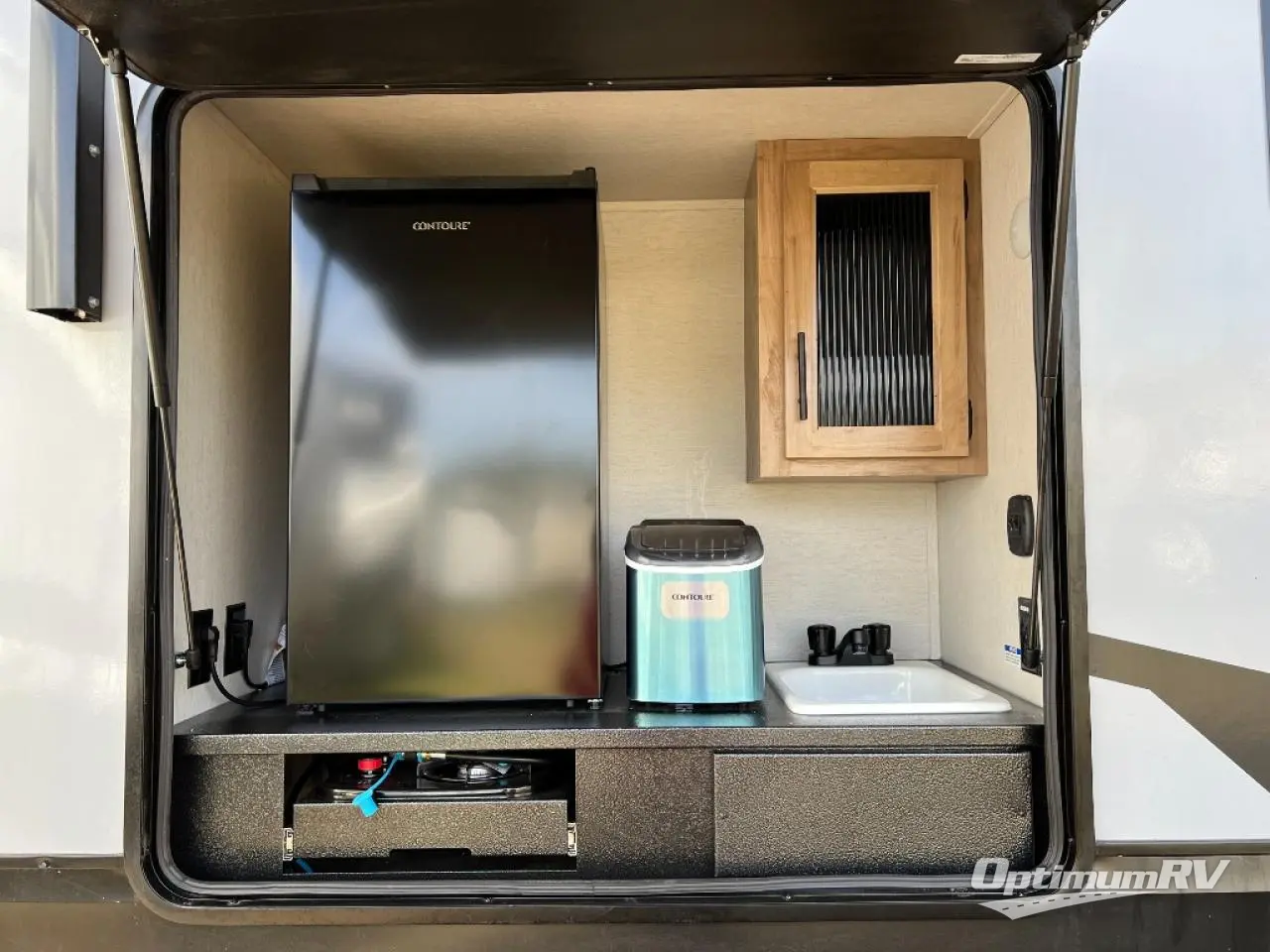 This Cherokee Arctic Wolf Suite fifth wheel is an excellent choice if you have a large family that wants to get away! Not only is there a private bedroom up front for you, but there is also a bedroom suite in the back. This suite has a 54" x 74" bed next to some wardrobe storage, a 60" x 80" loft above the bed with a ladder, a half bathroom all to itself, and the second exterior entry door. What a space! You'll also be highly impressed with the living area because it has a large slide that holds two sets of home theater seating with removable tables in front. Now you can sit down and enjoy dinner while you watch the optional residential-size LED TV that you added above the fireplace. The large pantry is another feature you'll appreciate since it can store all of the food needed to feed your group, and the outside kitchen is an added bonus the cook will love!