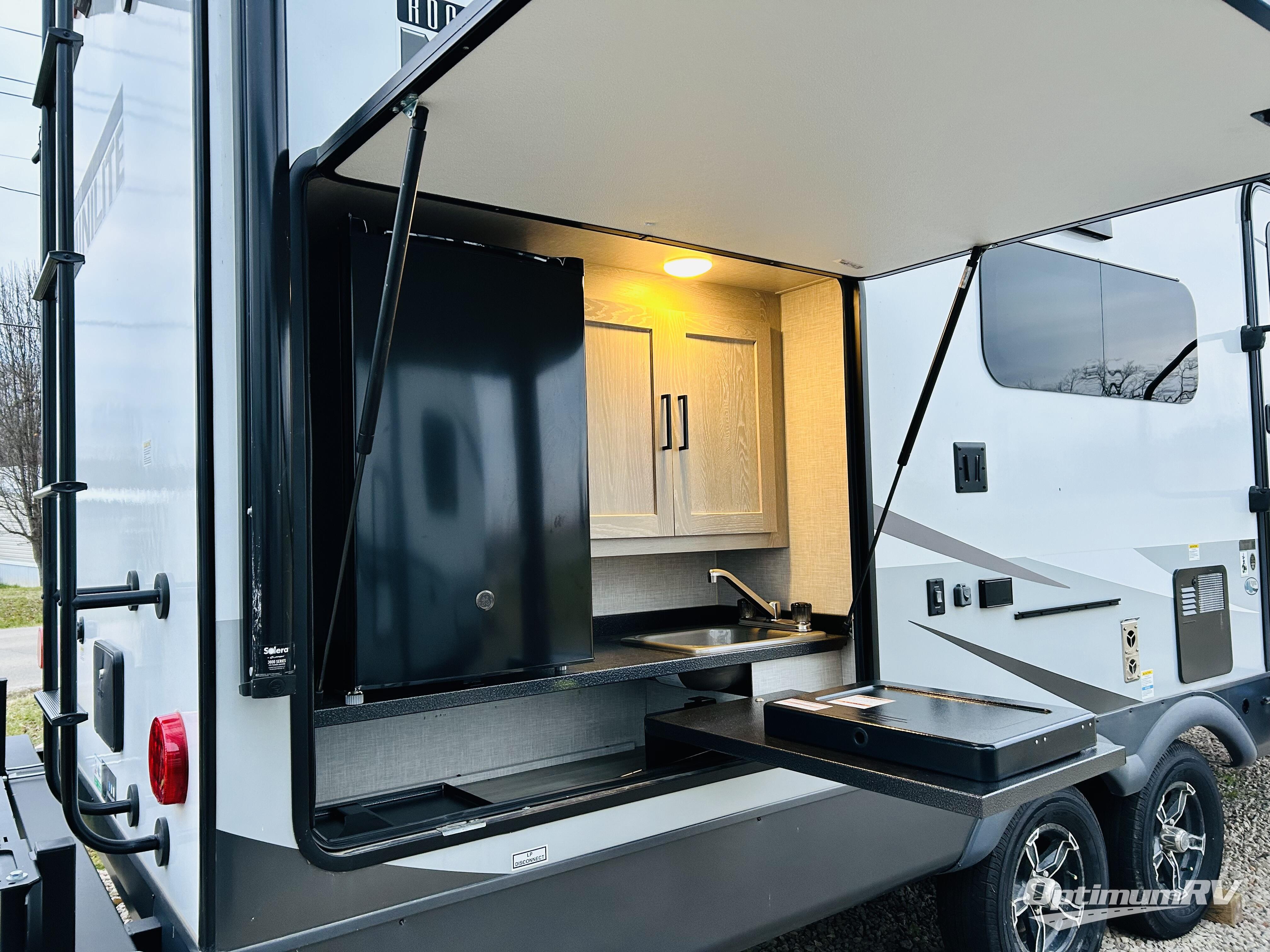 This is the perfect travel trailer for two people looking for comfortable camping trips! You will have your own RV queen bed to sleep on in the front private bedroom, and an optional TV can be added if you enjoy the morning news in bed. Breakfast can be made on the three burner cooktop, or head outdoors to cook on the outside kitchen. The theater seating with a table will provide a place to relax and dine together, and the spacious full rear bath will allow you to clean up before you head out for the day. This model includes plenty of storage space, including two pantries, a wardrobe slide out in the bedroom, plus a drop-frame pass-through storage for larger camp gear!