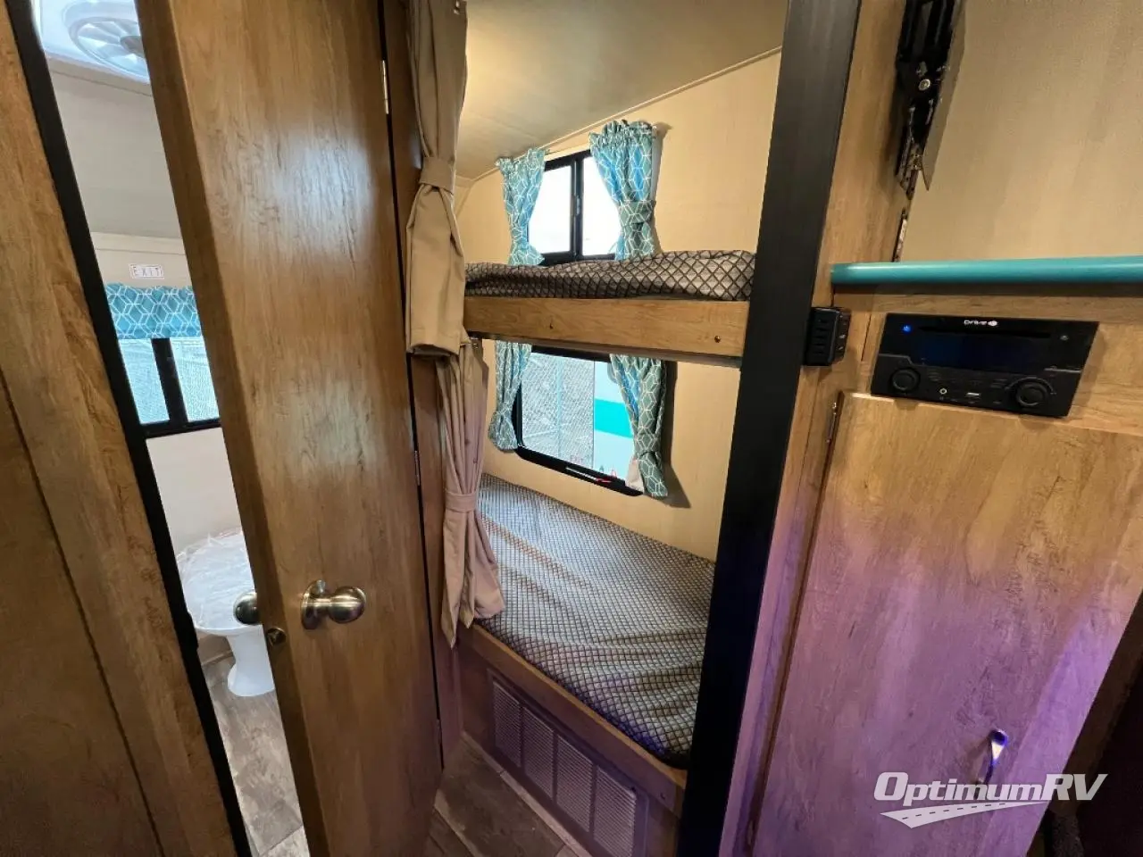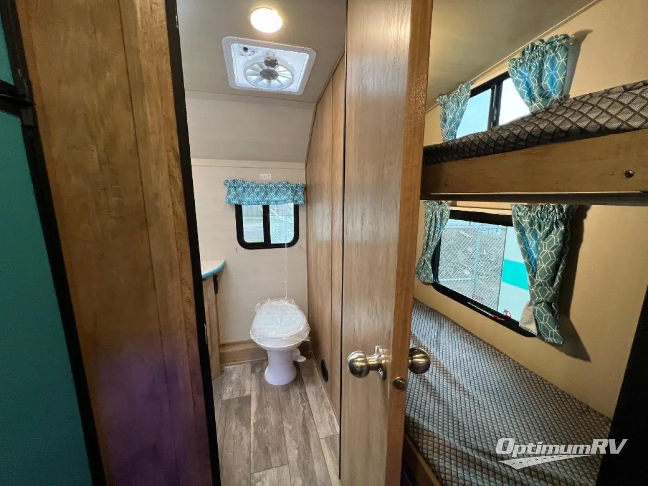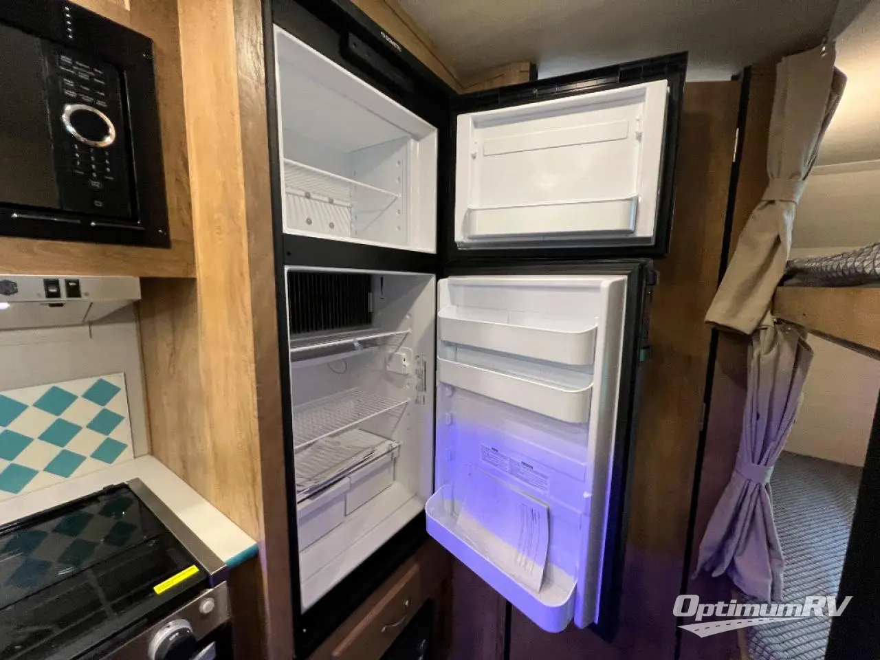 Bunk beds will make this travel trailer family and friend-friendly, so invite more along! There is a spacious full bath close by the bunks for convenience, and a wardrobe provides a place for your guests' clothes. The full kitchen includes everything you need to prepare meals each day, including a two burner cooktop, a microwave oven, plus a 6 cu. ft. double door refrigerator for milk and eggs. You will love the versatile jack knife sofa up front that converts to an RV queen Murphy bed when you're ready for bed, plus there is a privacy curtain here to enjoy your own space!