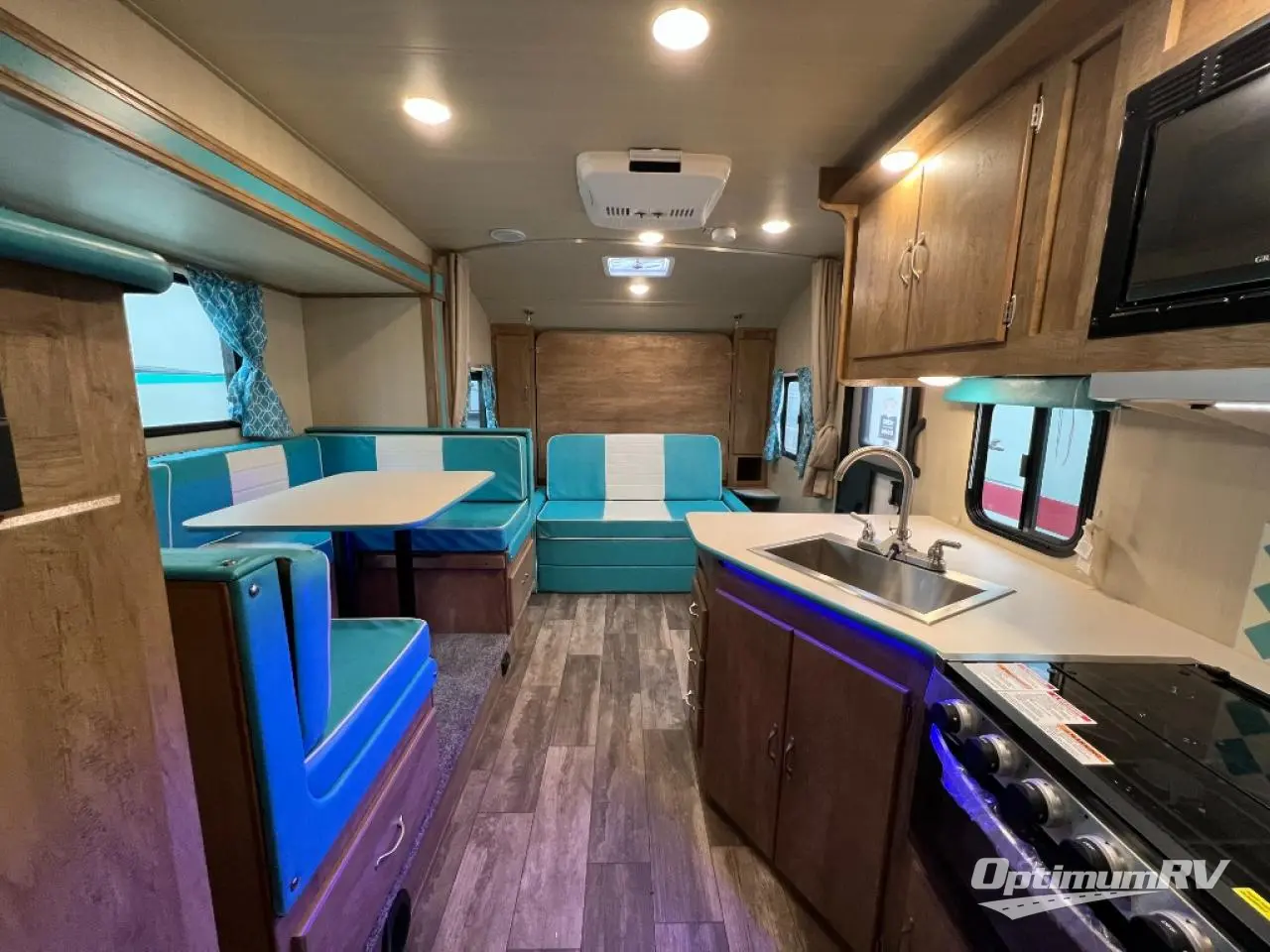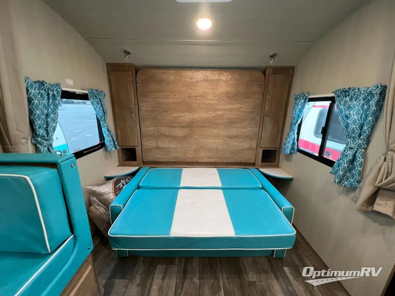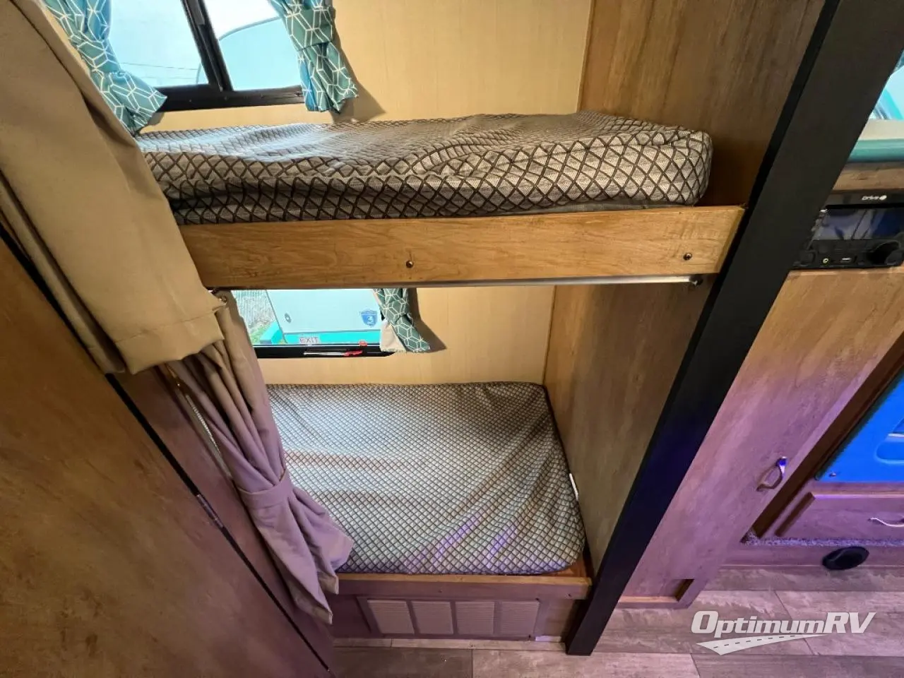 Bunk beds will make this travel trailer family and friend-friendly, so invite more along! There is a spacious full bath close by the bunks for convenience, and a wardrobe provides a place for your guests' clothes. The full kitchen includes everything you need to prepare meals each day, including a two burner cooktop, a microwave oven, plus a 6 cu. ft. double door refrigerator for milk and eggs. You will love the versatile jack knife sofa up front that converts to an RV queen Murphy bed when you're ready for bed, plus there is a privacy curtain here to enjoy your own space!