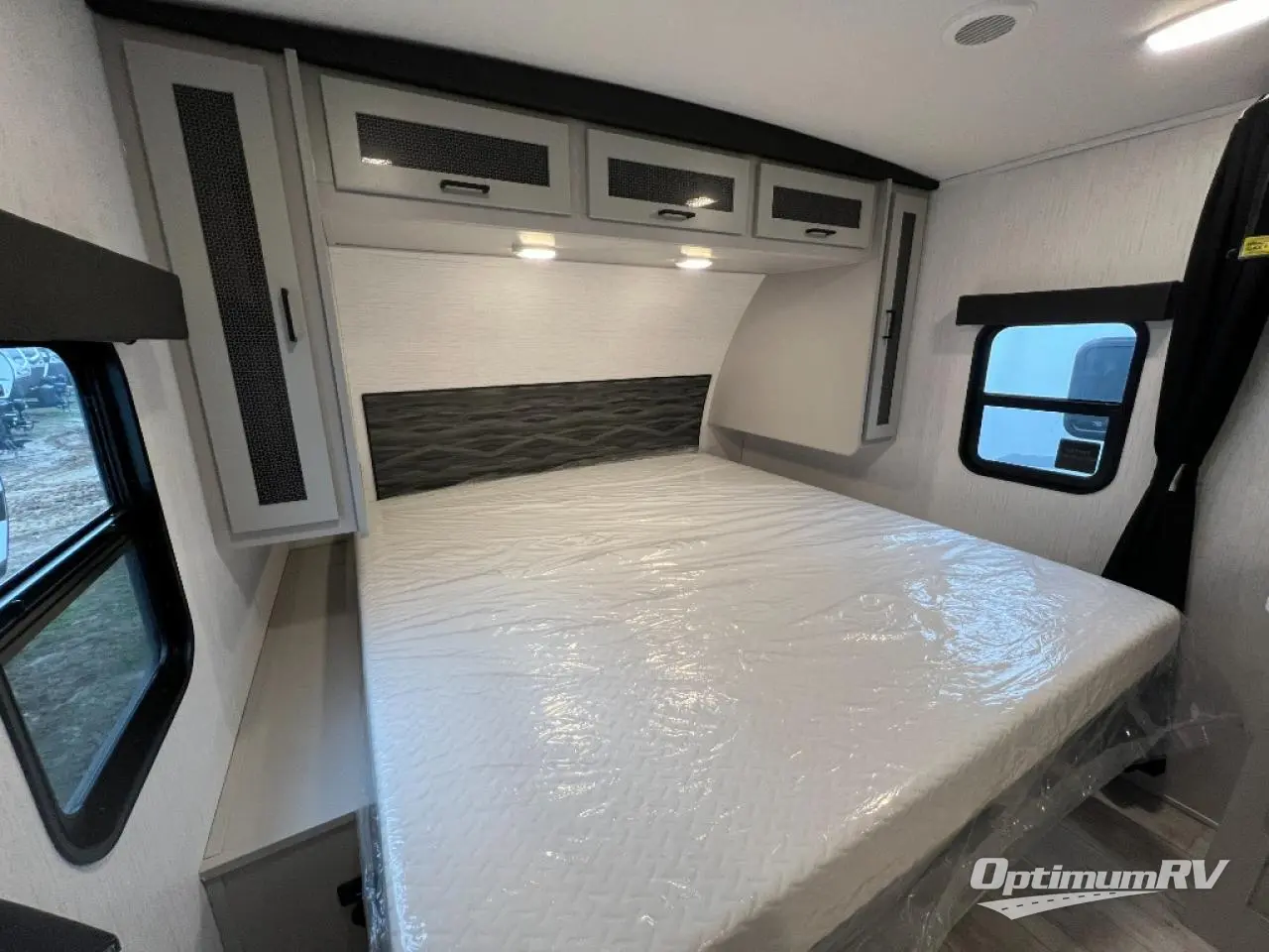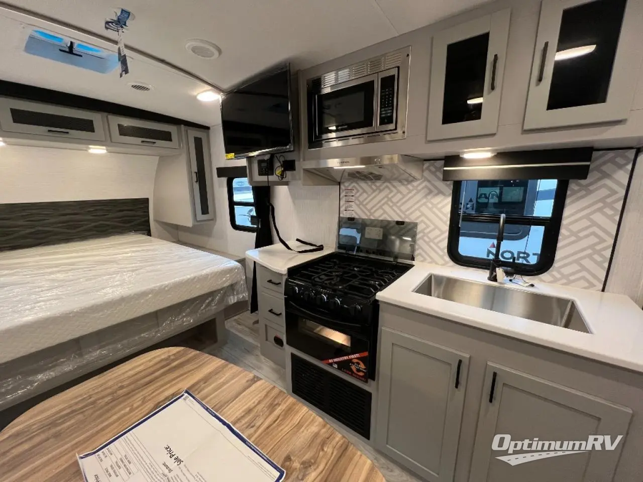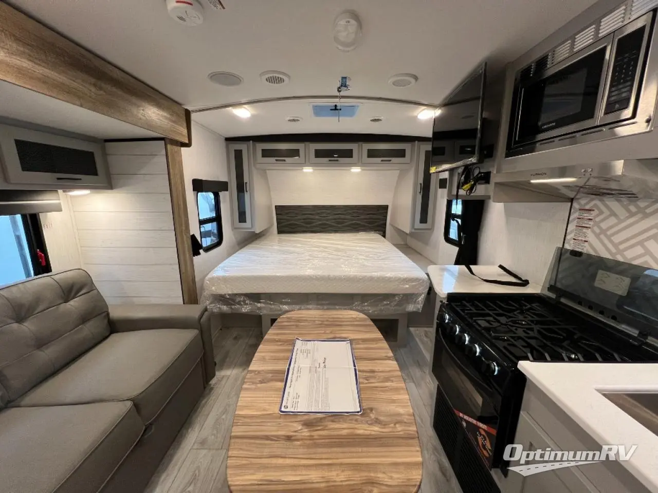 This is the perfect couple's trailer for your weekend excursions. You will love having your own king bed up front that also includes a privacy curtain. The sofa with a table will provide a place to dine at each day, and an overnight guest can sleep here as well. You'll find a three burner cooktop and a microwave oven in the kitchen, as well as a stainless steel sink and a pantry for snacks. After dinner, head outdoors to relax under the 12' power awning LED lights before turning in for the night.