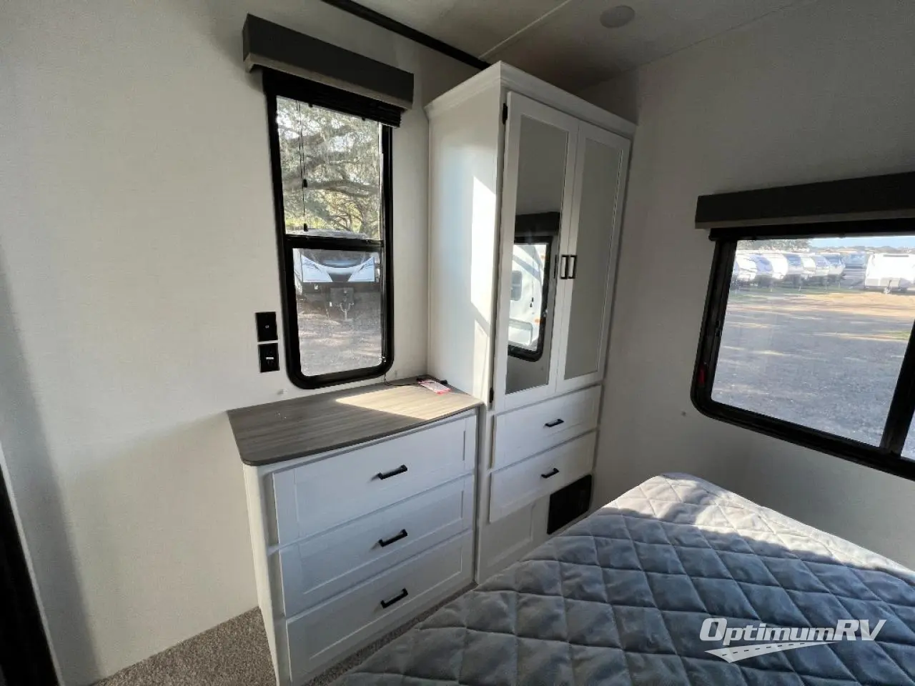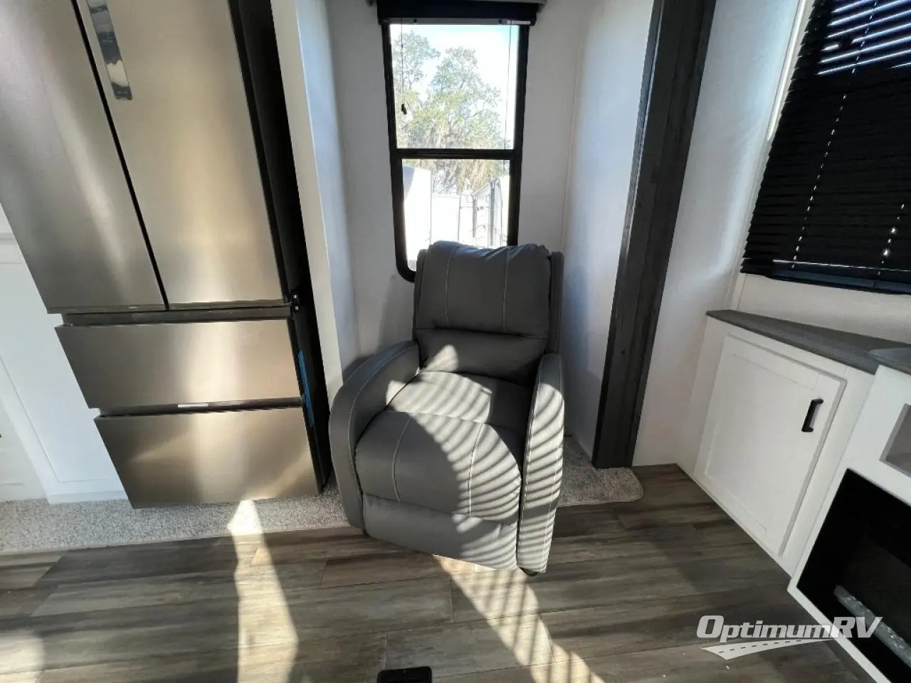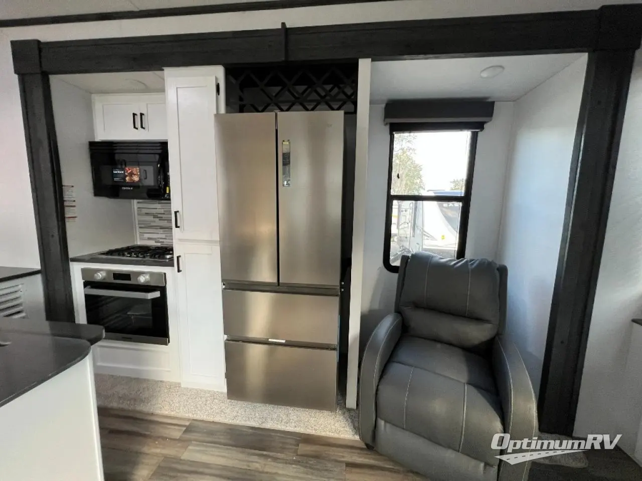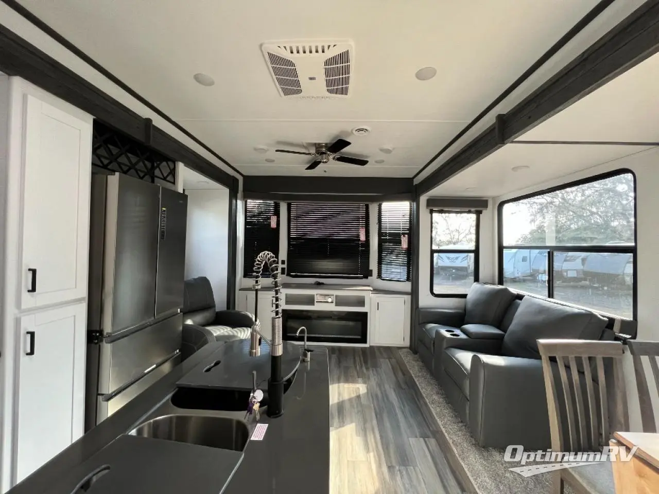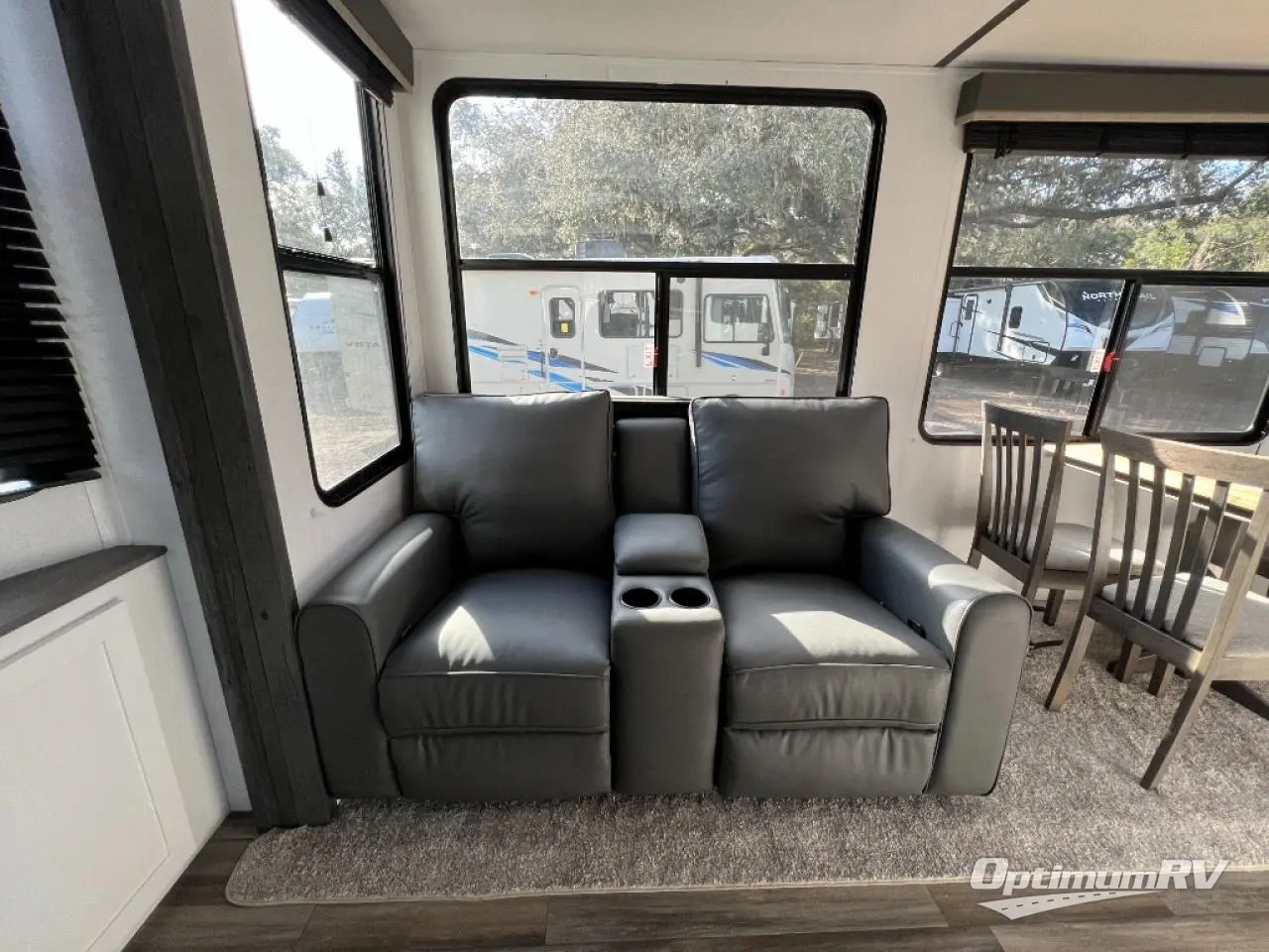 If you are planning on staying for an extended period in any one place, then you must take a look at this Keystone Retreat destination trailer. You have an entertainment center in the front with plenty of seating options for your guests to relax in when they come to visit, like the sofa sleeper, the recliner, or the free-standing table with chairs. There is even a place for them to sleep if they want to spend the night with the second bedroom. You as the owners will have your own private master suite in the rear where there is a queen-size bed for a good night's rest and a place for your things in the armoire and vanity. You will also have your own private entry into the bathroom for convenience at night. On top of all of that, this model comes with the optional Luxury Package and includes brilliant additional features!