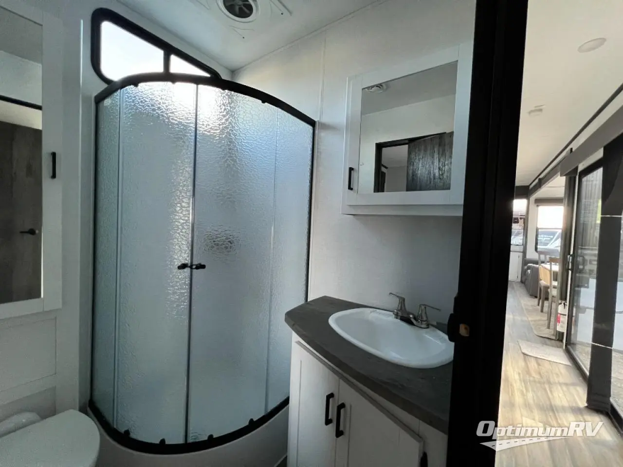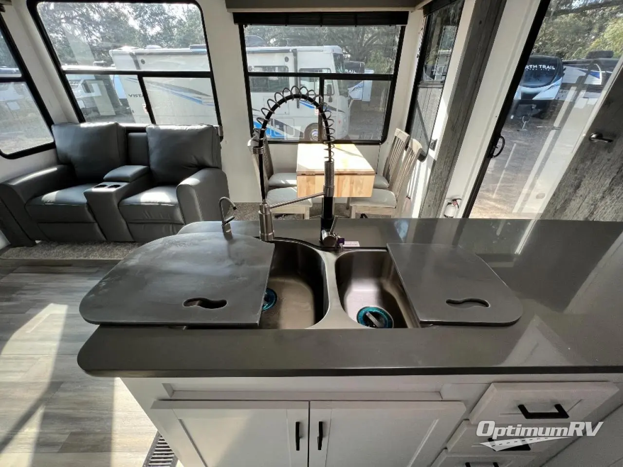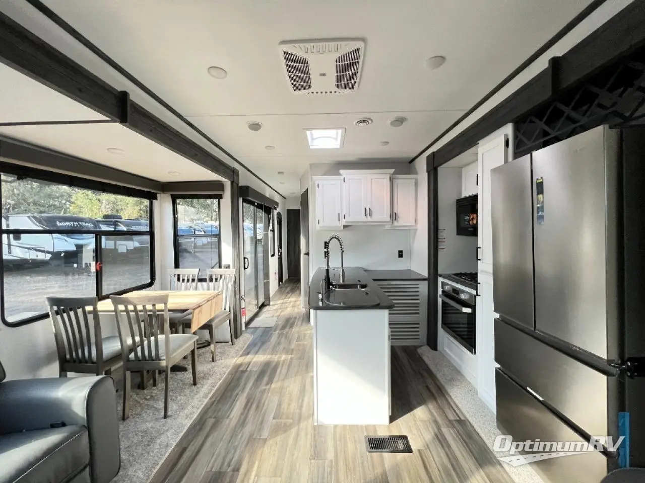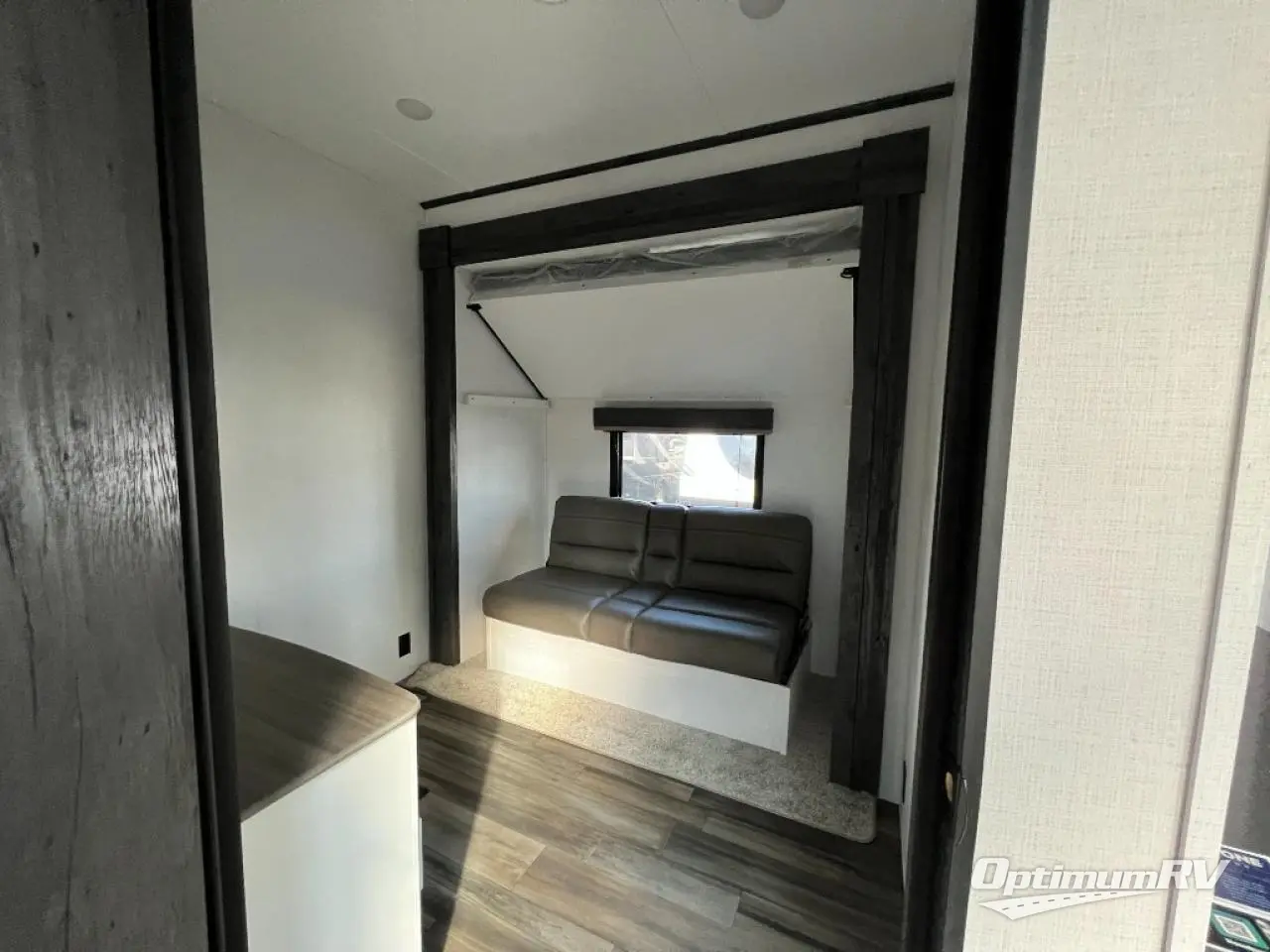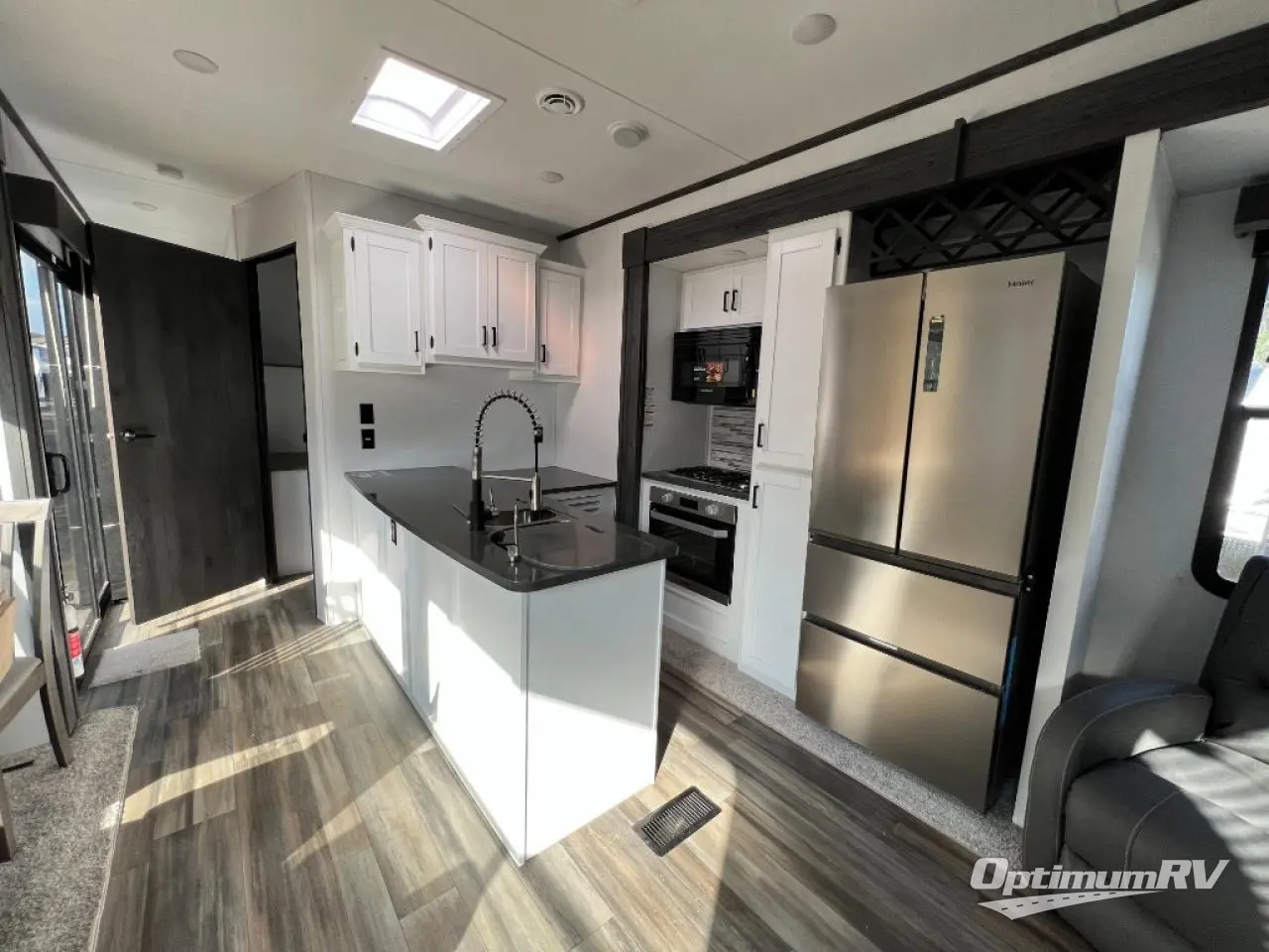 If you are planning on staying for an extended period in any one place, then you must take a look at this Keystone Retreat destination trailer. You have an entertainment center in the front with plenty of seating options for your guests to relax in when they come to visit, like the sofa sleeper, the recliner, or the free-standing table with chairs. There is even a place for them to sleep if they want to spend the night with the second bedroom. You as the owners will have your own private master suite in the rear where there is a queen-size bed for a good night's rest and a place for your things in the armoire and vanity. You will also have your own private entry into the bathroom for convenience at night. On top of all of that, this model comes with the optional Luxury Package and includes brilliant additional features!