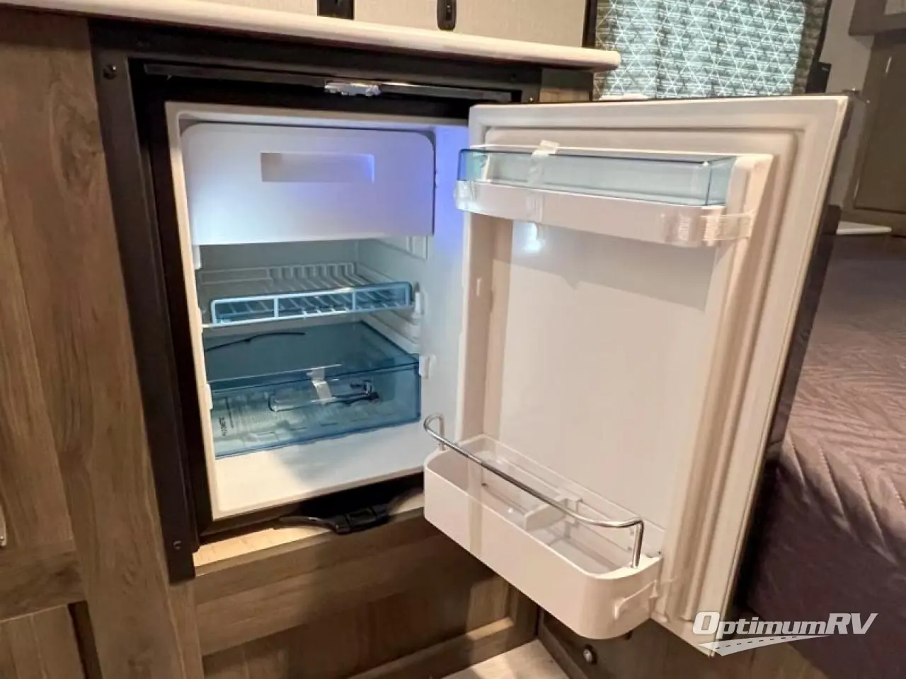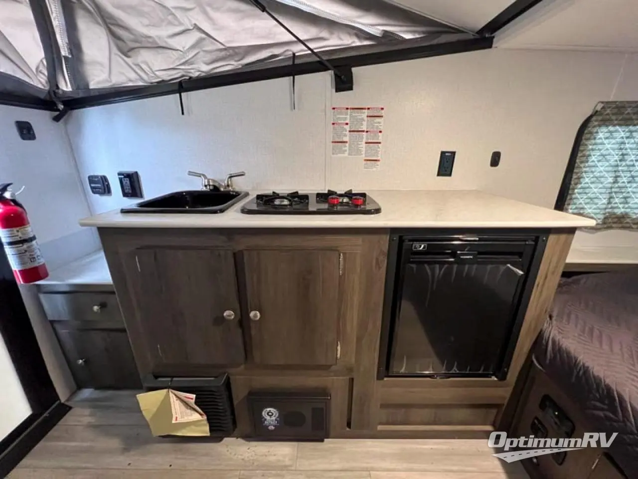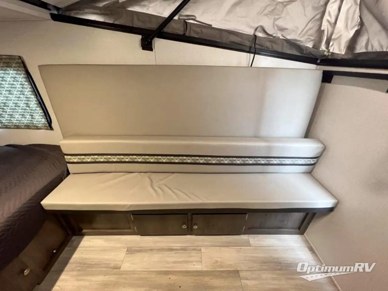 You can take this Viking Express Series folding pop-up camper to any campground of your choice! There is a 1.9-cubic foot refrigerator that will allow you to bring fresh orange juice and eggs with you on your journeys, and the storage above the 60" x 74" bed will hold personal belongings. There is another storage area to the right of the entry door, and this flip-lid storage can hold additional gear. Stay cool with an air conditioner, and use the gaucho bed as a lounge space or sleep space.