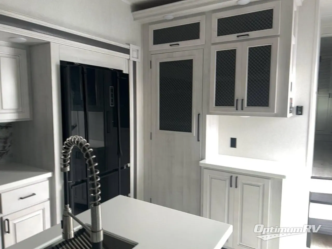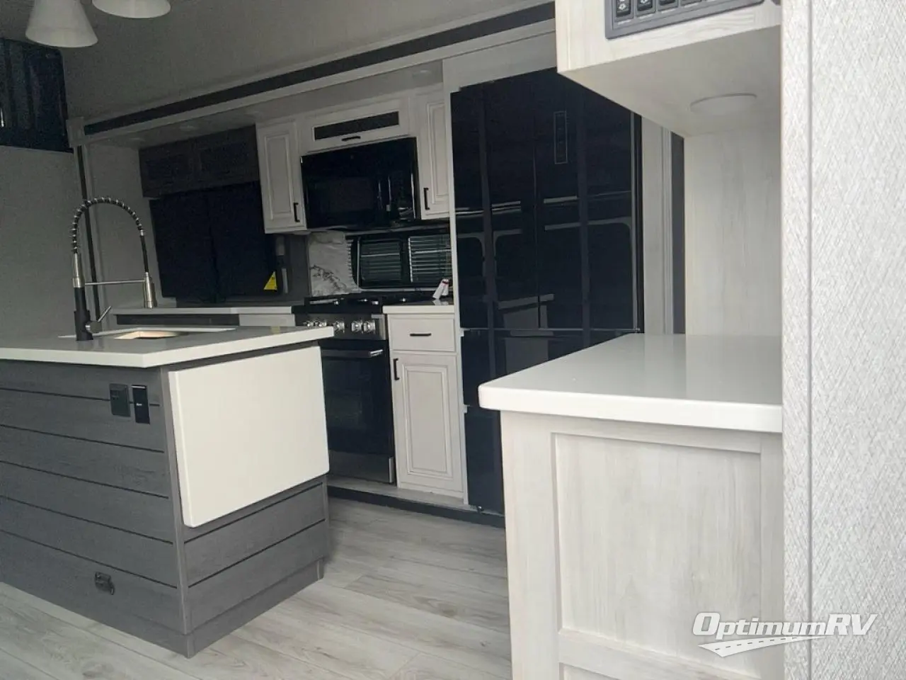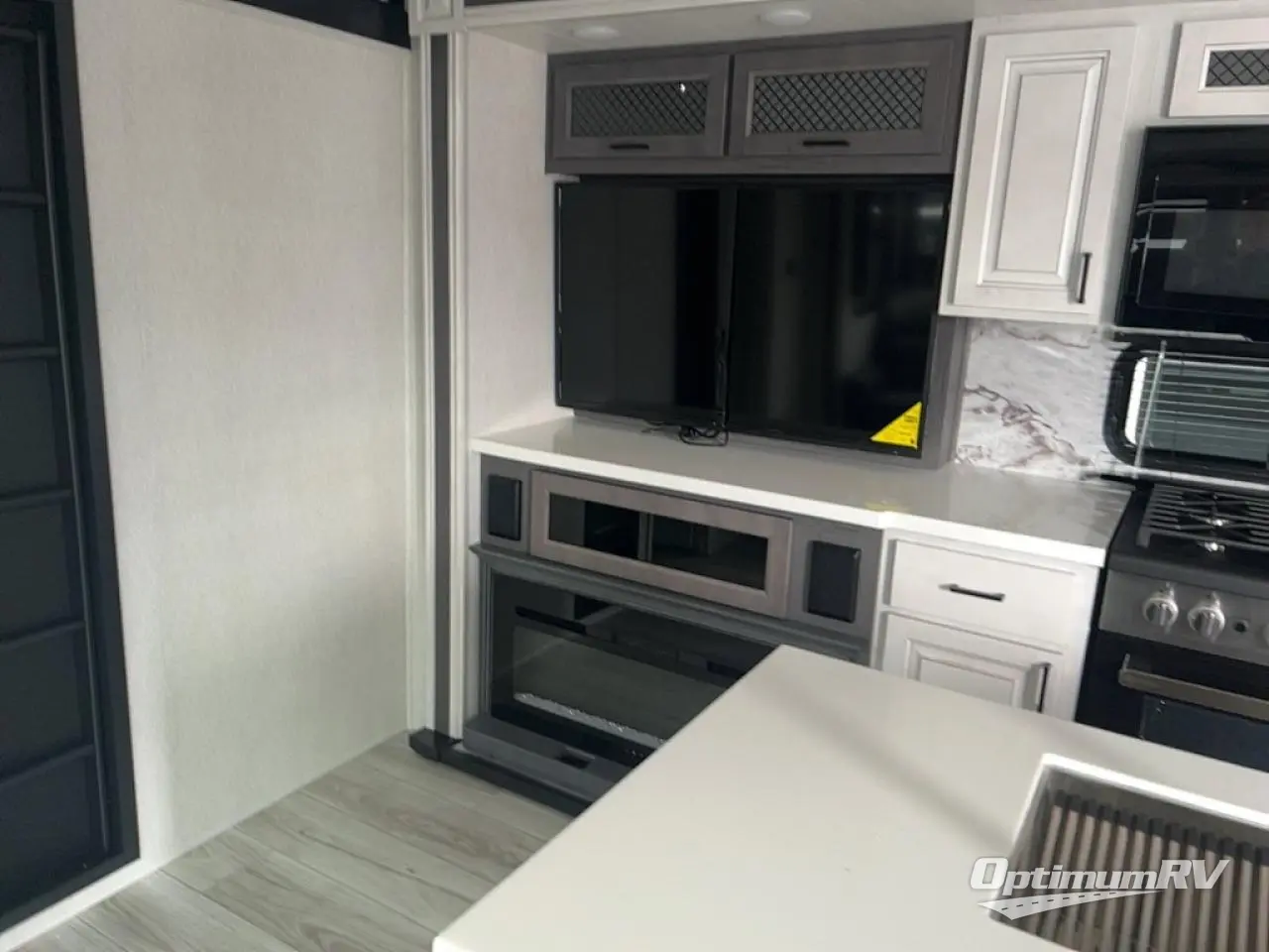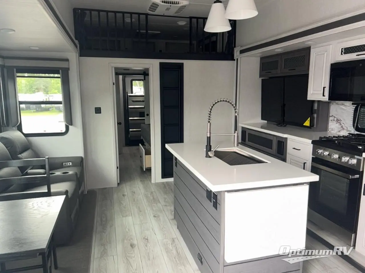 If you're looking for a luxury fifth wheel with more space for friends and family, you've found it in this Ahara! The main entry door opens up to the living area with dual opposing slides, a 50" LED TV with a fireplace, plus a full kitchen with residential appliances, a hutch, and even a pantry for dry goods and snacks. Everyone can meet here in the evenings to dine at the free-standing dinette with a storage ottoman or relax on the theater seating. You'll love the rear master suite with its king bed slide out, drawers under the bed, and full rear bath with the unique rear second entry door. And check out the Ahara Sky Suite loft above this room for even more sleeping or storage space! Your guests will find the front private bedroom to be accommodating since it includes a king bed slide out, drawers under the bed, pus a large wardrobe to keep clothes tidy. There is also a closet with washer and dryer pre. Who knows, you may just choose this bedroom for your own!