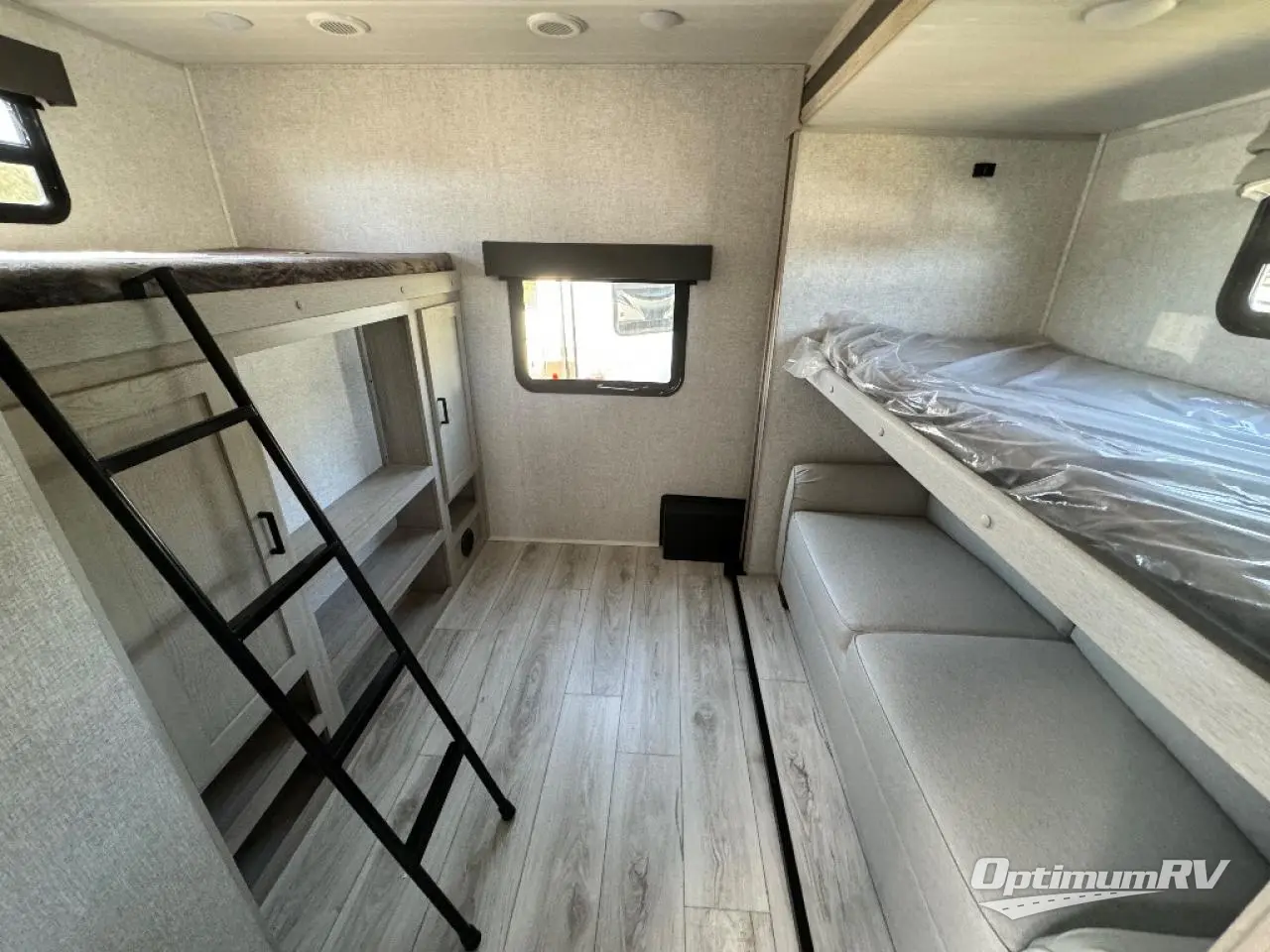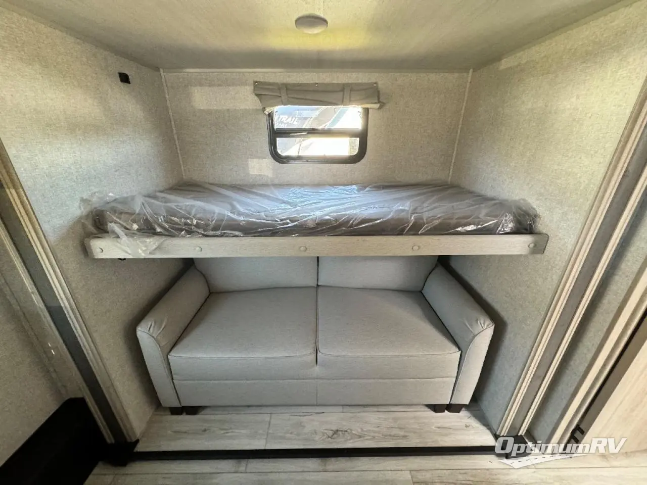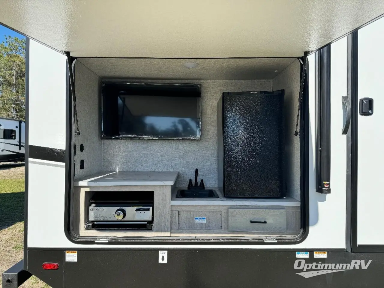 If you're looking for a travel trailer to take tailgating, this Alta model is the one! After you've unloaded the pass-through storage and set up the 21' power awning, start lunch on the outside kitchen! Since there are dual entry doors you can enter in through the main living area, or the full bath for convenience. The little ones are sure to spend most of their time in the rear bunkhouse that includes a flip-up bunk under the sofa, plus a second bunk across the room. The adults can visit at the booth dinette or on the tri-fold sofa, and check out the front private bedroom with sliding doors and a king bed for all-around comfort!