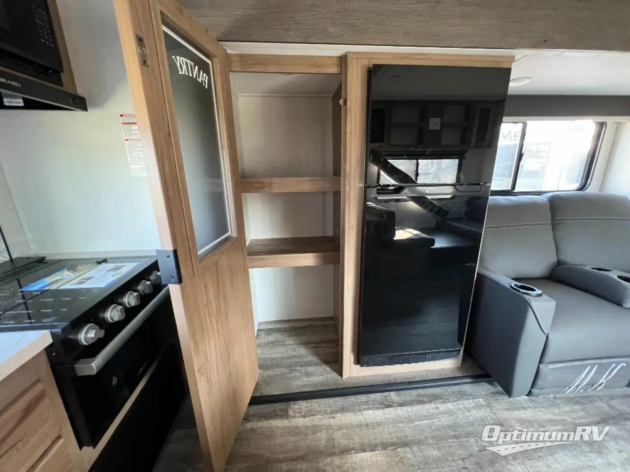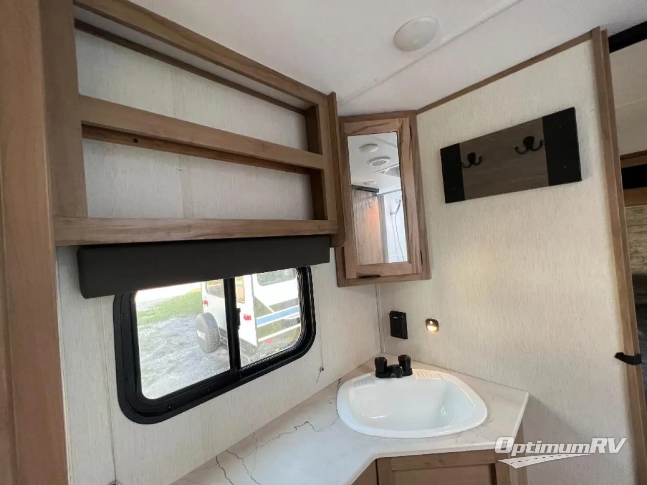 You and your spouse will have a comfortable time camping in this travel trailer! The front private bedroom has a queen bed with wardrobes on either side of it, plus one of the dual entry doors to the unit. As you leave the bedroom, you will enter the walk-through bathroom which has a shower with a skylight above and a removable clothes hanging rod to dry off your swimsuit after swimming in the lake. The chef can prepare their best home cooked meals in the rear kitchen, and you can enjoy them at the booth dinette before storing any leftovers in the 12V refrigerator. The theater seating has cupholders so you can enjoy a beverage while you read your favorite book!