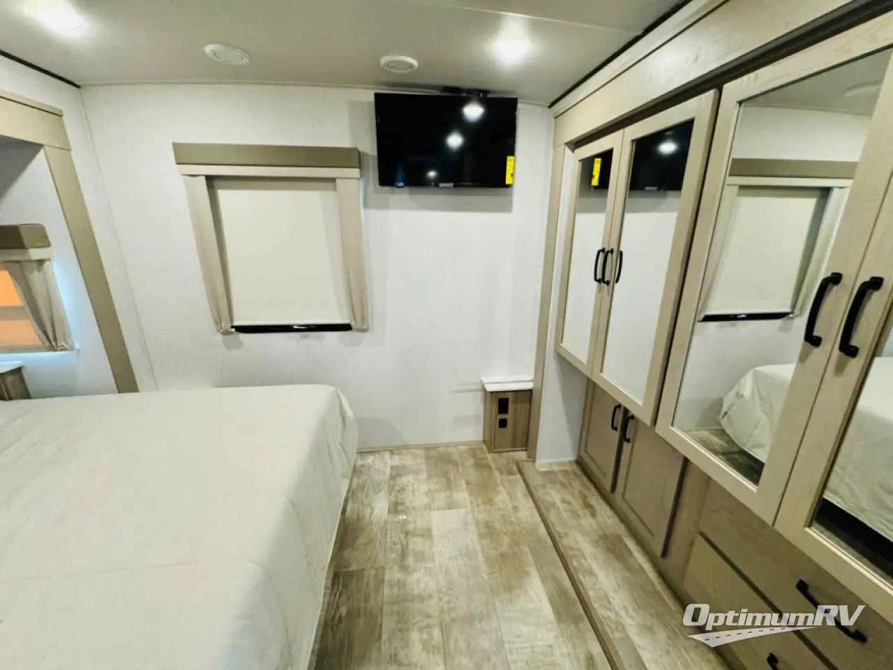 This travel trailer can be used as a couple's coach or a family getaway! The rear private bedroom has a queen bed slide to lay your head on at night with an optional TV to watch movies in bed, plus a wardrobe/linen closet slide to store your clothes. Within that same slide you will find a 72" x 30" flip-up bunk bed above a 32" dinette which can be transformed into a second bed. Everyone can freshen up in the full bathroom which includes a shower with a seat, toilet and vanity with sink. The front kitchen offers a u-shaped counter and full amenities to whip up meals and snacks while you camp. You could even use the outdoor griddle to enjoy breakfast outside under the 21' awning at sunrise!