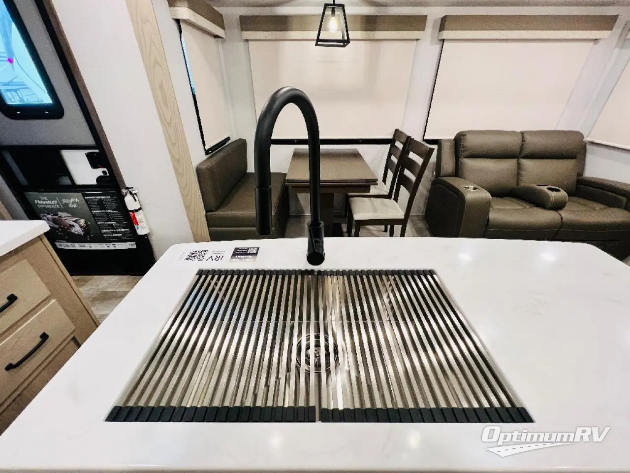 The large windows in the rear and door side slide will bring nature's scenery indoors with this travel trailer! Everyone can relax together in the rear living area featuring a 76" hide-a-bed sofa and 60" theater seating across from the entertainment center with a fireplace. Meal prepping will be even easier with the kitchen island, and the 39" booth dinette is a comfortable place to enjoy your meals. The full bathroom has a shower with a seat and a linen closet to keep your towels close. You will feel well rested each morning after sleeping on the king bed slide in the front private bedroom which also has a wardrobe with washer and dryer prep and an area to add an optional TV!