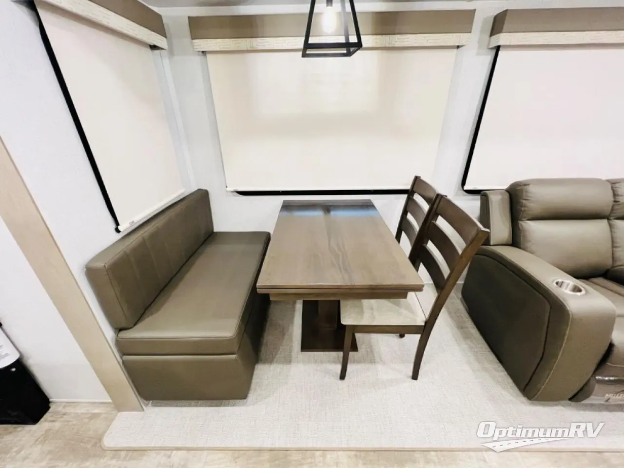 The large windows in the rear and door side slide will bring nature's scenery indoors with this travel trailer! Everyone can relax together in the rear living area featuring a 76" hide-a-bed sofa and 60" theater seating across from the entertainment center with a fireplace. Meal prepping will be even easier with the kitchen island, and the 39" booth dinette is a comfortable place to enjoy your meals. The full bathroom has a shower with a seat and a linen closet to keep your towels close. You will feel well rested each morning after sleeping on the king bed slide in the front private bedroom which also has a wardrobe with washer and dryer prep and an area to add an optional TV!