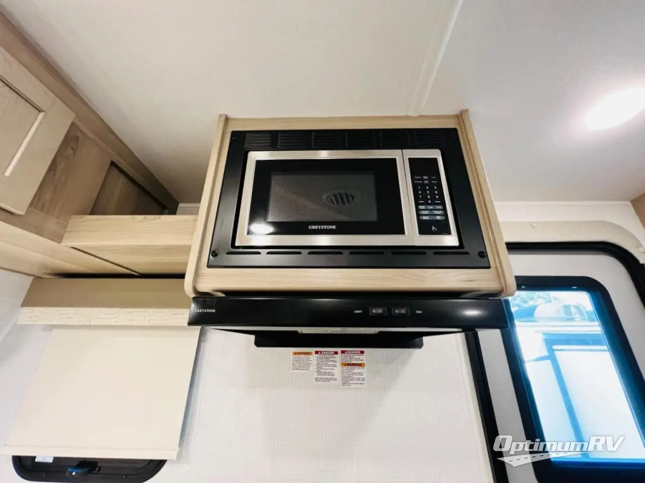 This Flagstaff Micro Lite travel trailer is going to make your camping dreams come true! With a queen bed slide and a large wardrobe in the private bedroom, you will have all that you need for sleeping and storing your belongings. Plus, the second exterior entry door leads right into the bedroom so that you can escape for an early morning run without running through the entire trailer to get outside. The front kitchen is open and accommodating with its helpful tools, and the 67" theater seat is right next to the 12V refrigerator on the slide out. Right next to the front entry door is a coat closet/pantry so you can keep your jackets readily available, and there is also a linen closet in the walk-through bath so that you can keep your towels ready for your shower.