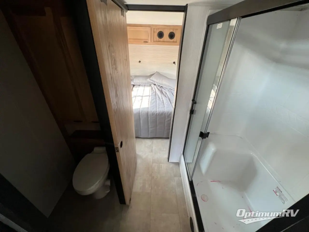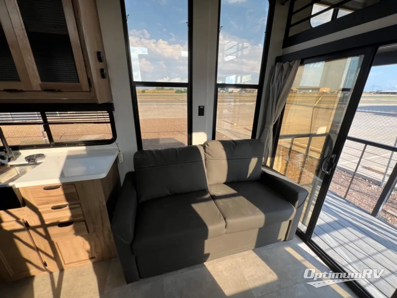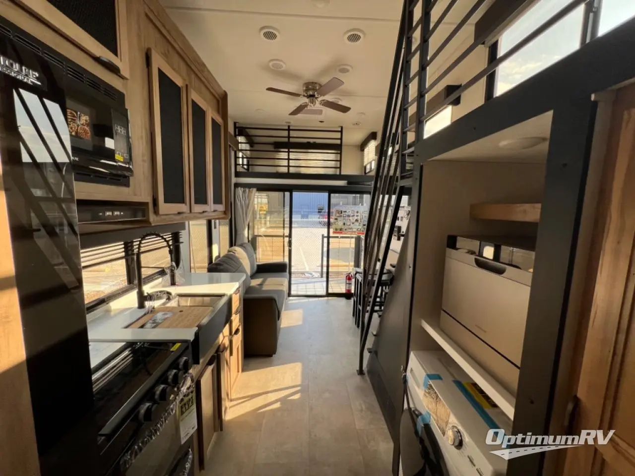 This model is similar to Timberwolf 16ML but larger! A bigger bathroom, king bed in the lower master, and two queen bunk mats in the upper loft. There is an 18 cu. ft. refrigerator so you can stock up for a week long vacation. There is also a sofa that can transform into added sleeping for guests, and there is a high top table that can collapse against the wall with two stools which is perfect for snacks or a game, but can also be out of the way when you don't need it. A ladder allows access into the upper front loft that is over the covered patio. The bathroom below is split with a shower on one side, and a private toilet area and sink opposite. And the view is amazing from just about anywhere inside.