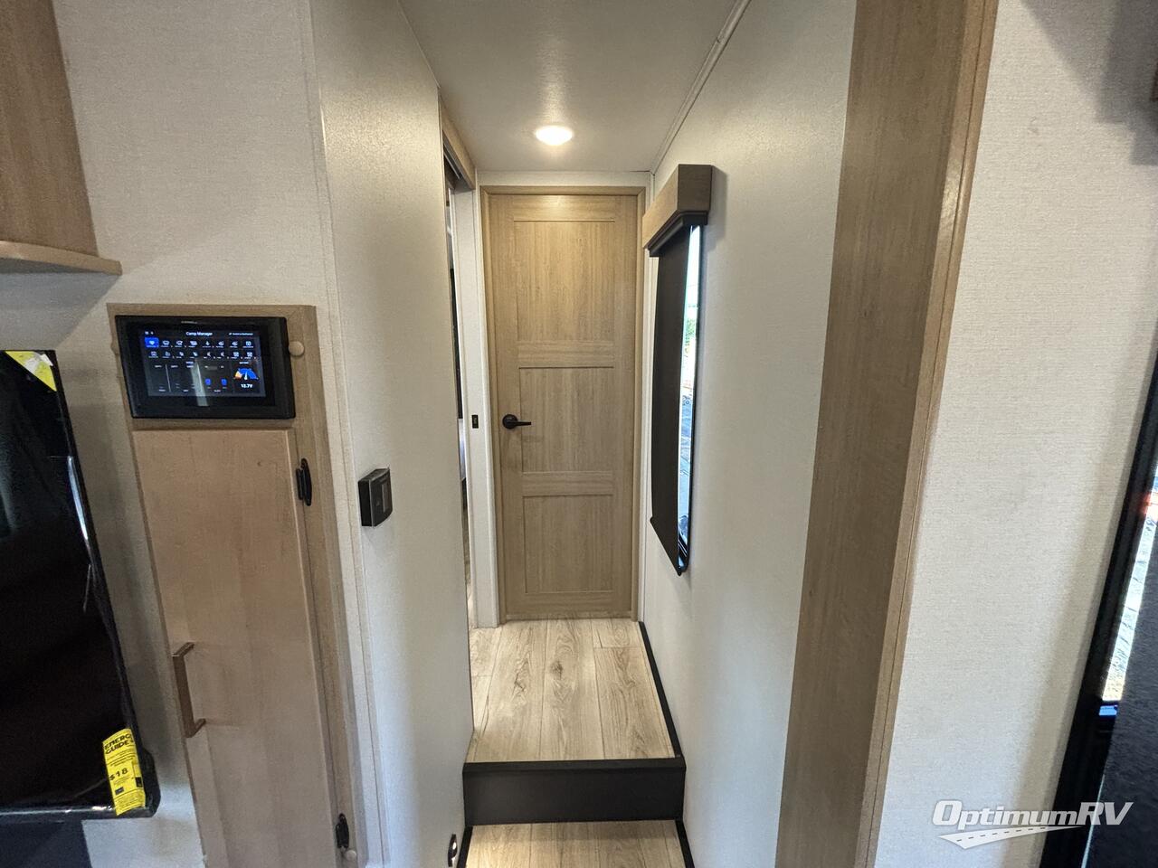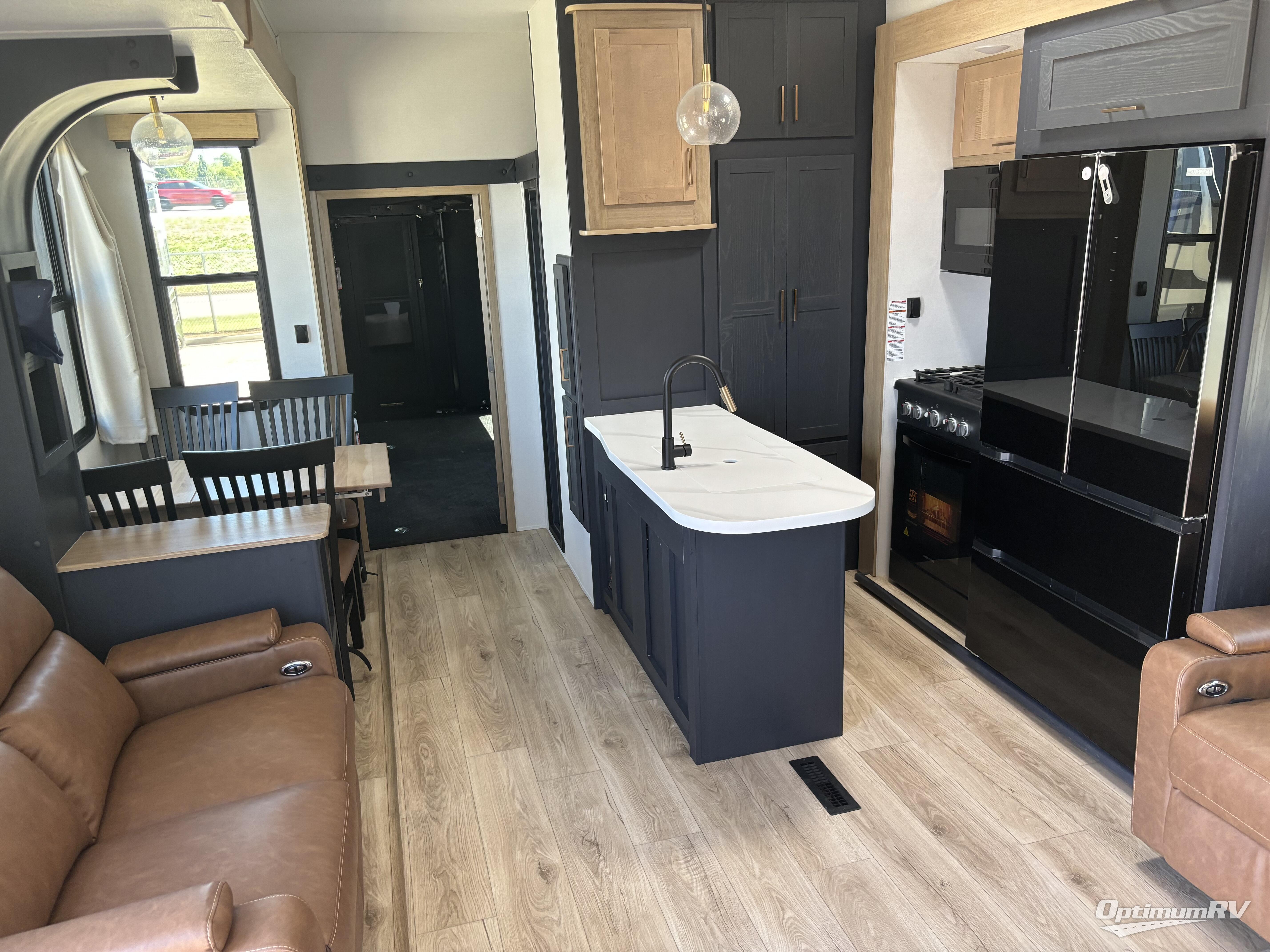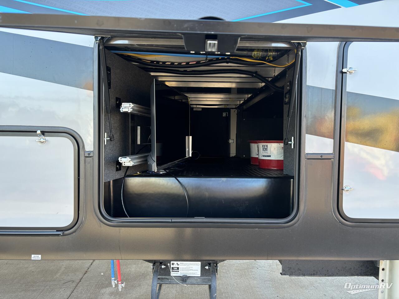 This toy hauler with two full bathrooms is a clean decision! You can prepare delicious home cooked meals for everyone in the fully equipped kitchen with island peninsula for plenty of prepping space, plus there is a hutch to store your dishes. The garage has a bathroom with a neo-angled shower so mud doesn't get tracked throughout the rest of the unit and two loft areas for extra sleeping space. With two awnings, you are sure to stay protected rain or shine and one of the awnings even protects the Grill N Go three burner griddle combo. Enjoy a good night's rest on the tilting king bed slide, keep your clothes looking their best with the front wardrobe, and the washer and dryer prep give you the option to make laundry day easier than ever. You will also have quick access into the dual entry bath!