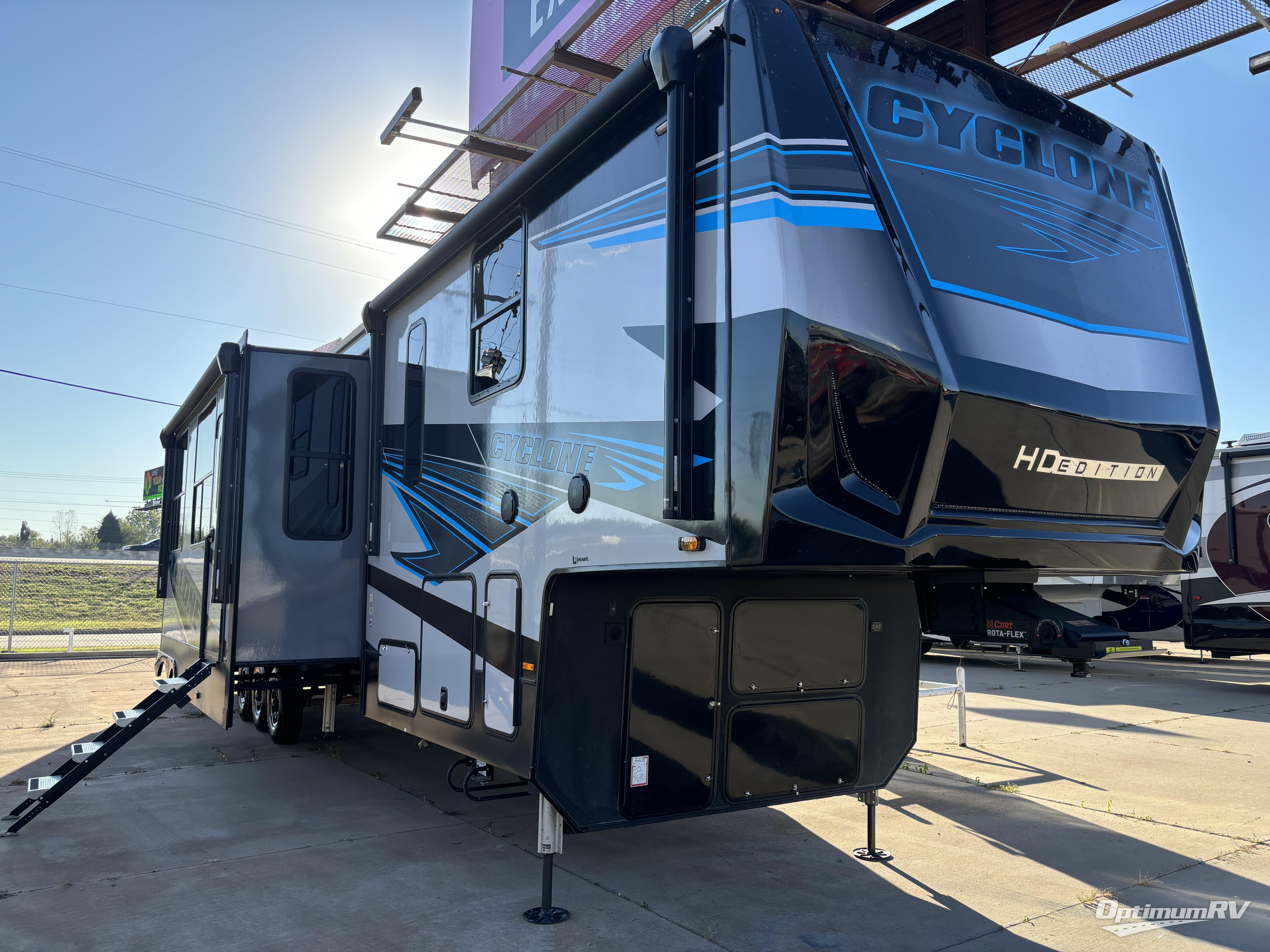 Satisfy your wanderlust with a Heartland Cyclone fifth wheel toy hauler! You won't have to sacrifice any luxury either with indulgent features like the king bedroom suite with an exclusive East to West bed tilt system with 30% more floor space, Stor-Mor three-sided access to the basement with 30% more storage capacity, and Step Caddy folding patio step for better stability as you enter or exit the patio. The industry first Grill and Go 25" residential pull out 3 burner griddle combo comes on models with an exterior kitchen for an easier cooking experience. Full height shaker cabinetry provides 25% more storage space so you can bring more camping necessities with you. If you like to dry camp longer then you will appreciate the industry's largest 150 gallons fresh water tanks. Come find the perfect model for you today!