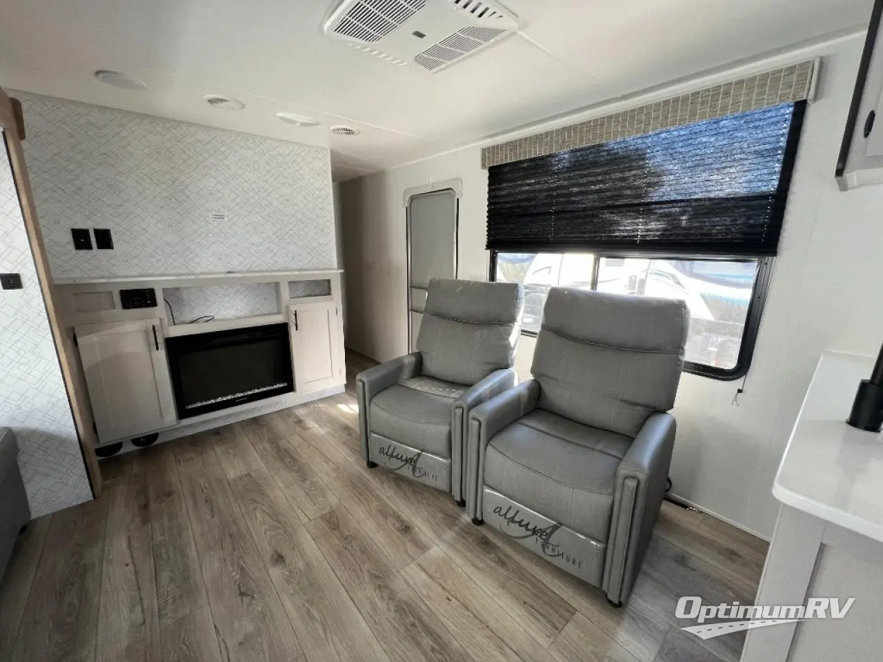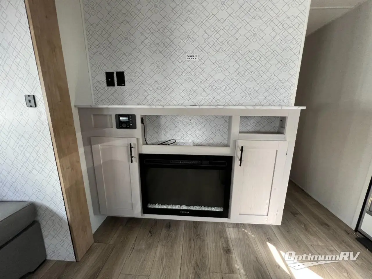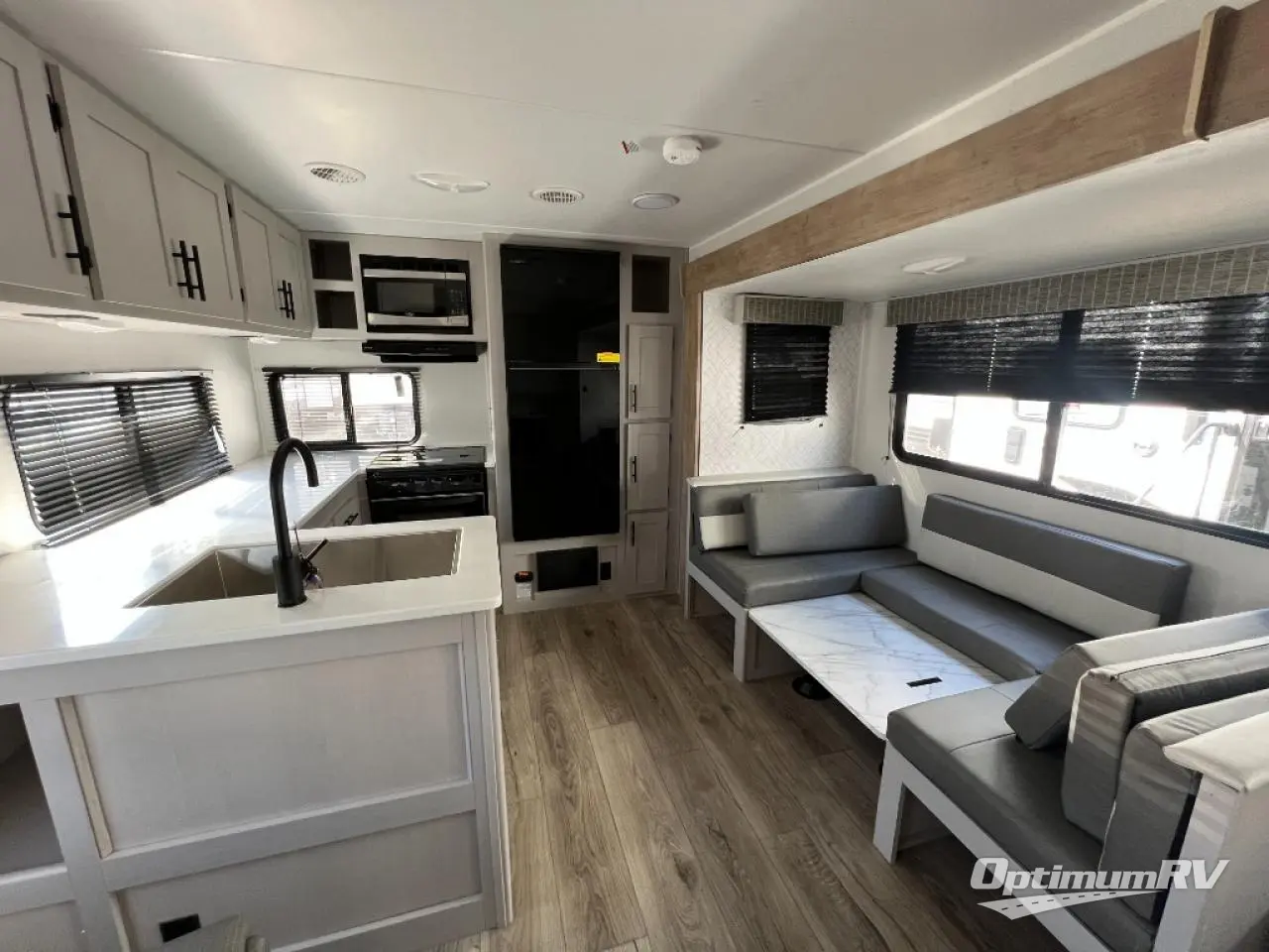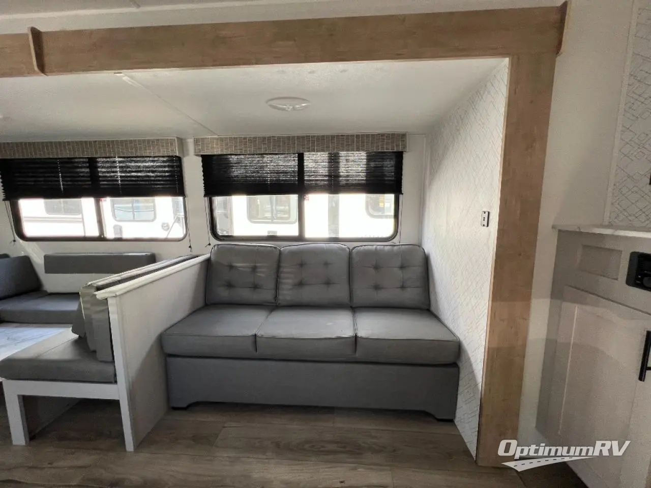 You will feel right at home with this travel trailer! The rear kitchen has plenty of countertop space to prepare your best home cooked meals. The U-shaped dinette is not only great for enjoying meals and playing games, but also for transforming into an extra sleeping space. Relax in true comfort each night on one of the two recliners or sofa by the TV prepped area. Freshen up after a fun filled day with the shower, and then head to the front private bedroom and get a good night's rest on the queen bed. You can even cook in the great outdoors with the outside kitchen that comes with a griddle and refrigerator to enjoy a cold beverage while you flip burgers!
