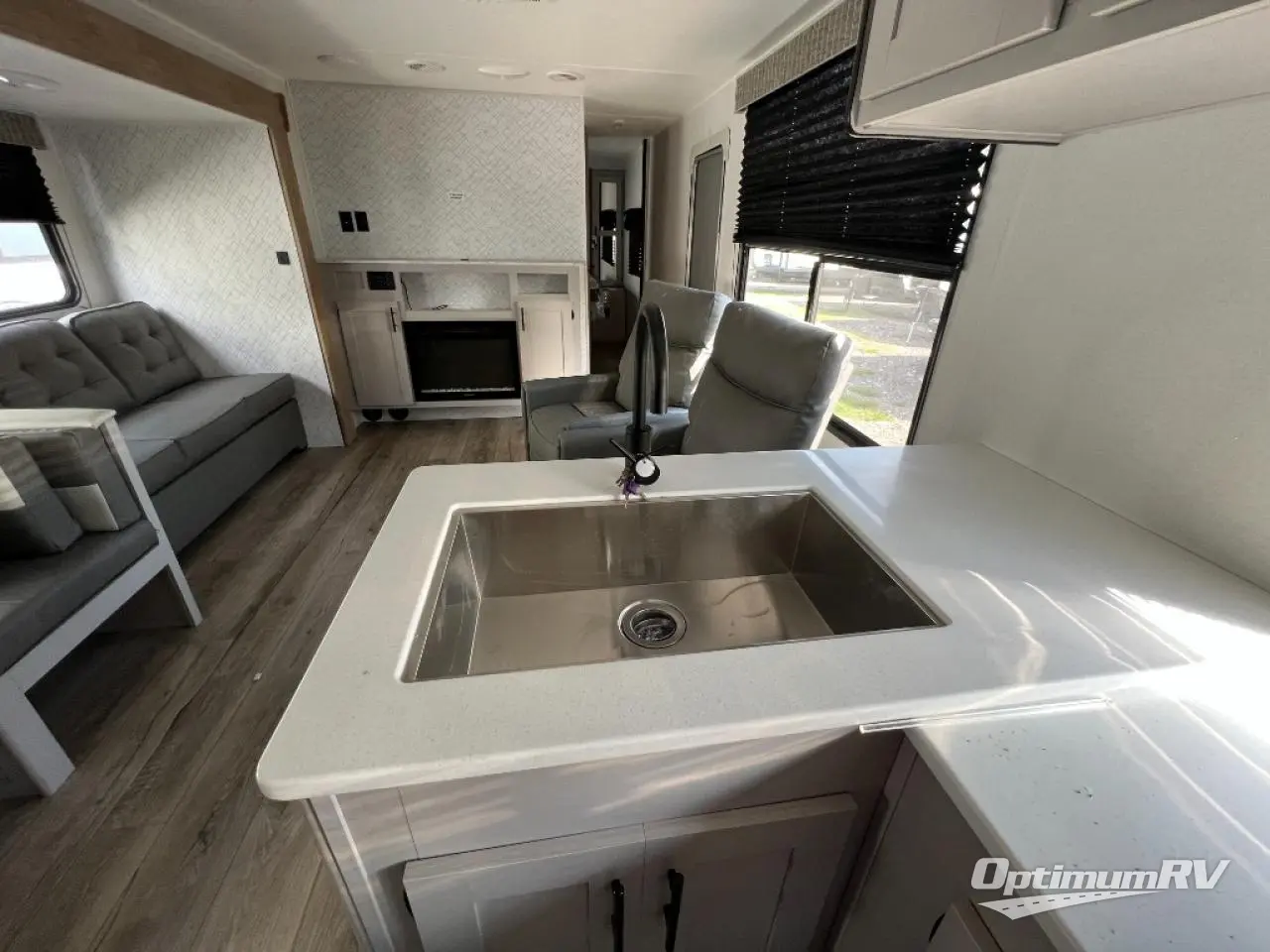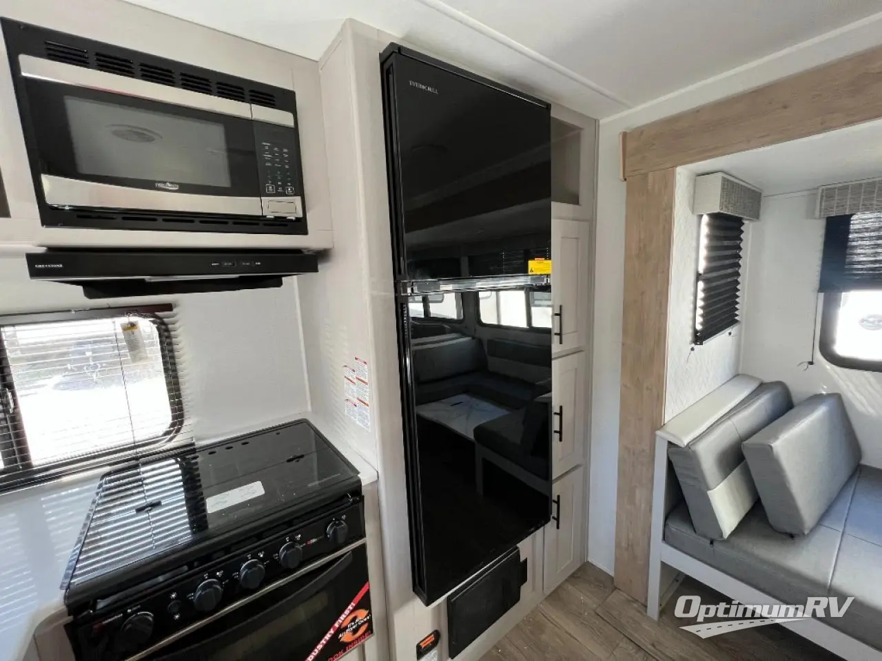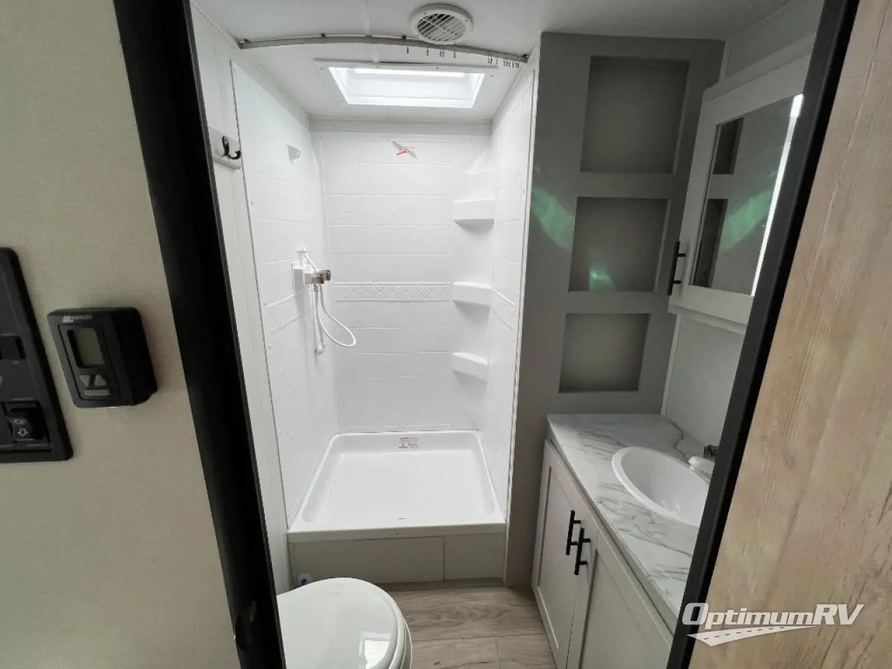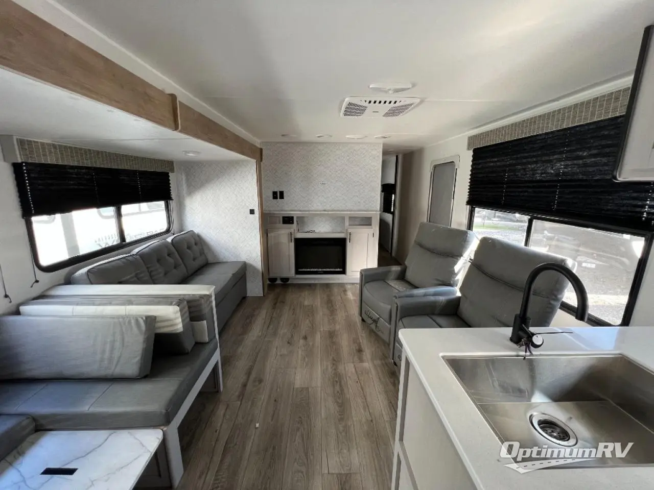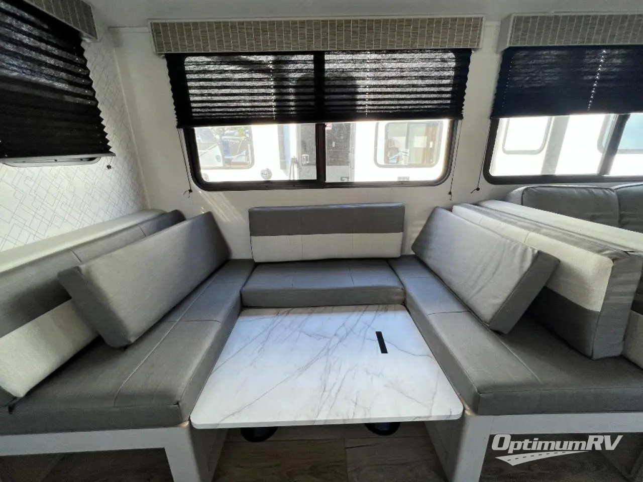 You will feel right at home with this travel trailer! The rear kitchen has plenty of countertop space to prepare your best home cooked meals. The U-shaped dinette is not only great for enjoying meals and playing games, but also for transforming into an extra sleeping space. Relax in true comfort each night on one of the two recliners or sofa by the TV prepped area. Freshen up after a fun filled day with the shower, and then head to the front private bedroom and get a good night's rest on the queen bed. You can even cook in the great outdoors with the outside kitchen that comes with a griddle and refrigerator to enjoy a cold beverage while you flip burgers!