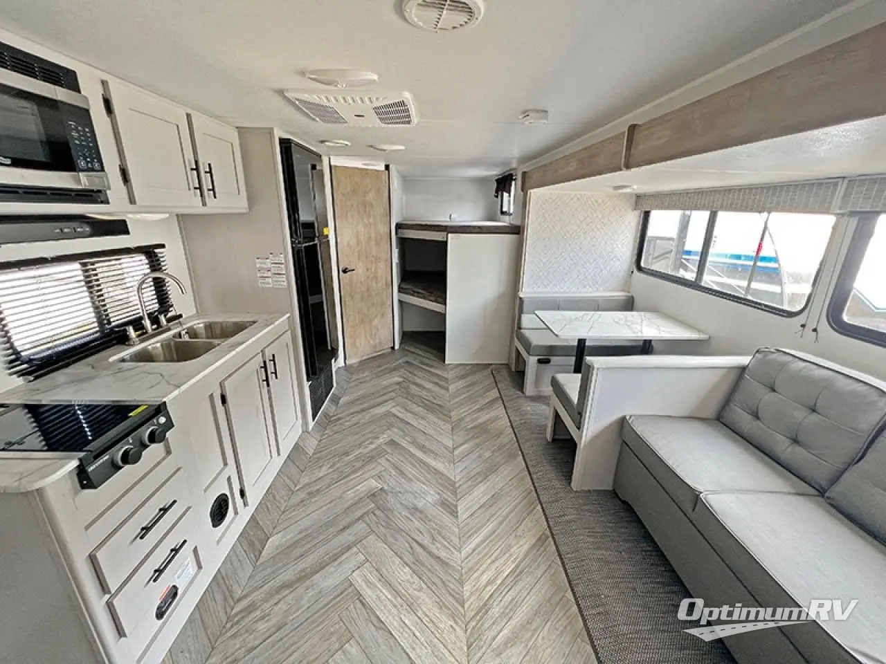 This Prowler Lynx is perfect for any larger family or one that likes to travel with friends! This bunk model features double bed sized bunks to sleep four, plus a private bedroom in front for two with dual wardrobes for your things. A dinette and sofa slide creates more interior space inside, plus provides ample seating for everyone. Both can also be transformed into added sleeping when needed. The kitchen is fully equipped to create meals and snacks inside while you camp if you do not enjoy cooking over an open fire, and the dual entry doors will make it easy and convenient to load and unload, with one door leading directly into the full bath which features a shower, toilet, and vanity with sink.
