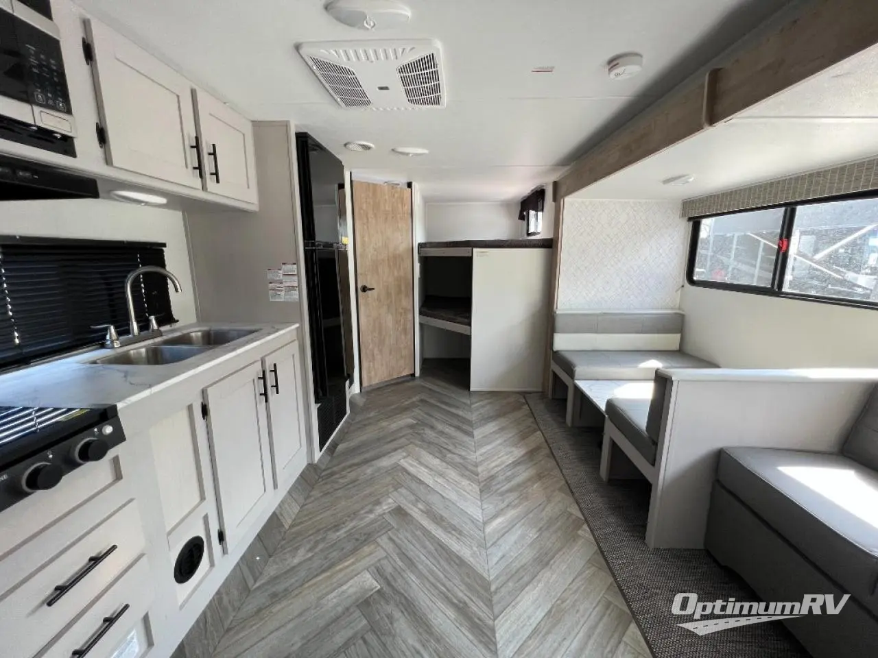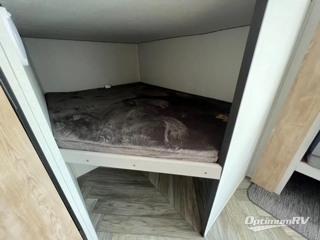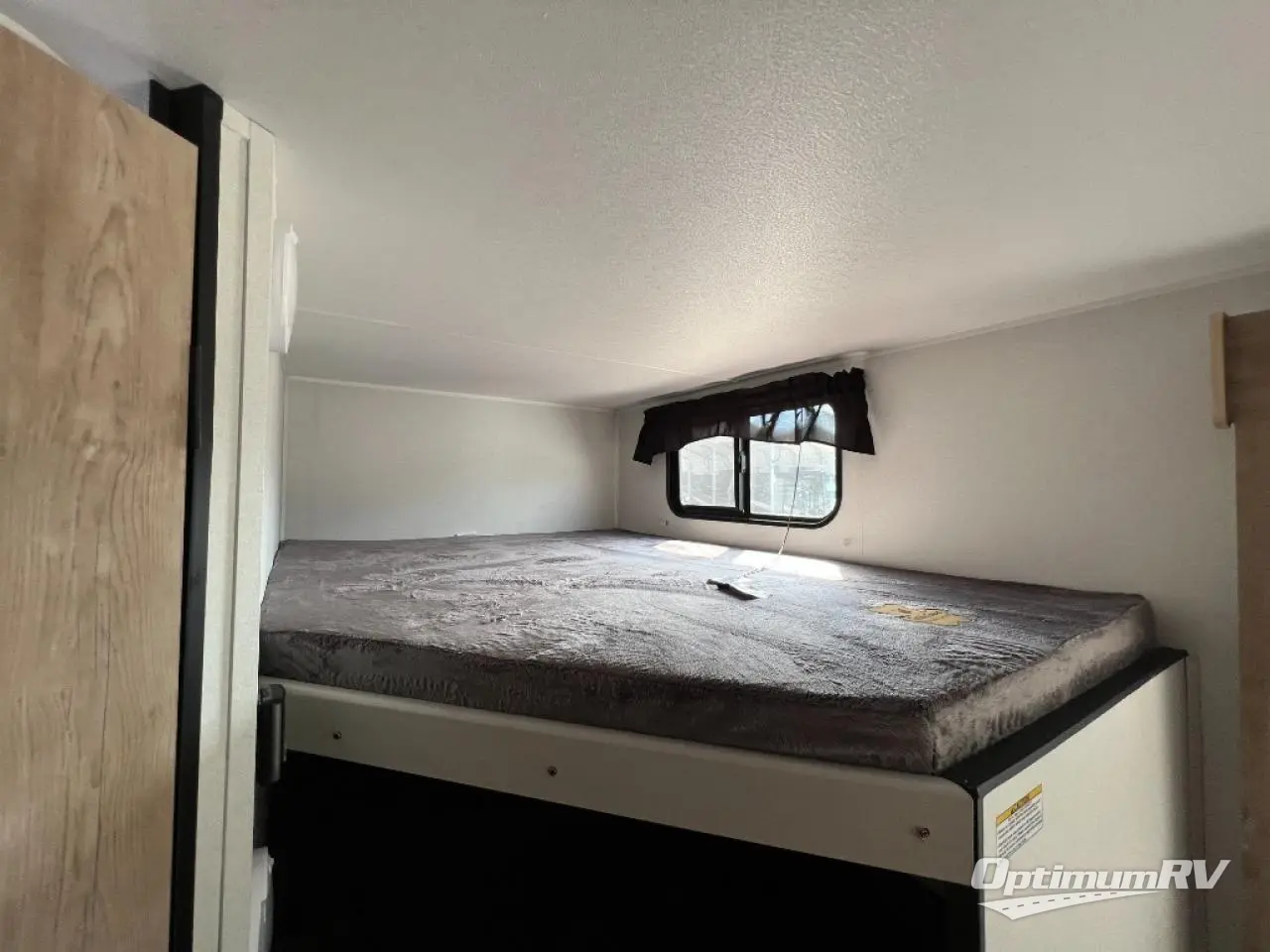 This Prowler Lynx is perfect for any larger family or one that likes to travel with friends! This bunk model features double bed sized bunks to sleep four, plus a private bedroom in front for two with dual wardrobes for your things. A dinette and sofa slide creates more interior space inside, plus provides ample seating for everyone. Both can also be transformed into added sleeping when needed. The kitchen is fully equipped to create meals and snacks inside while you camp if you do not enjoy cooking over an open fire, and the dual entry doors will make it easy and convenient to load and unload, with one door leading directly into the full bath which features a shower, toilet, and vanity with sink.