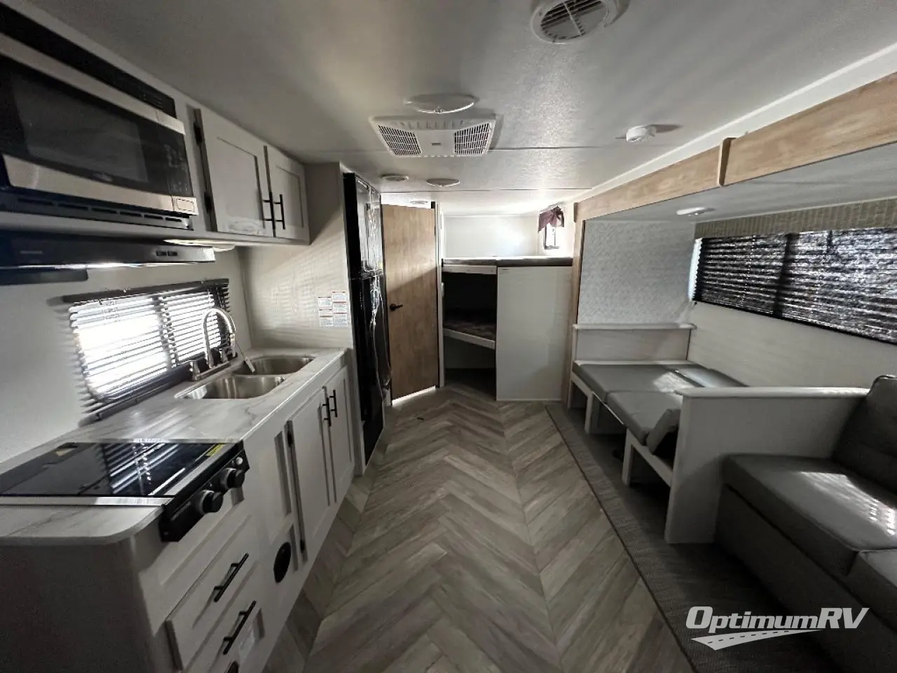 This Prowler Lynx is perfect for any larger family or one that likes to travel with friends! This bunk model features double bed sized bunks to sleep four, plus a private bedroom in front for two with dual wardrobes for your things. A dinette and sofa slide creates more interior space inside, plus provides ample seating for everyone. Both can also be transformed into added sleeping when needed. The kitchen is fully equipped to create meals and snacks inside while you camp if you do not enjoy cooking over an open fire, and the dual entry doors will make it easy and convenient to load and unload, with one door leading directly into the full bath which features a shower, toilet, and vanity with sink.