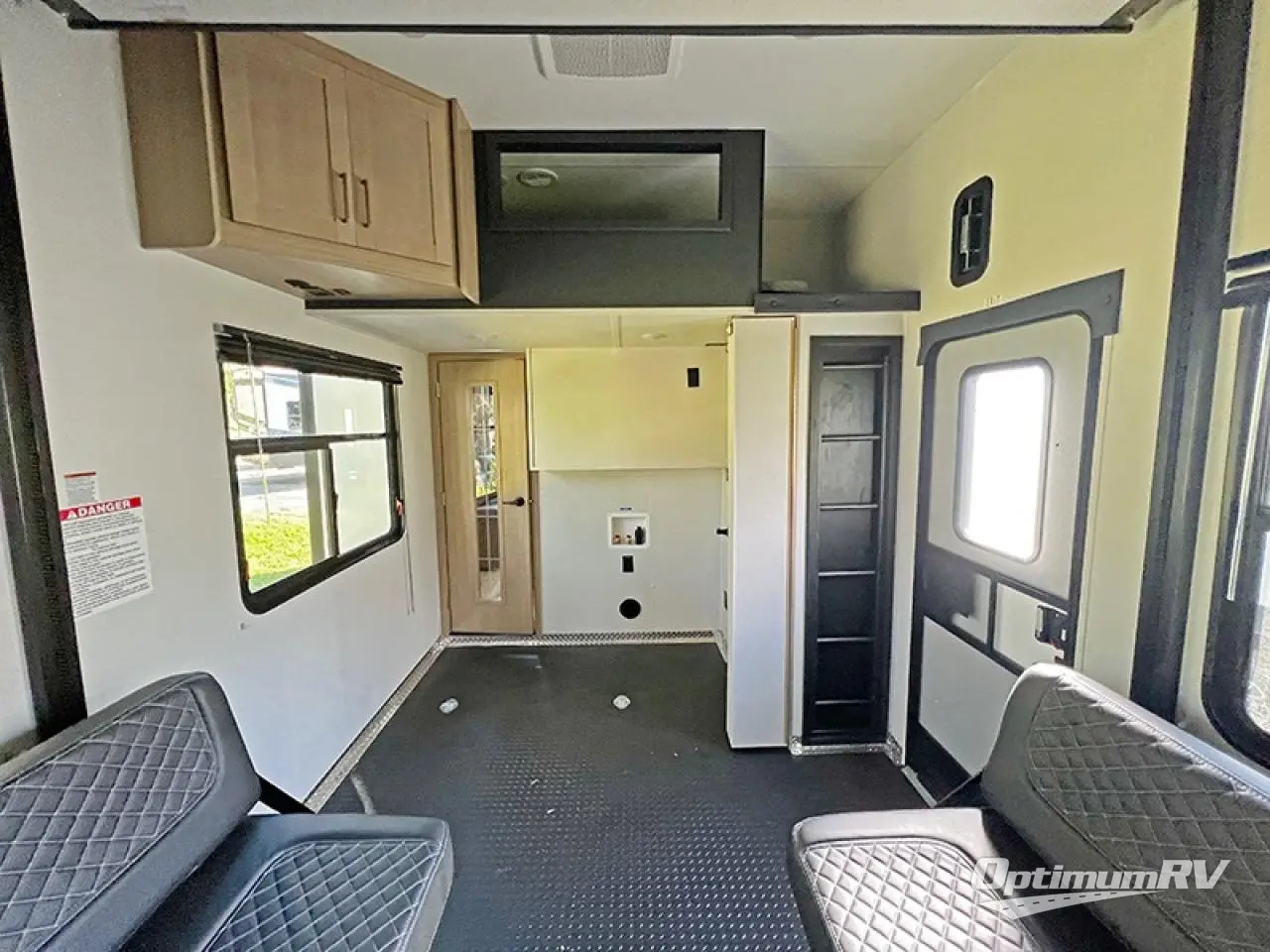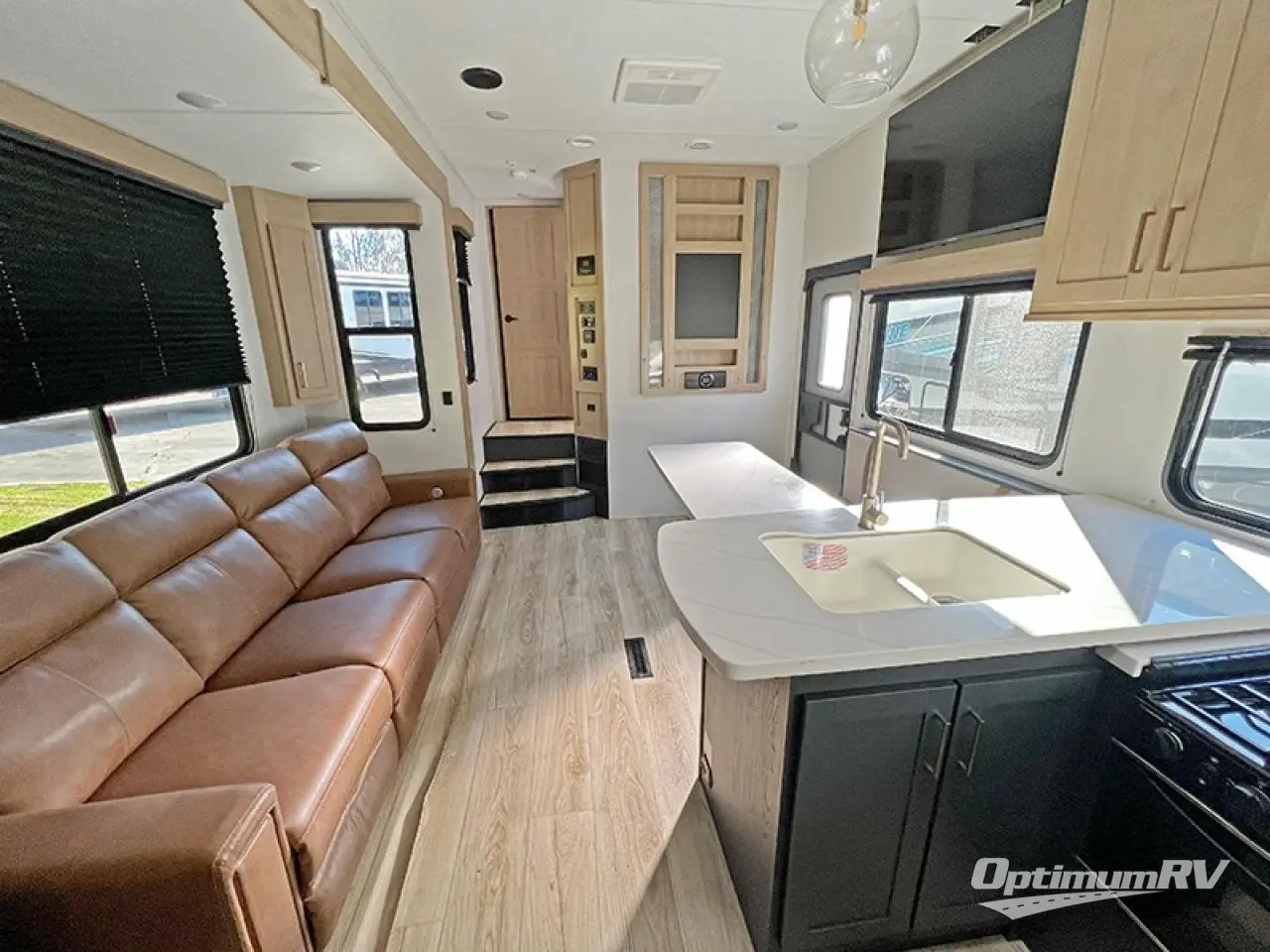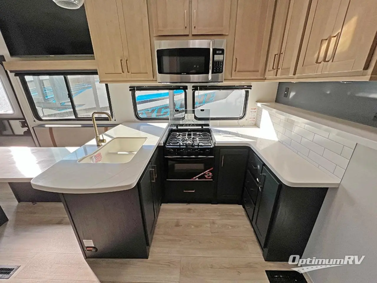 You will have everything you need for a comfortable camping trip in this toy hauler! The 13' garage area has a loft above a half bathroom with a folding wall, an electric queen bed with an optional split bench seating below it, and one of the dual entry doors to the unit. The chef can prepare their best home cooked meals either indoors with the three burner cooktop or head to the outdoor Griddle & Go, and the outdoor sink will allow them to wash up before starting dinner. Freshen up in the dual entry bathroom with the spacious tub which has a skylight above to bring the outdoors inside and it leads directly into the front master suite which has a tilting king bed and a wardrobe/closet slide to keep your clothes looking their best!