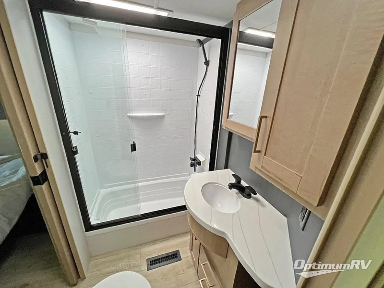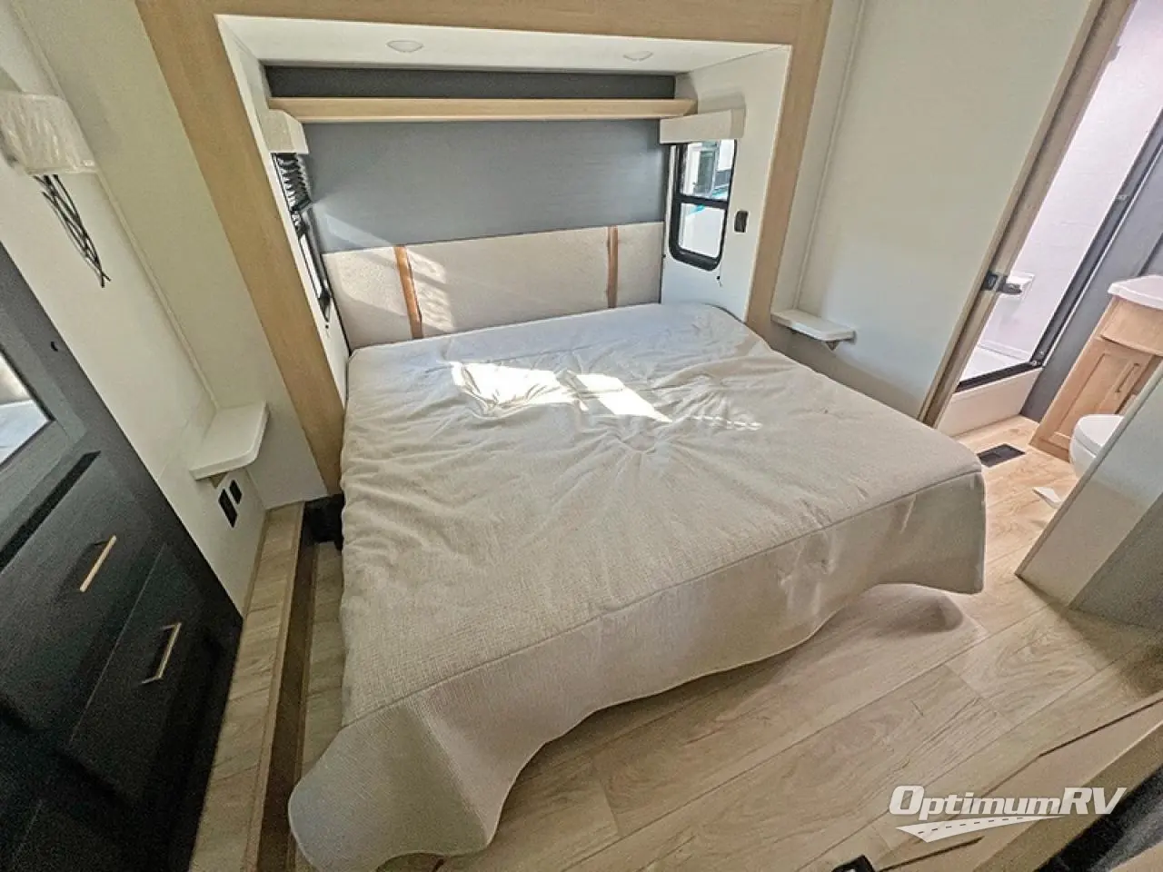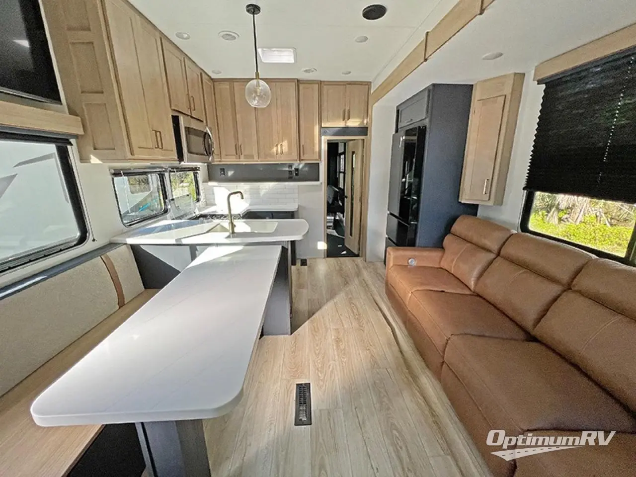 You will have everything you need for a comfortable camping trip in this toy hauler! The 13' garage area has a loft above a half bathroom with a folding wall, an electric queen bed with an optional split bench seating below it, and one of the dual entry doors to the unit. The chef can prepare their best home cooked meals either indoors with the three burner cooktop or head to the outdoor Griddle & Go, and the outdoor sink will allow them to wash up before starting dinner. Freshen up in the dual entry bathroom with the spacious tub which has a skylight above to bring the outdoors inside and it leads directly into the front master suite which has a tilting king bed and a wardrobe/closet slide to keep your clothes looking their best!