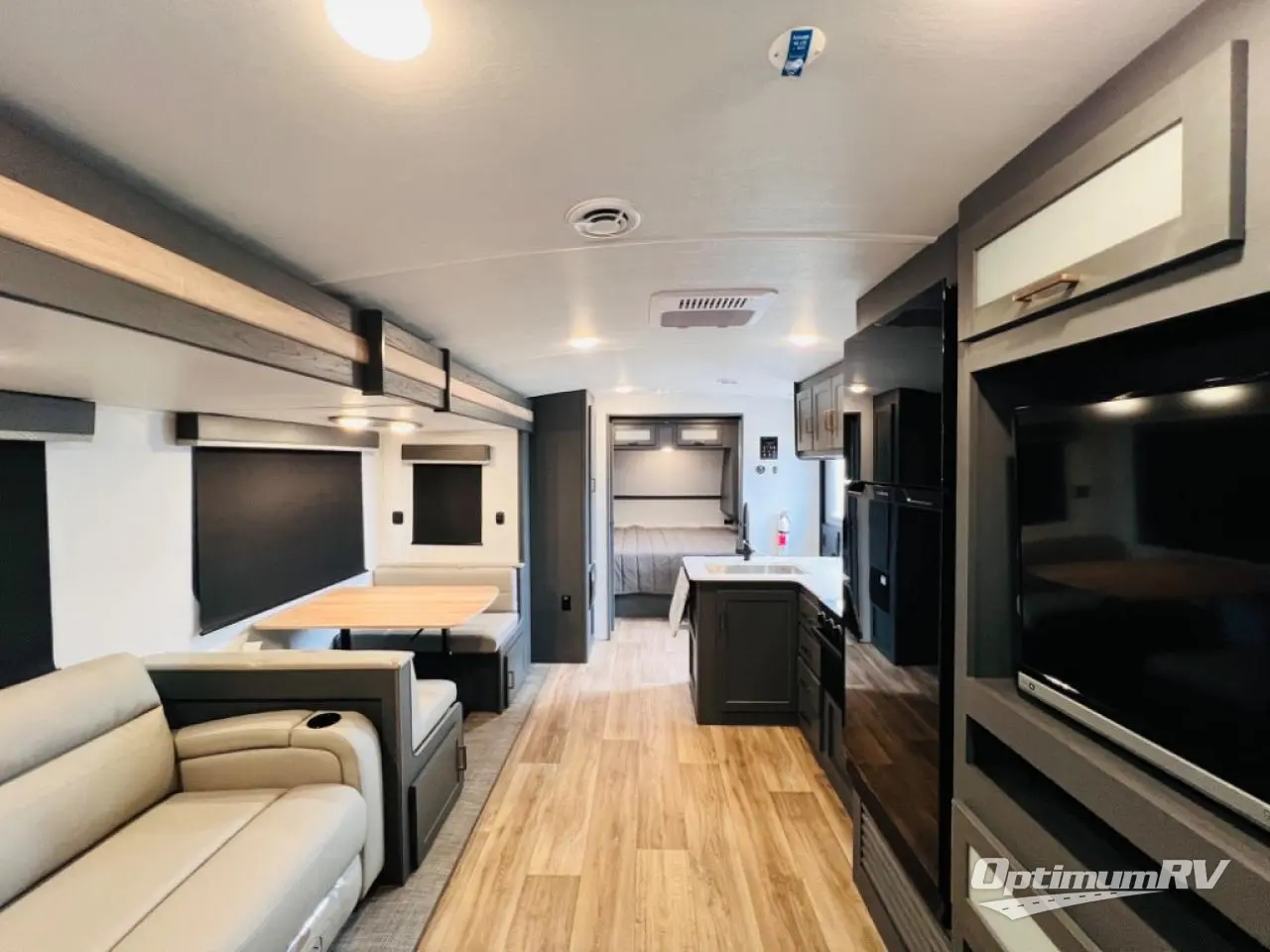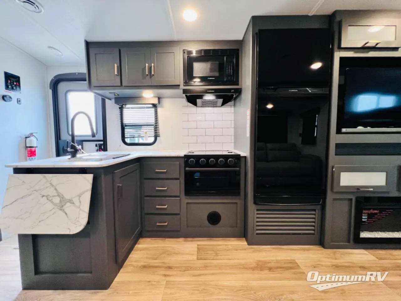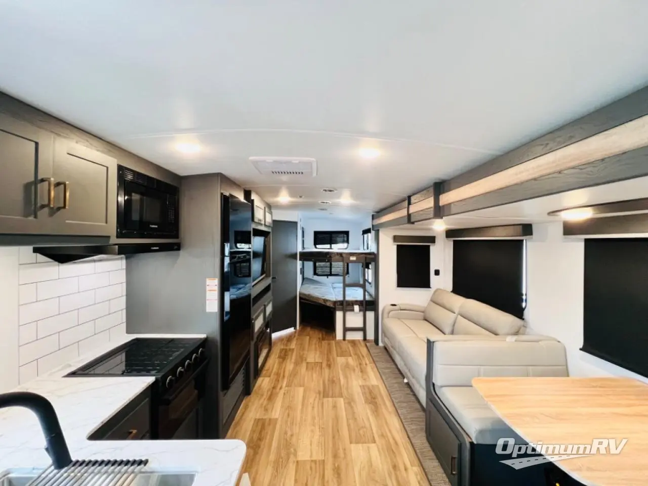 Indoor full kitchen amenities, an outside kitchen, an exterior and interior entry into the full bathroom and a space saving sliding door into the front bedroom are a few reasons you will love this trailer that accommodates nine at night. Yet the double-size bunks with a privacy curtain and ladder, plus the slide out with a tri-fold sofa and Do-More dinette might be the reason you choose this RV. The cook will love the Furrion appliances, the 10 cu. ft. 12V refrigerator and the single basin stainless steel sink to make meals for everyone, plus the outside kitchen gives them more choices. And you can sleep like a queen in the bedroom which also includes dual wardrobes and a laundry chute.