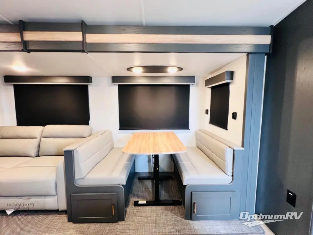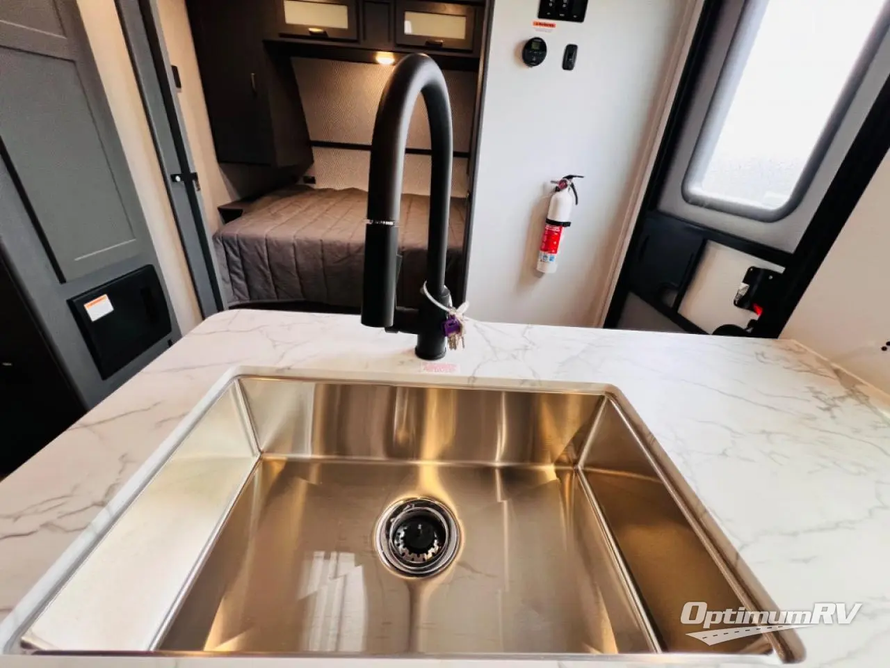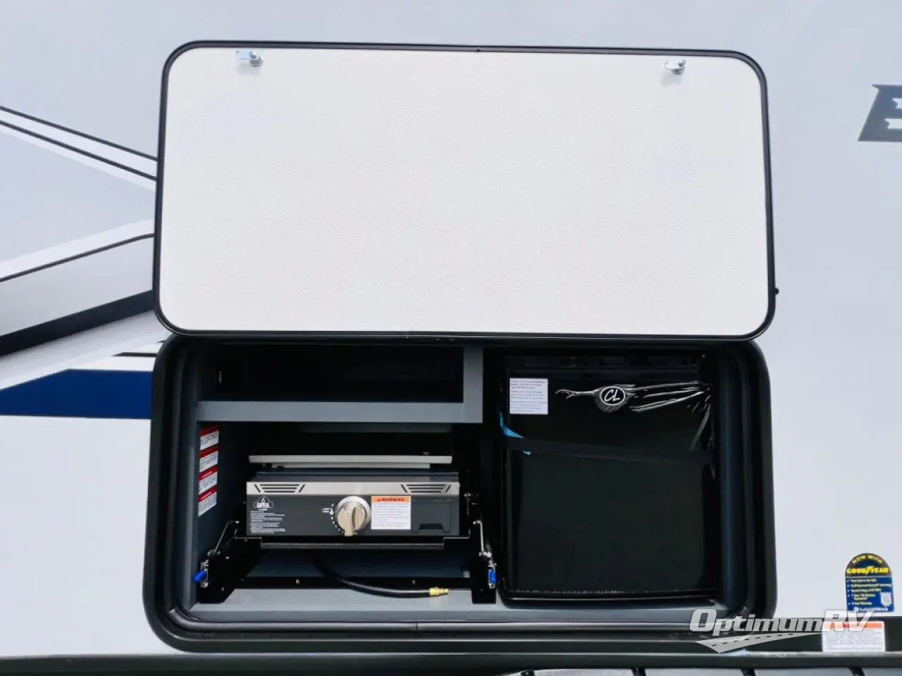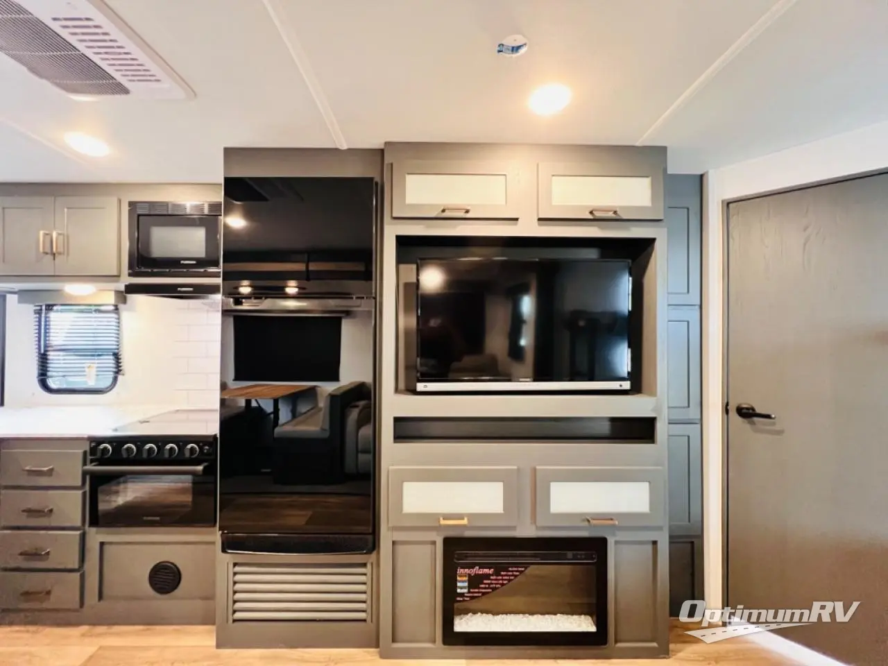 Indoor full kitchen amenities, an outside kitchen, an exterior and interior entry into the full bathroom and a space saving sliding door into the front bedroom are a few reasons you will love this trailer that accommodates nine at night. Yet the double-size bunks with a privacy curtain and ladder, plus the slide out with a tri-fold sofa and Do-More dinette might be the reason you choose this RV. The cook will love the Furrion appliances, the 10 cu. ft. 12V refrigerator and the single basin stainless steel sink to make meals for everyone, plus the outside kitchen gives them more choices. And you can sleep like a queen in the bedroom which also includes dual wardrobes and a laundry chute.