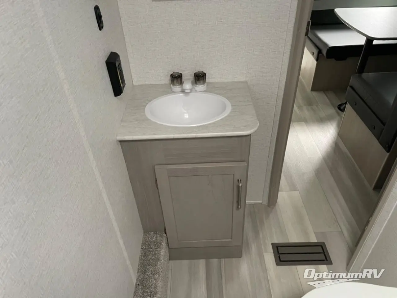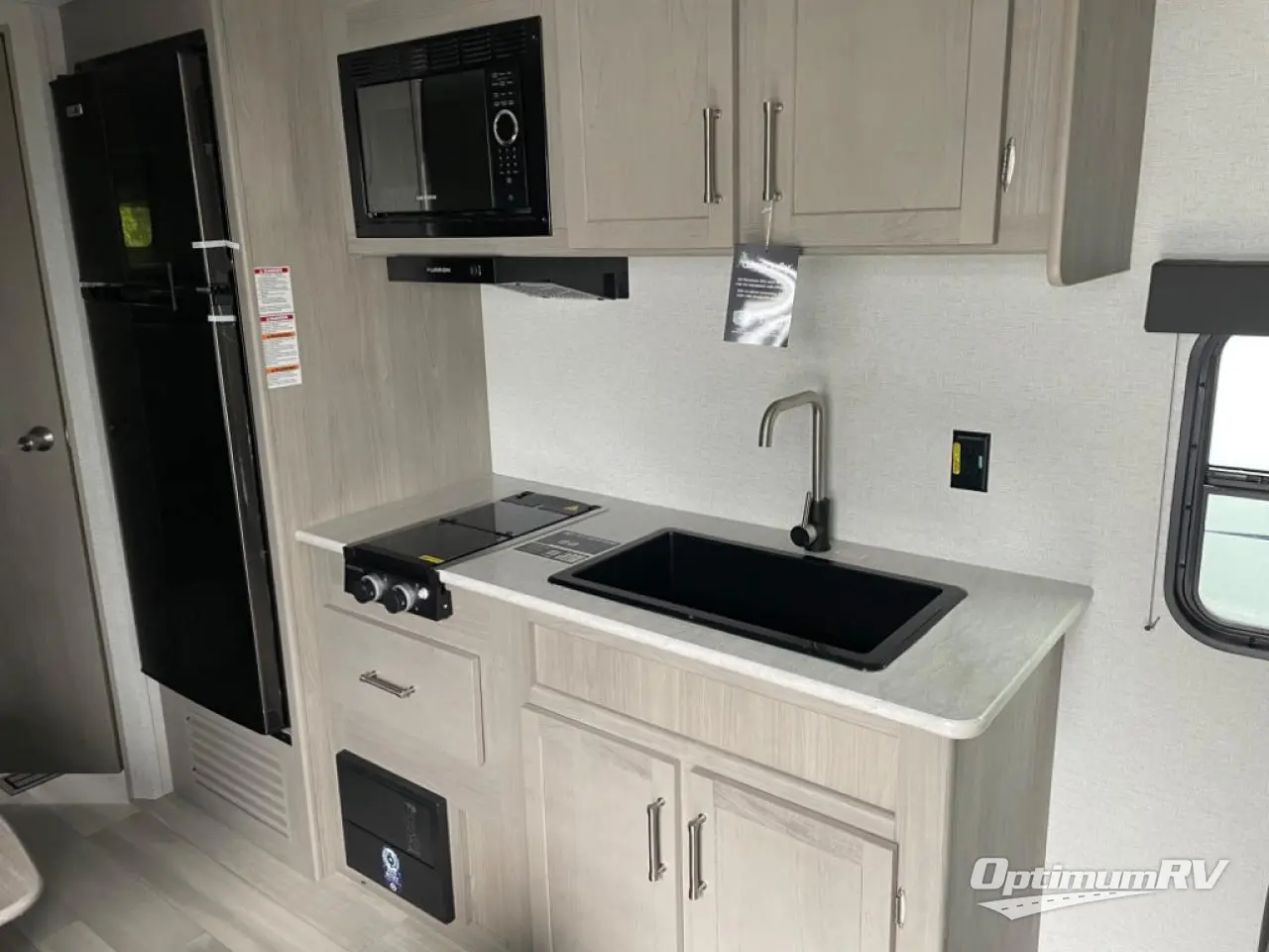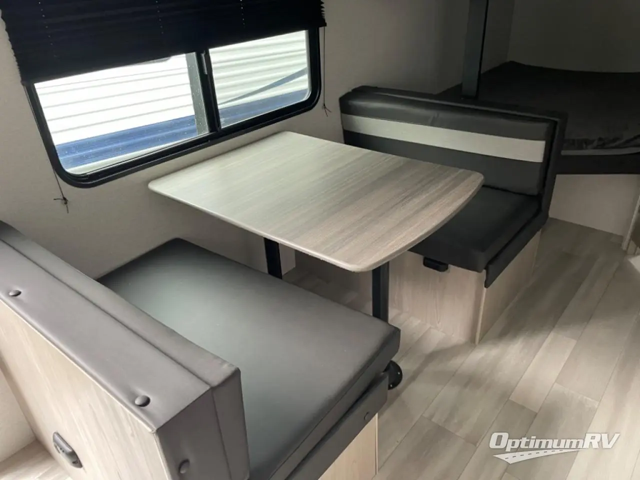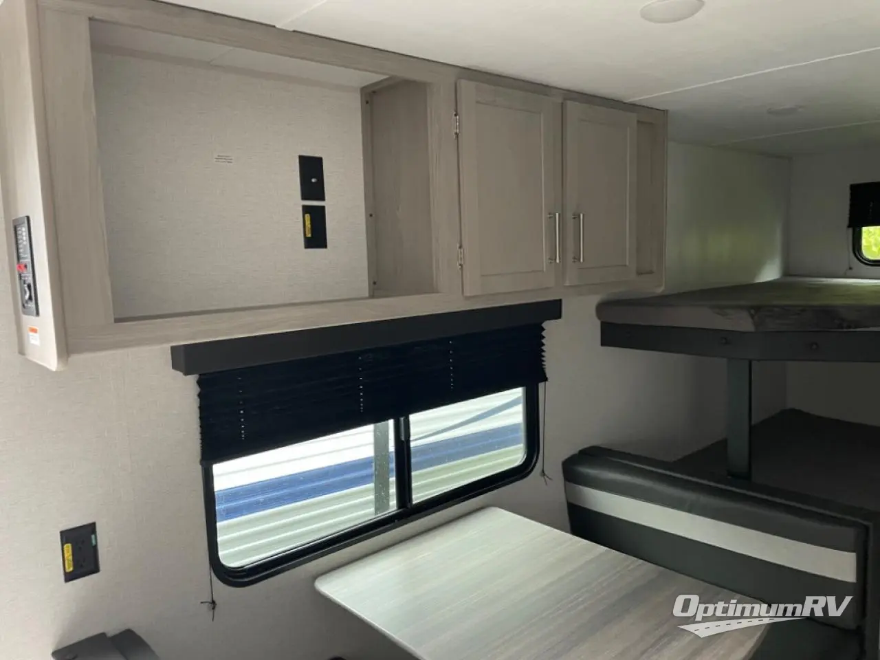 Bring the whole gang and explore with this bunkhouse travel trailer in tow! There is sleeping for up to 10 with double-size bunk beds, a queen bed up front, as well as a sofa and booth dinette that can accommodate more when reconfigured at night. You will easily be able to create meals to enjoy while camping inside with the two-burner range a 10 cu. ft. 12V refrigerator. Overhead storage is available above the stove and sink and along the opposite side. There is also a front pass-through for housing all of your outdoor gear, as well as additional outside storage beneath the bunk beds. The 12' power awning will also provide more living space and outdoor protection from the sun and/or rain.