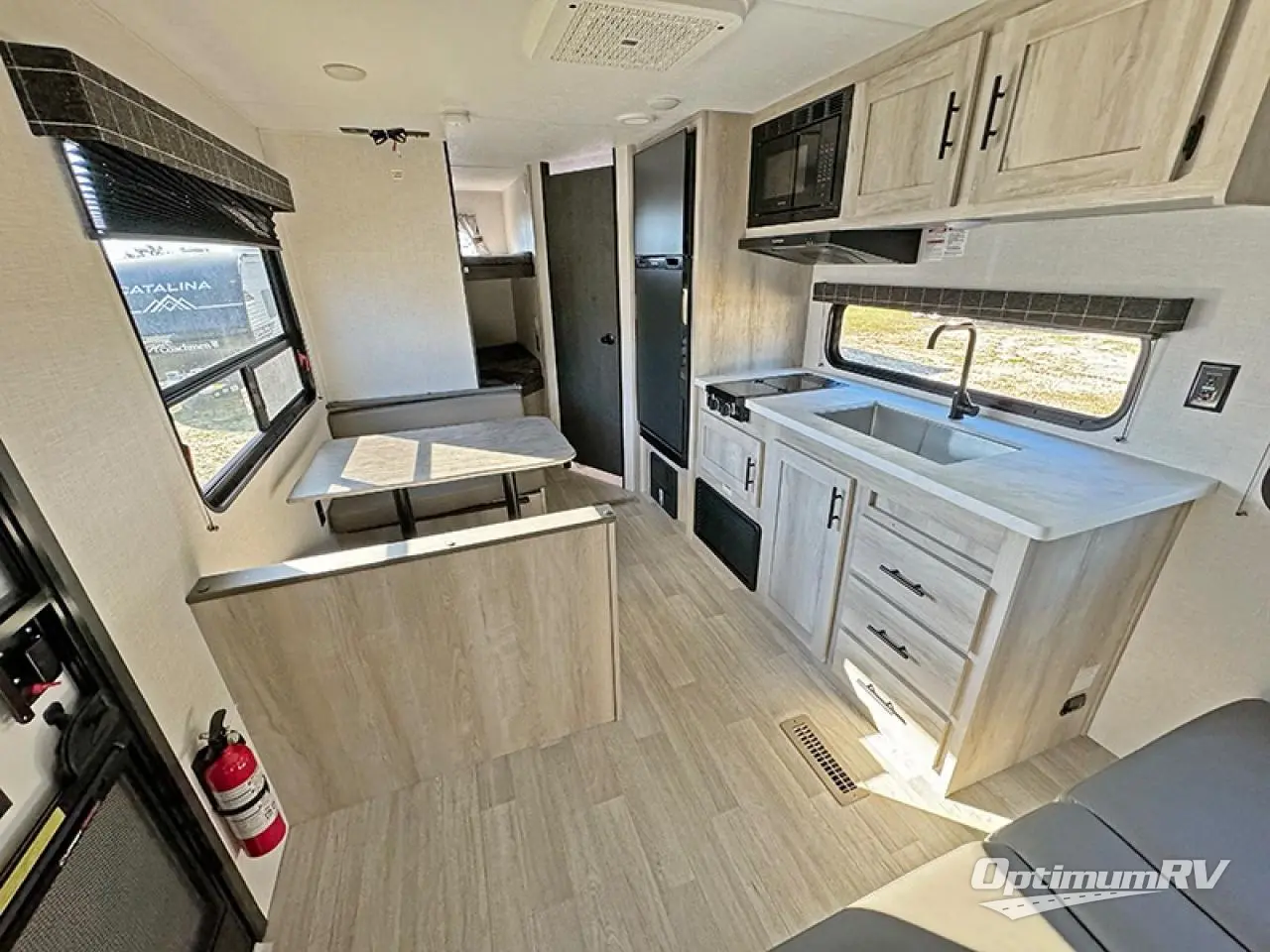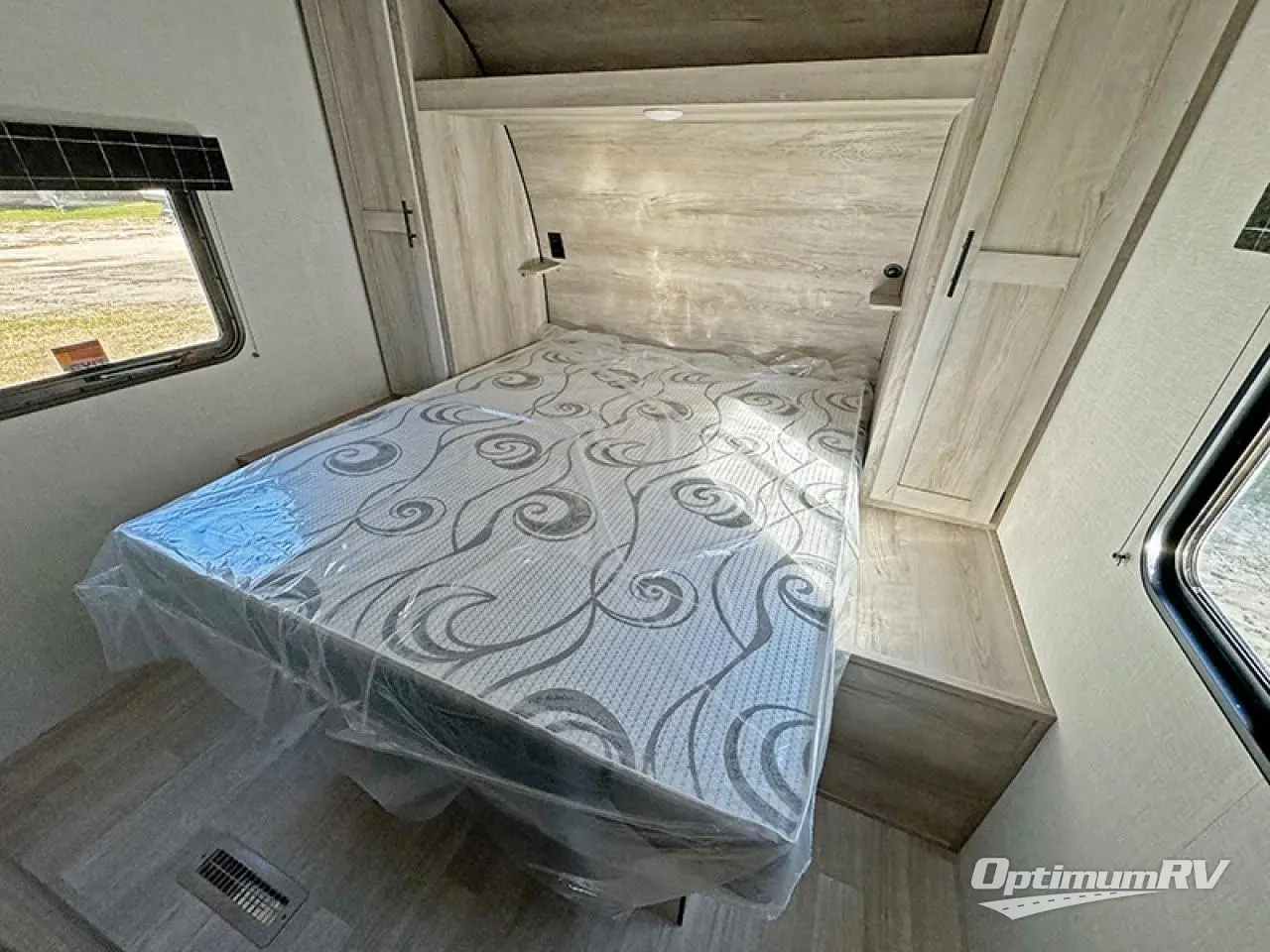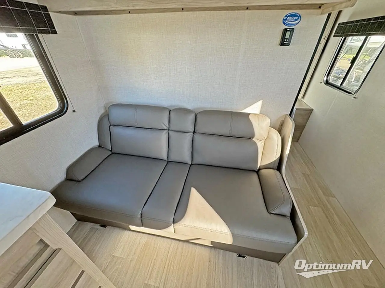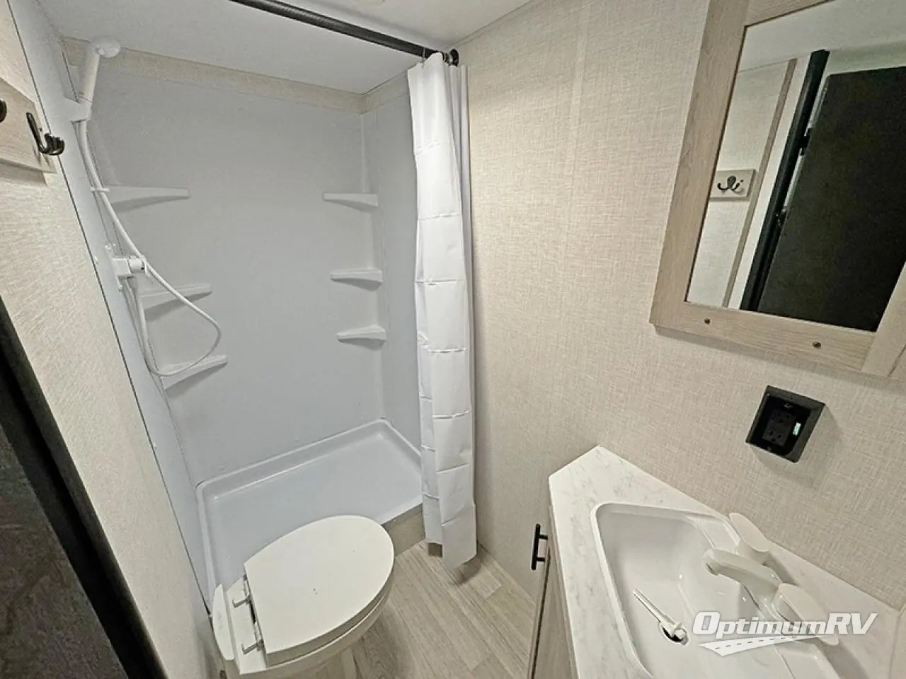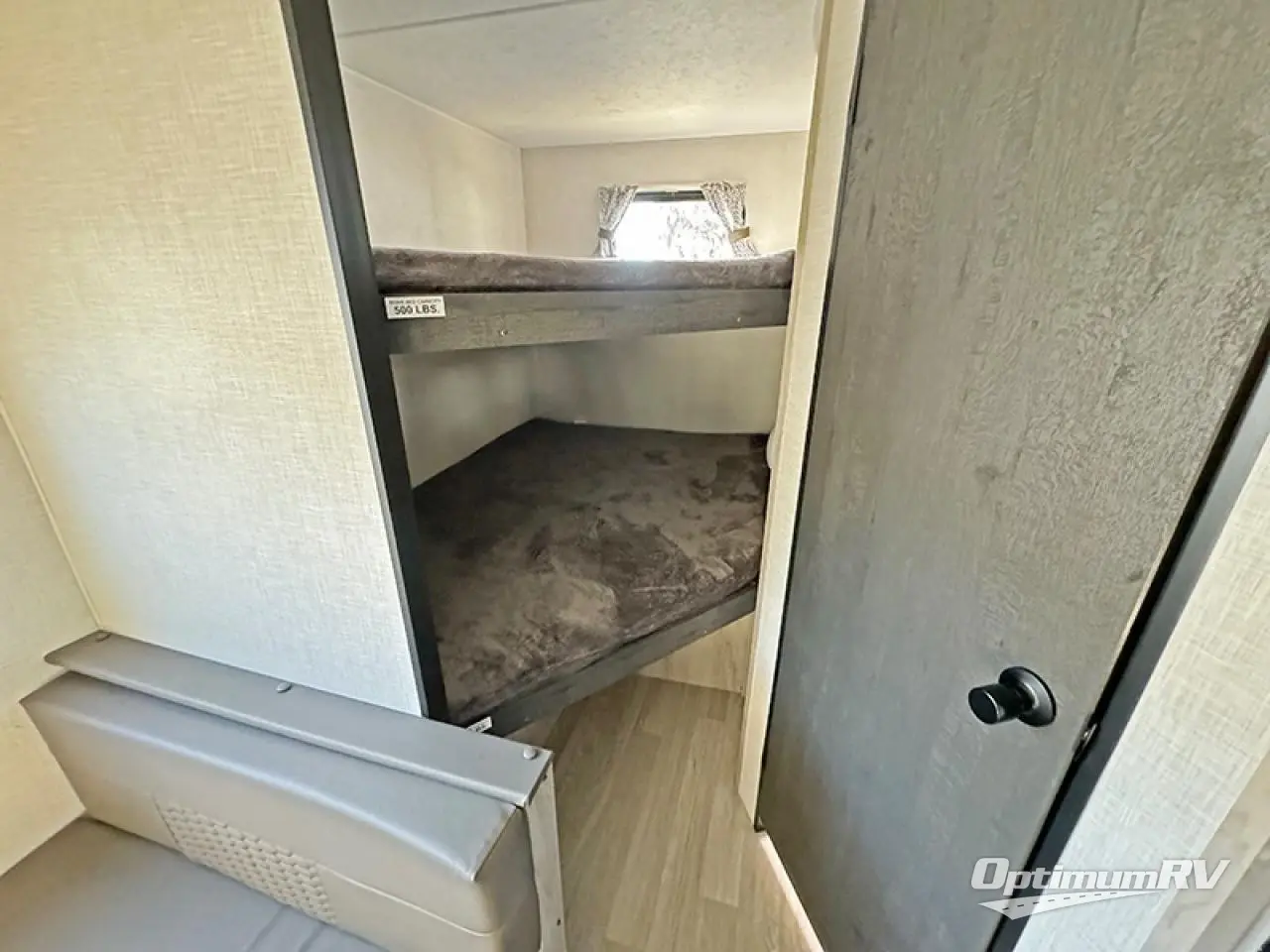 This travel trailer can comfortably sleep eight between the double-size bunks, the queen bed in the front bedroom, plus the booth dinette and jackknife sofa in the main living area. Everyone can freshen up each day in the full bath that includes a shower pan, foot flush toilet, and a sink. The chef of your group can make dinner on the two burner drop-in cooktop or in the microwave oven, and there is a 10 cu. ft. 12V refrigerator for perishables. This model also includes a TV mount if you want to add a television for movie nights, and there is an exterior pas-through storage for fishing poles, camp chairs, and more!