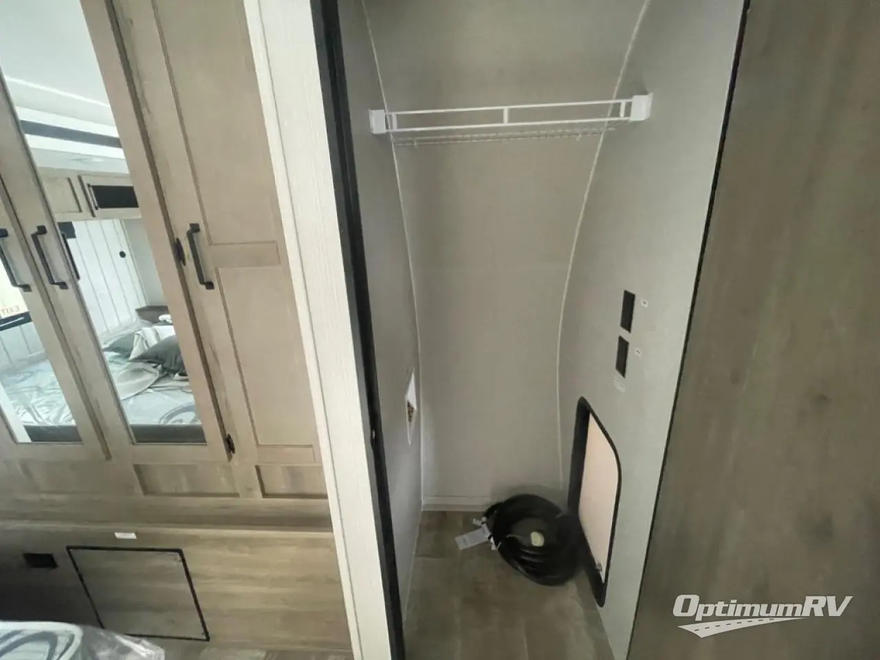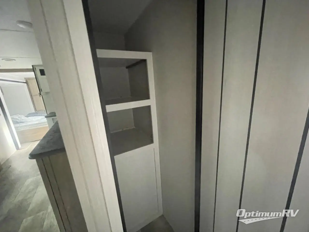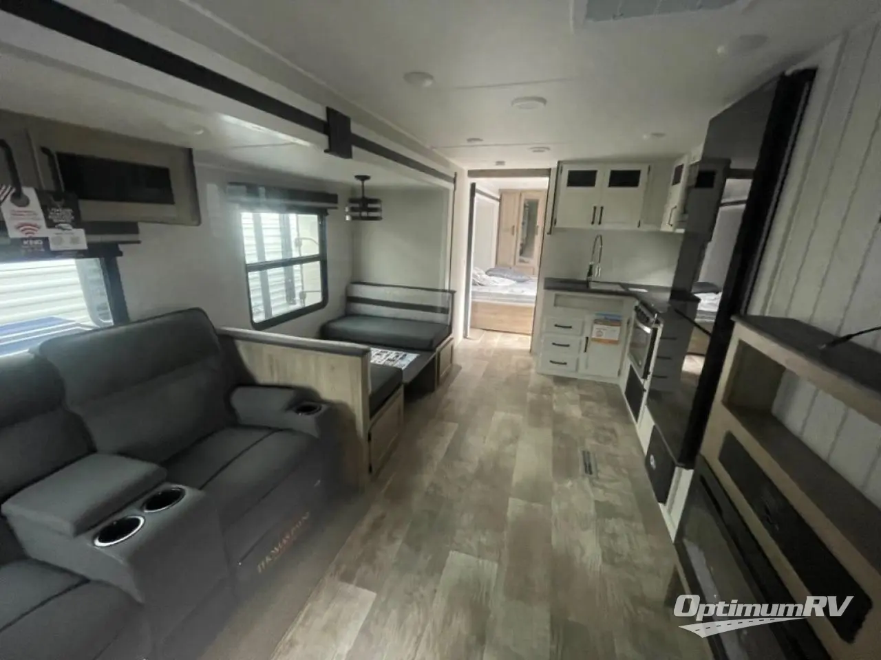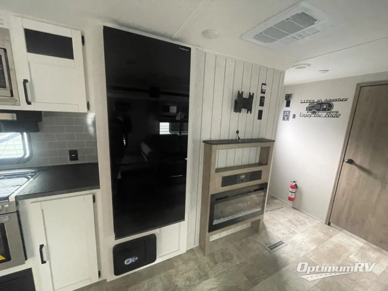 Head to the lake in this double slide out travel trailer that can sleep five each night. You will love having the front private bedroom all to yourselves that includes a queen bed slide out, a front wardrobe, a closet with washer and dryer prep, plus your own exterior entry door. Your guests can sleep on the sofa and booth dinette within the second slide out, and the full rear bath is tucked away for privacy. This model also includes an entryway closet/pantry for food storage and jackets, and you can add the optional fireplace across from the sofa for a more cozy space.