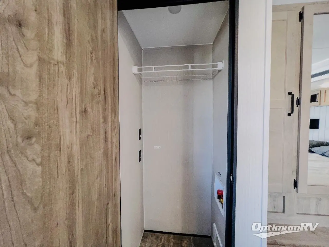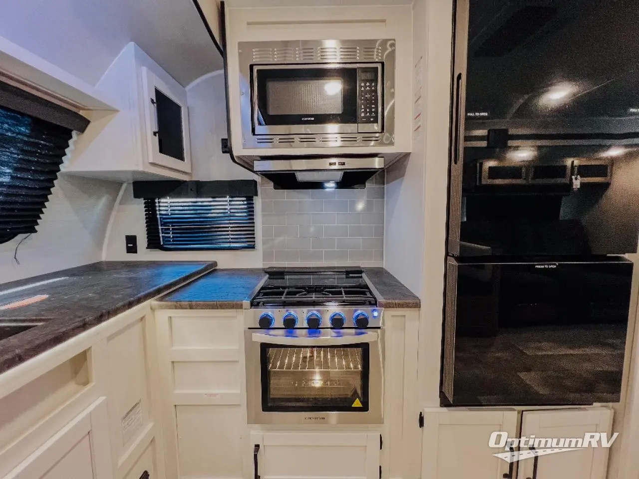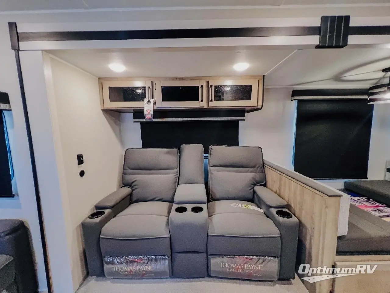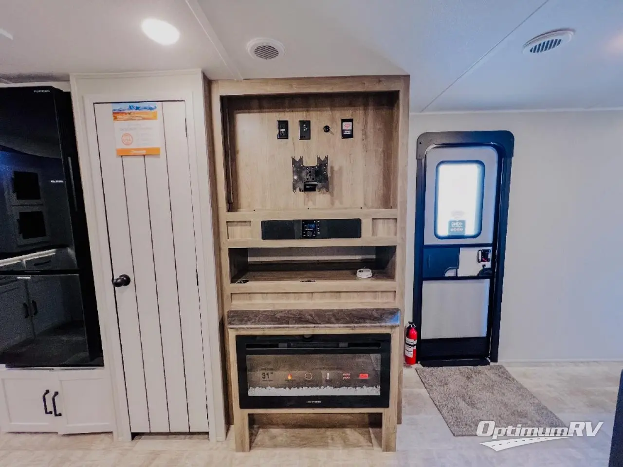 Experience a home away from home with this travel trailer! The front kitchen has everything you will need to prepare your best meals and you can enjoy them at the booth dinette. The rear private bedroom has a 72" x 80" king bed slide across from a dresser, a wardrobe, and a closet next to it that is prepped to add an optional washer and dryer. Freshen up in the full bathroom with the 34" x 34" radius shower and then enjoy a cup of coffee relaxing in one of the two recliners or on the sofa! Choose the optional outside kitchen with a griddle and refrigerator for even more convenience!