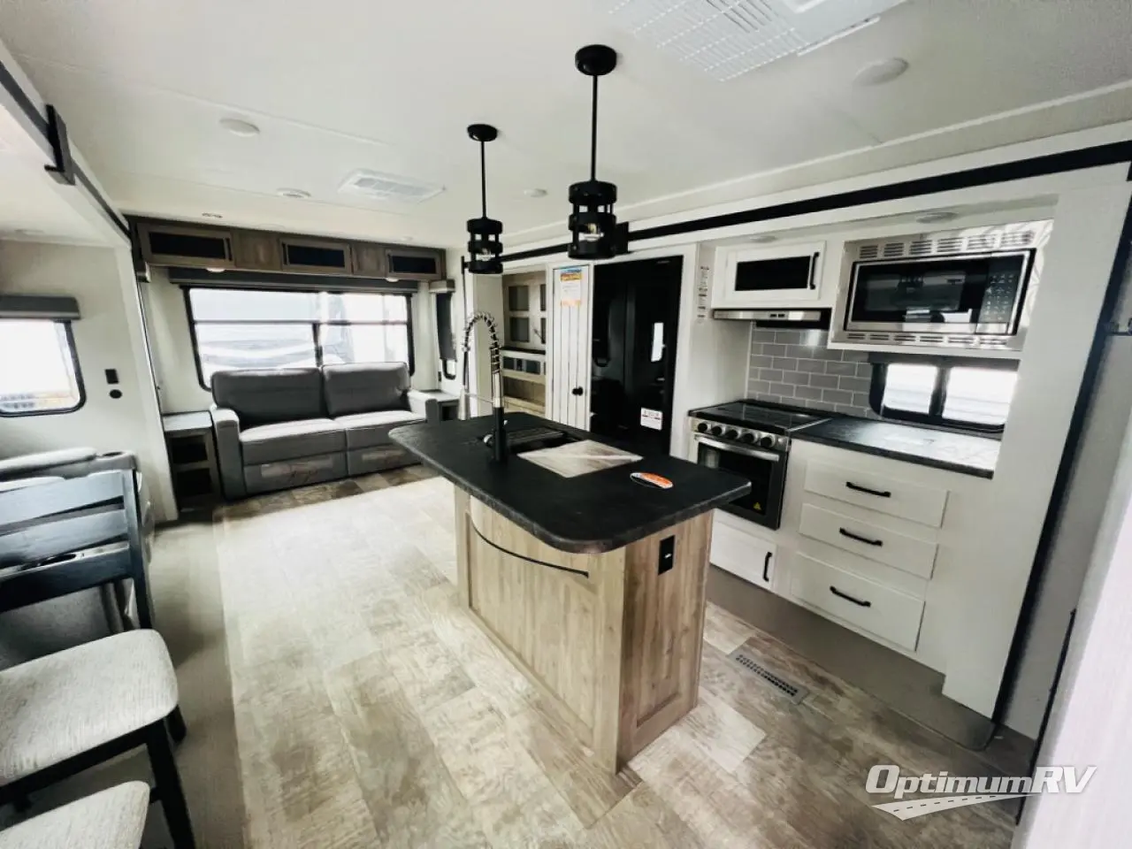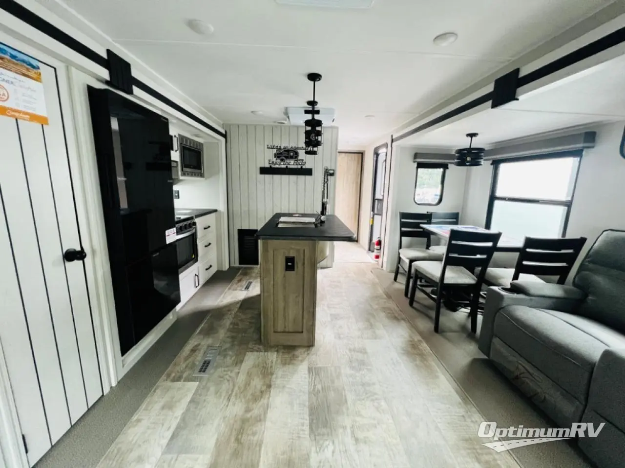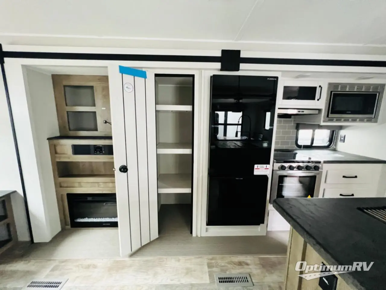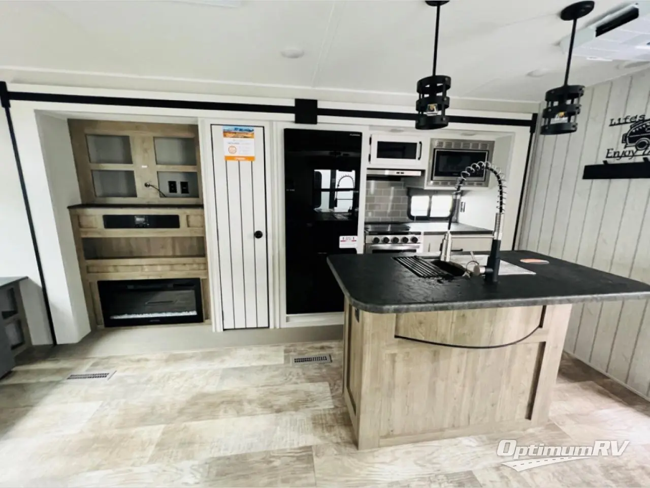You're going to feel right at home in this travel trailer! The front private bedroom has a queen bed slide for a good night's rest, a dresser and front closet for your clothes, and another closet that is prepped to add an optional washer and dryer. Freshen up each morning in the full bathroom with the 32" x 40" shower with a seat and then head to the kitchen to fry up some eggs on the three burner cooktop. You will also appreciate having a kitchen island for easier meal prep and a walk-in pantry to easily see your canned goods and snacks. The booth dinette offers a comfortable place to dine, play, and even sleep once converted. What better way to wind down your nights than to relax on either the rear sofa or in one of the two recliners across from the entertainment center with the option to add a fireplace!