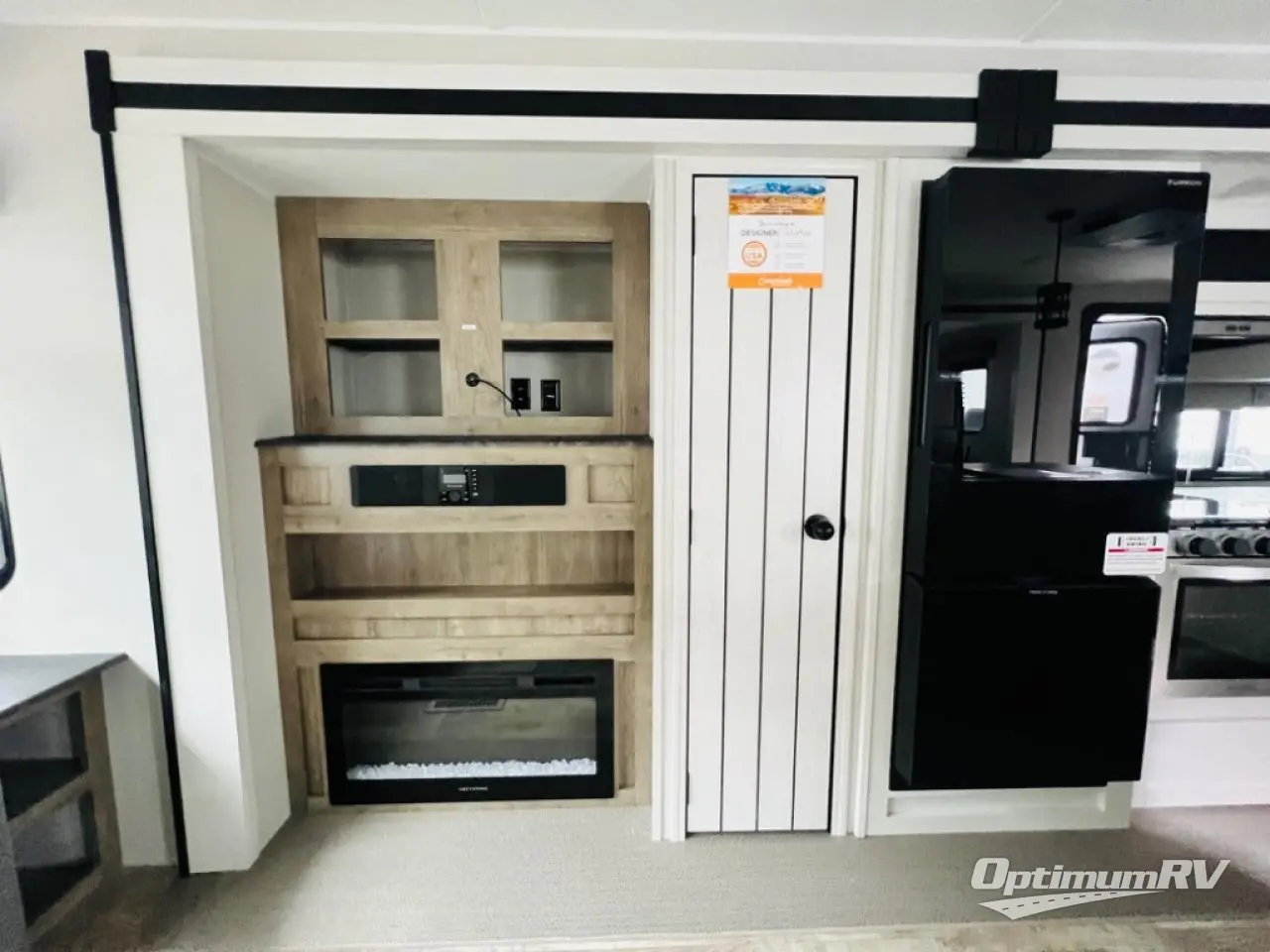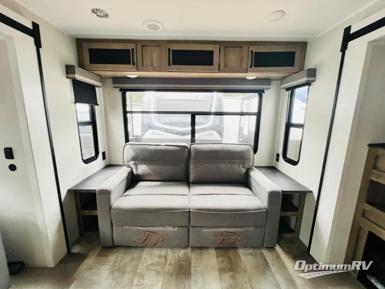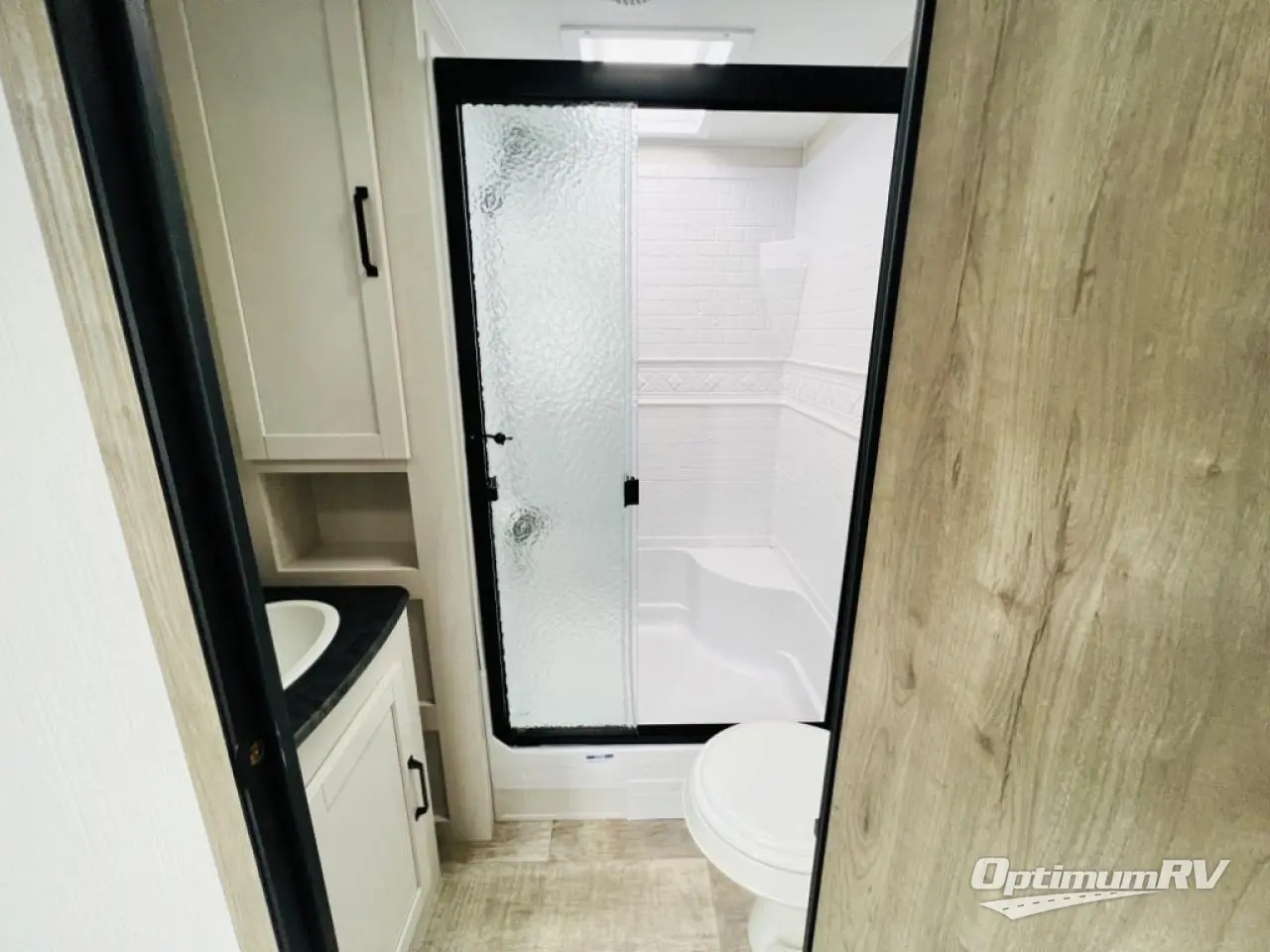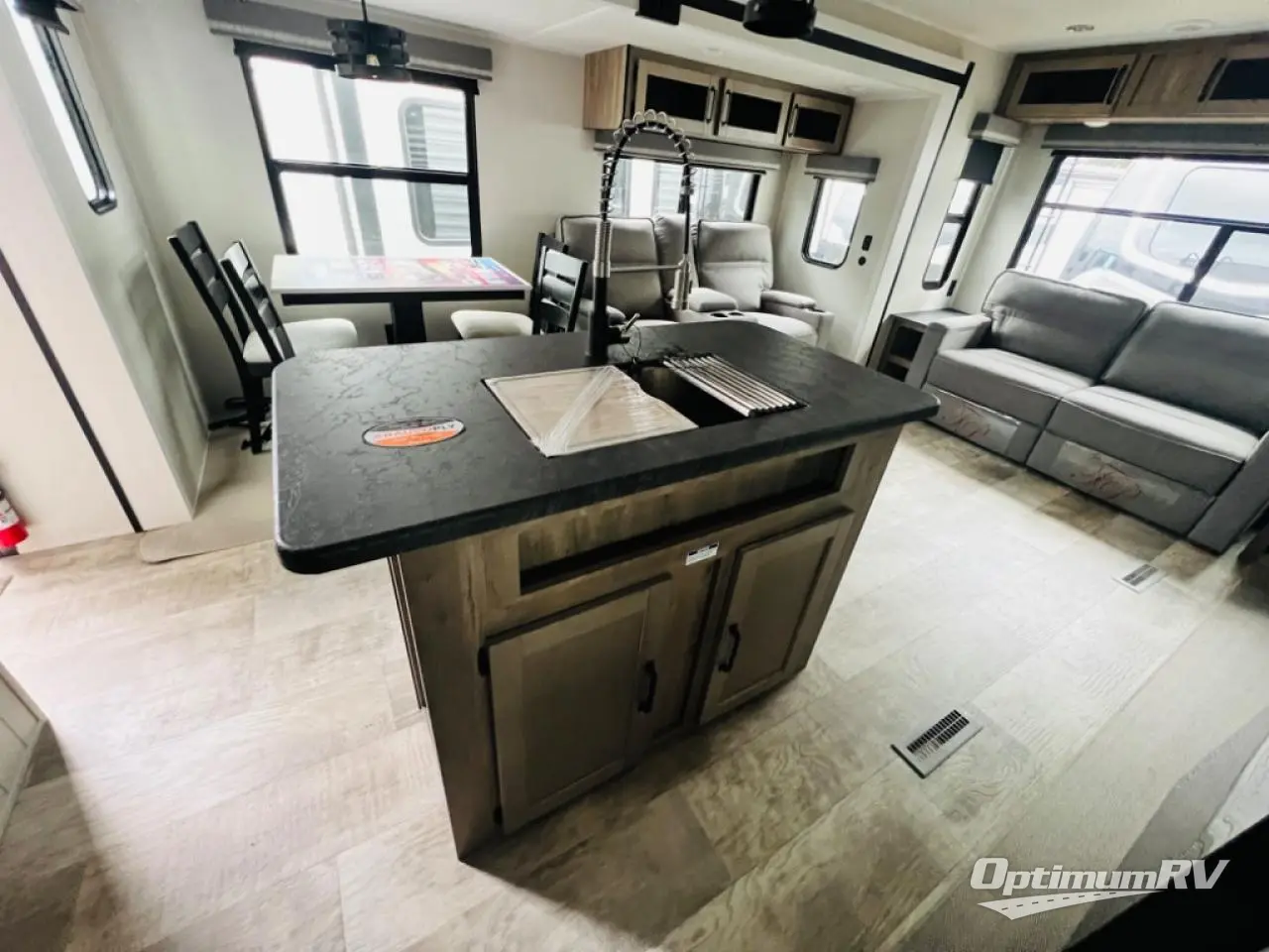 You're going to feel right at home in this travel trailer! The front private bedroom has a queen bed slide for a good night's rest, a dresser and front closet for your clothes, and another closet that is prepped to add an optional washer and dryer. Freshen up each morning in the full bathroom with the 32" x 40" shower with a seat and then head to the kitchen to fry up some eggs on the three burner cooktop. You will also appreciate having a kitchen island for easier meal prep and a walk-in pantry to easily see your canned goods and snacks. The booth dinette offers a comfortable place to dine, play, and even sleep once converted. What better way to wind down your nights than to relax on either the rear sofa or in one of the two recliners across from the entertainment center with the option to add a fireplace!